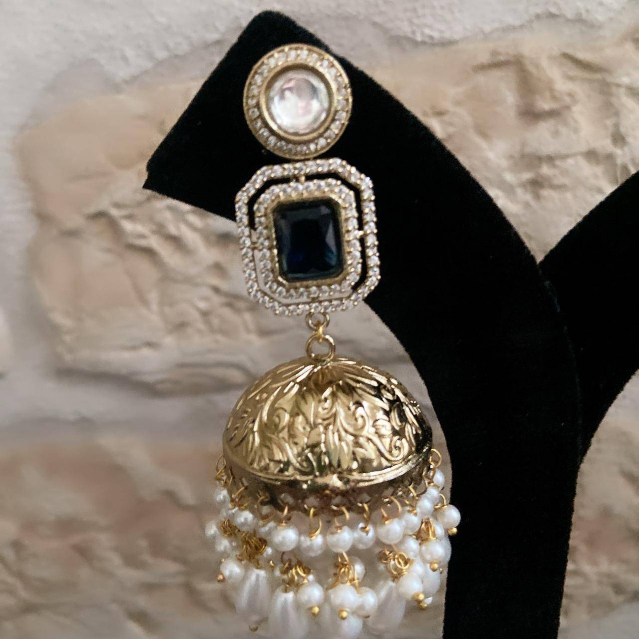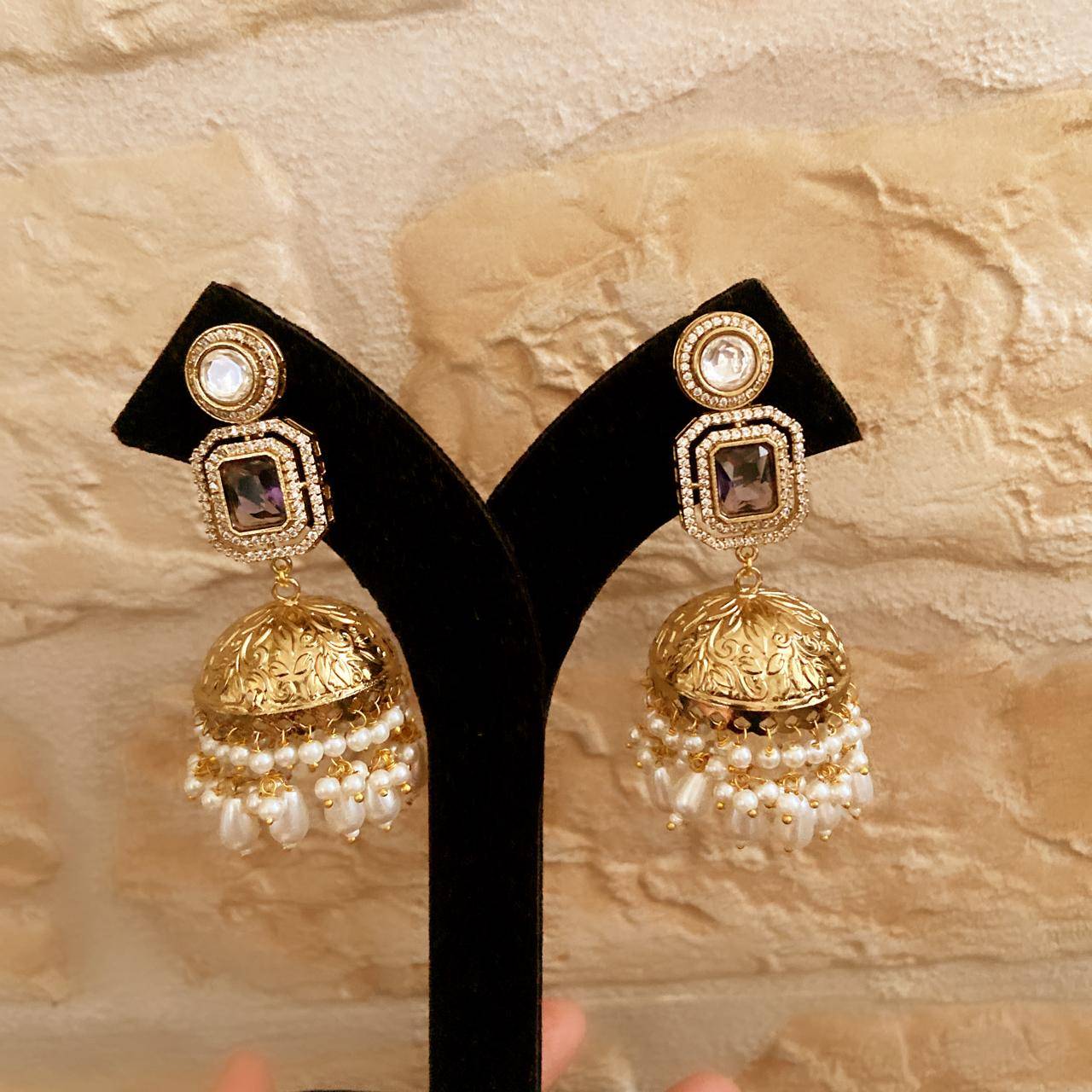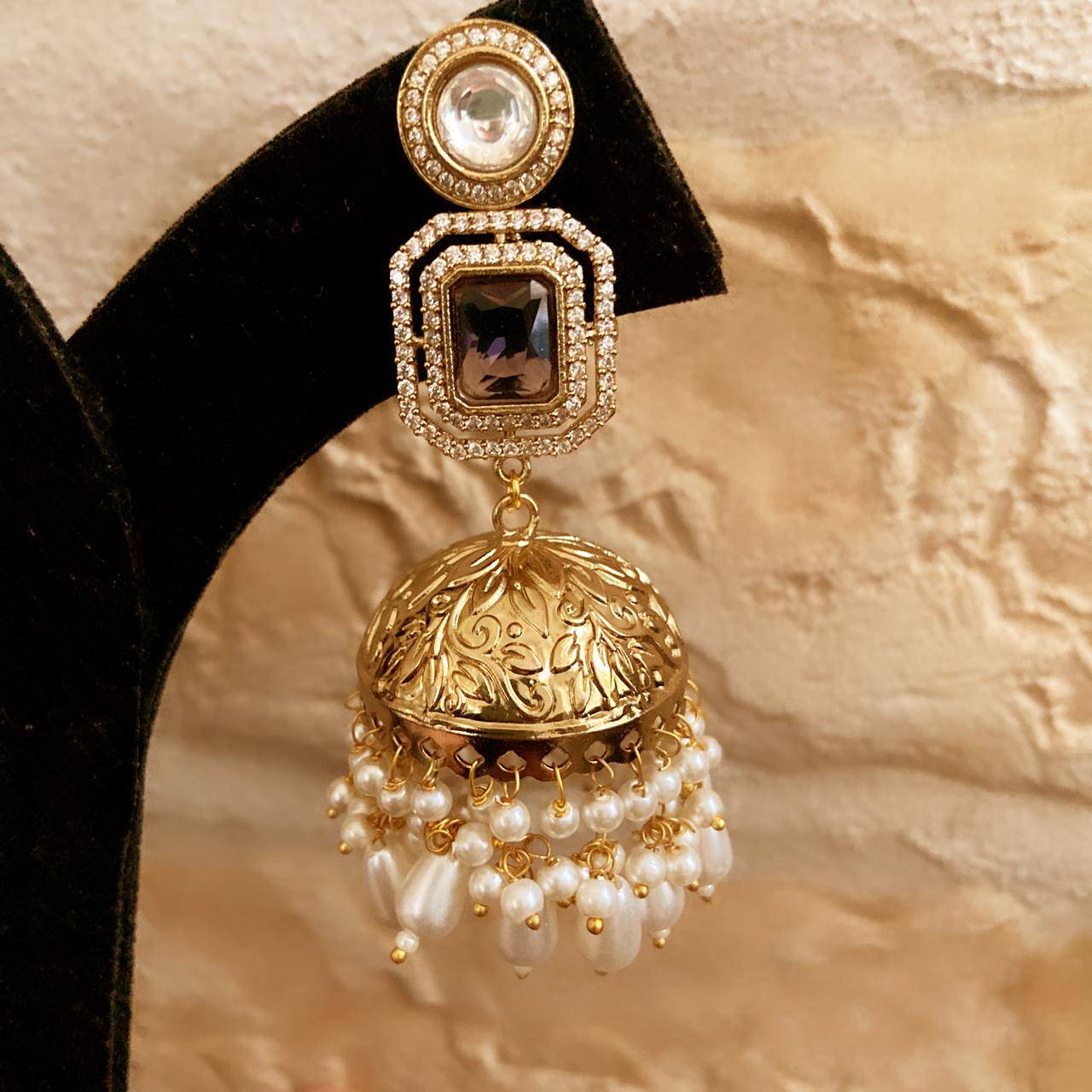 Elevate your ethnic look with these Kundan Pearl Jhumkas. Featuring a stunning dual-tier design, the upper portion showcases a dazzling square-cut stone set in a sparkling Kundan and cubic zirconia frame, topped with a luminous round white stone. The lower dome is intricately crafted in antique gold finish with delicate floral engravings, adorned with cascading layers of ivory pearl beads and teardrop-shaped pearls for a graceful sway. Perfect for weddings, festive occasions, and traditional celebrations, these jhumkas blend regal charm with timeless craftsmanship.