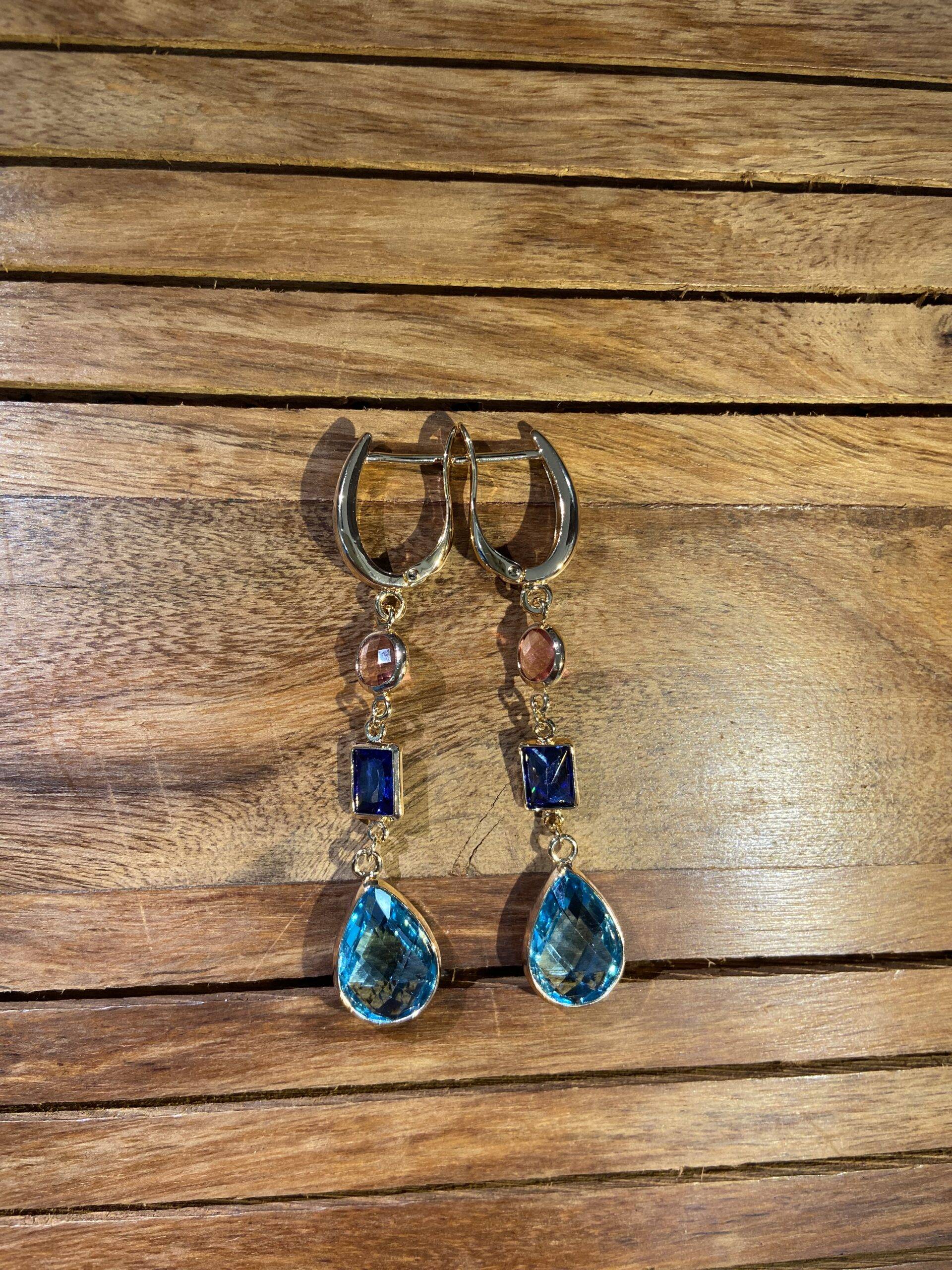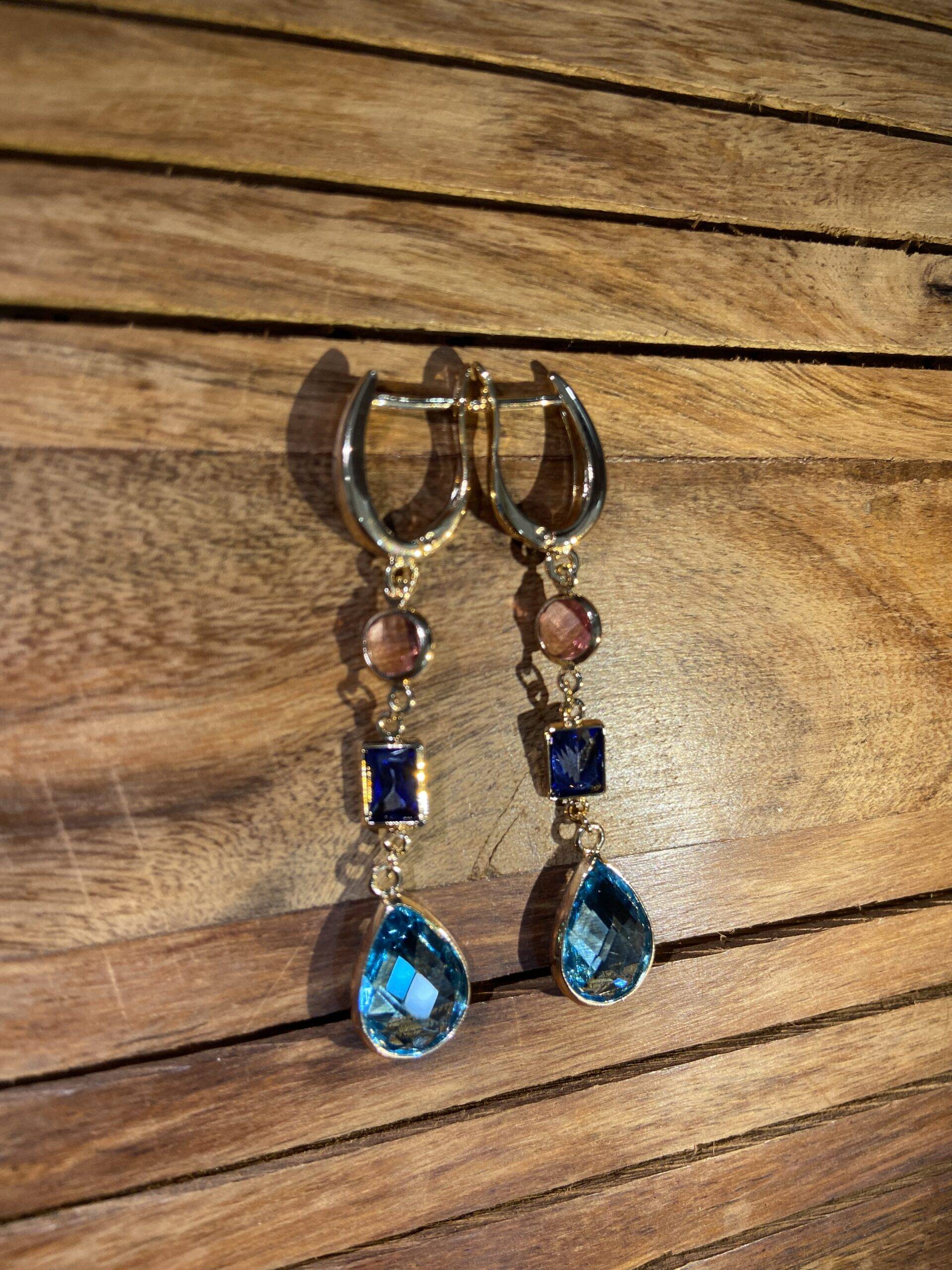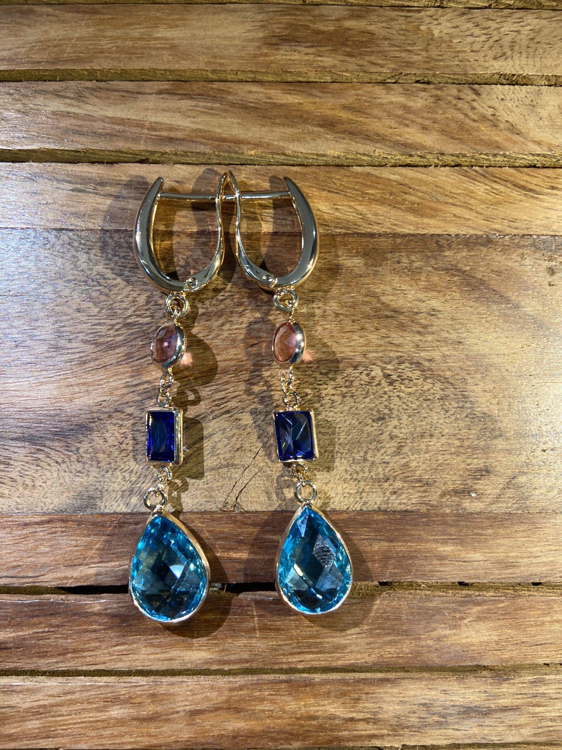 Discover the essence of the sea with Aqua Nova Dangle Earrings. These high-quality imitation gold earrings feature a crescent-shaped hoop linked to a succession of three captivating stones: the soft shimmer of a blush pink gem, the deep midnight blue square, and the brilliant sparkle of a teardrop-shaped azure drop. Ideal for evening occasions or formal gatherings, their balanced design and seaside palette evoke sophistication and tranquility.