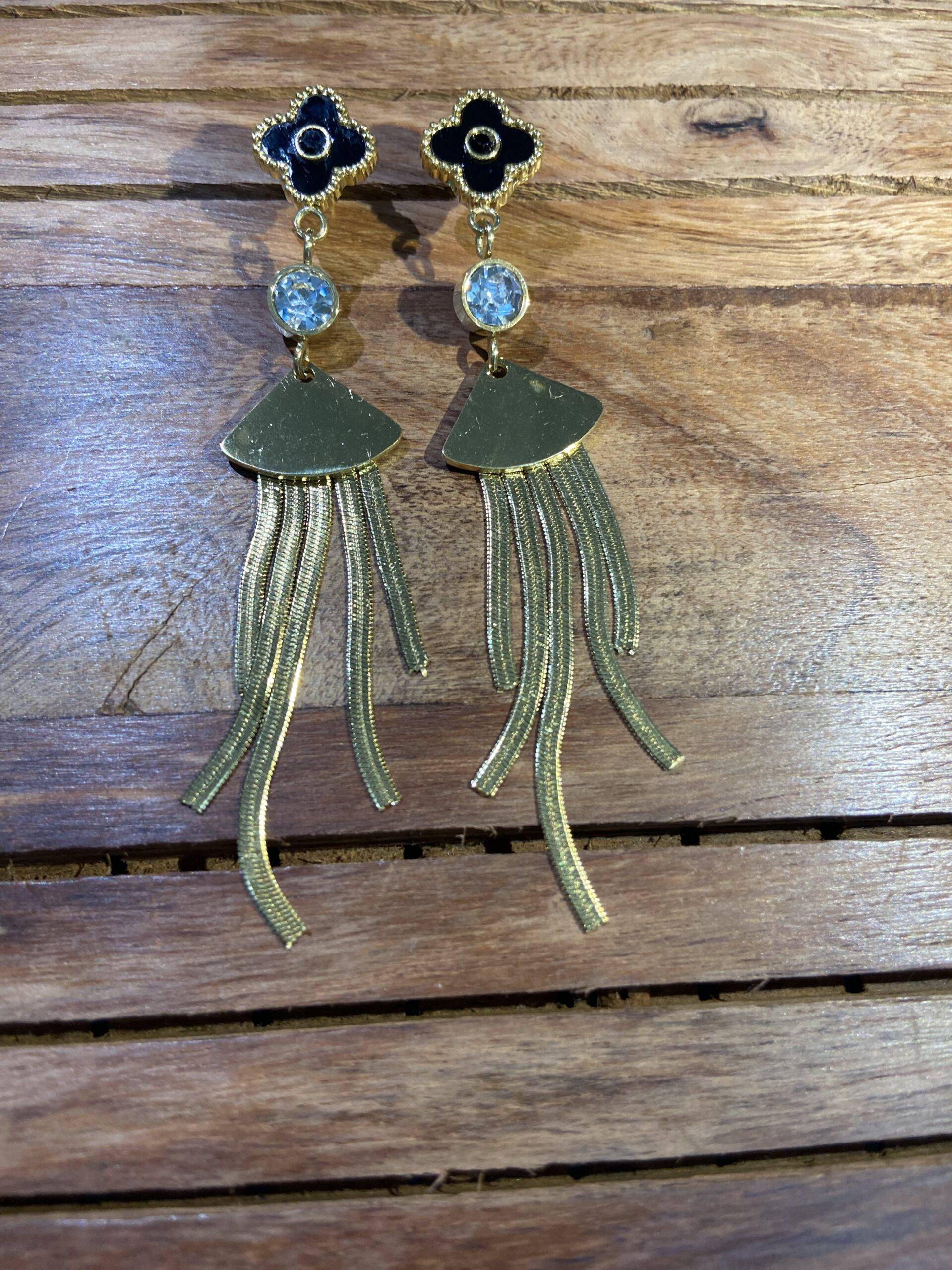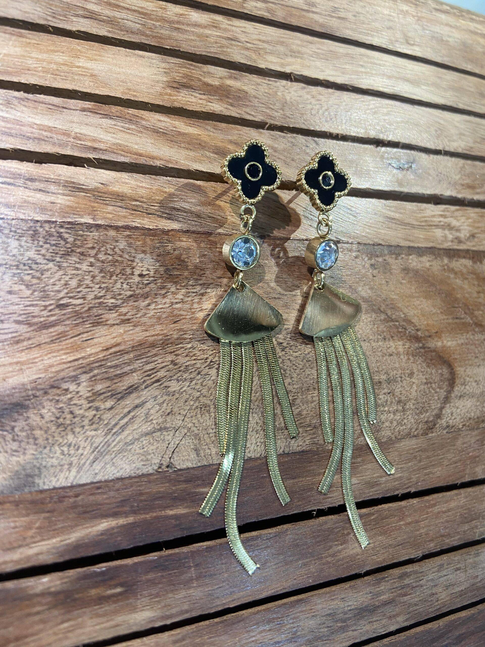 Illuminate your look with Azura Fringe Dangles from Stile Sovrano. These earrings feature a deep navy blue flower with a twinkling black center, a sparkling clear stone, and an elegant cascade of gold-tone fringe. Designed to bring a touch of celestial glamour to any ensemble, their flowing tassels and night-sky inspired allure create a statement of both sophistication and wonder.