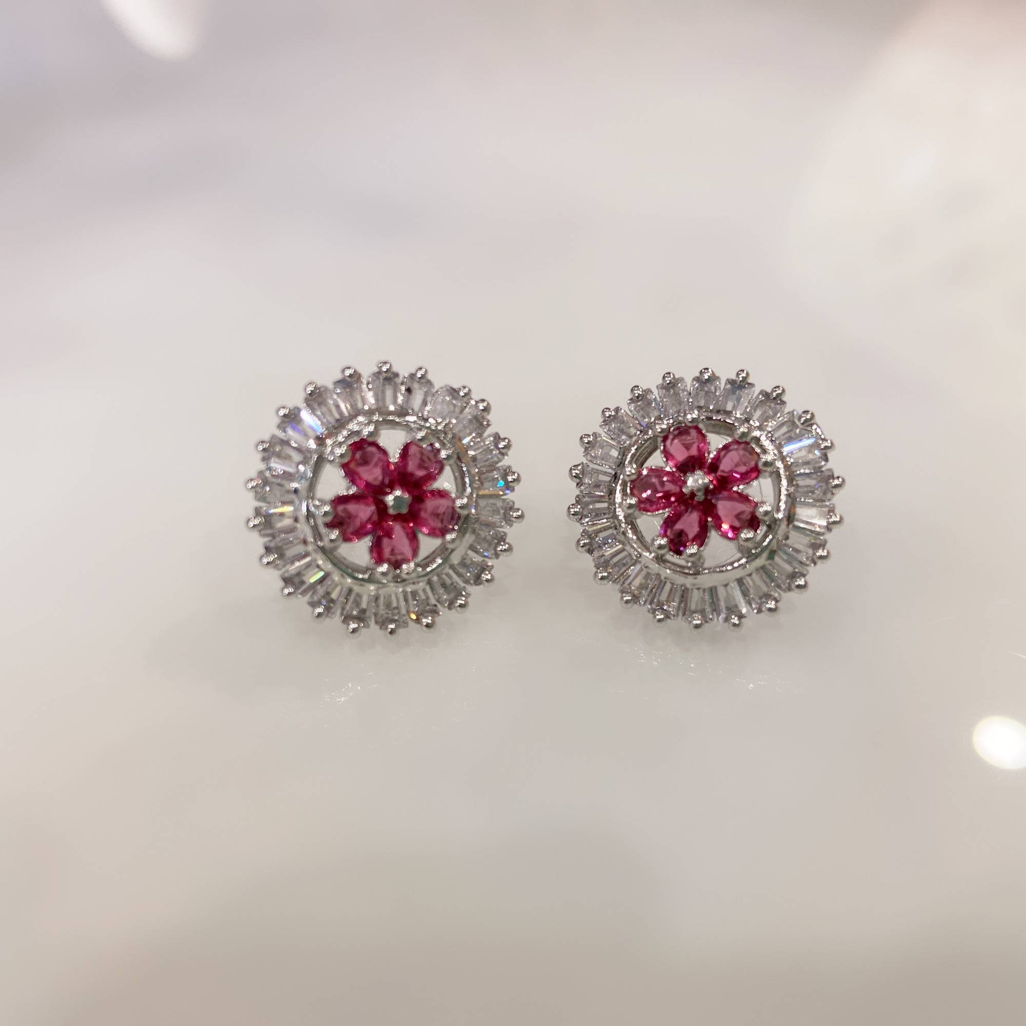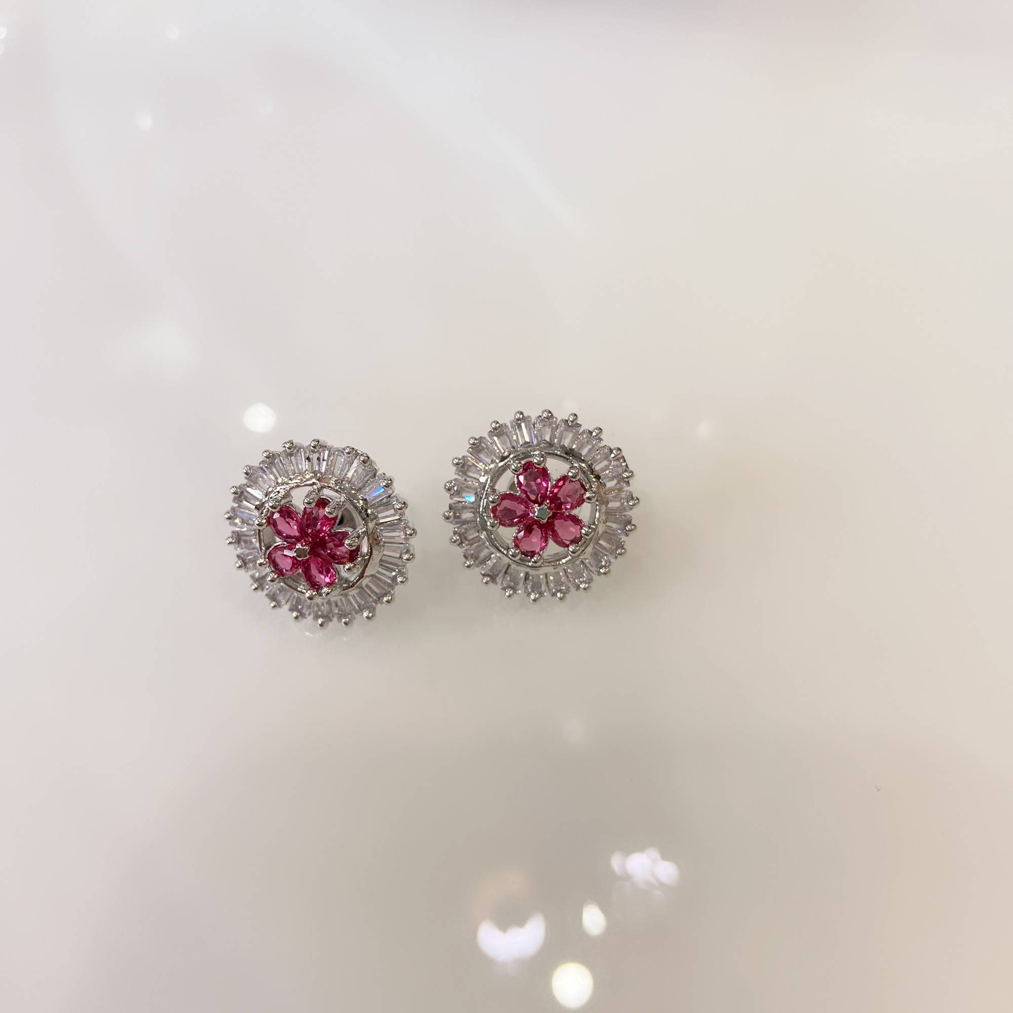 Delicately crafted with a radiant floral motif at the center, these stunning American Diamond (AD) studs feature shimmering pink stones surrounded by a halo of baguette-cut brilliance. A perfect blend of elegance and charm, ideal for festive wear or a chic everyday statement.