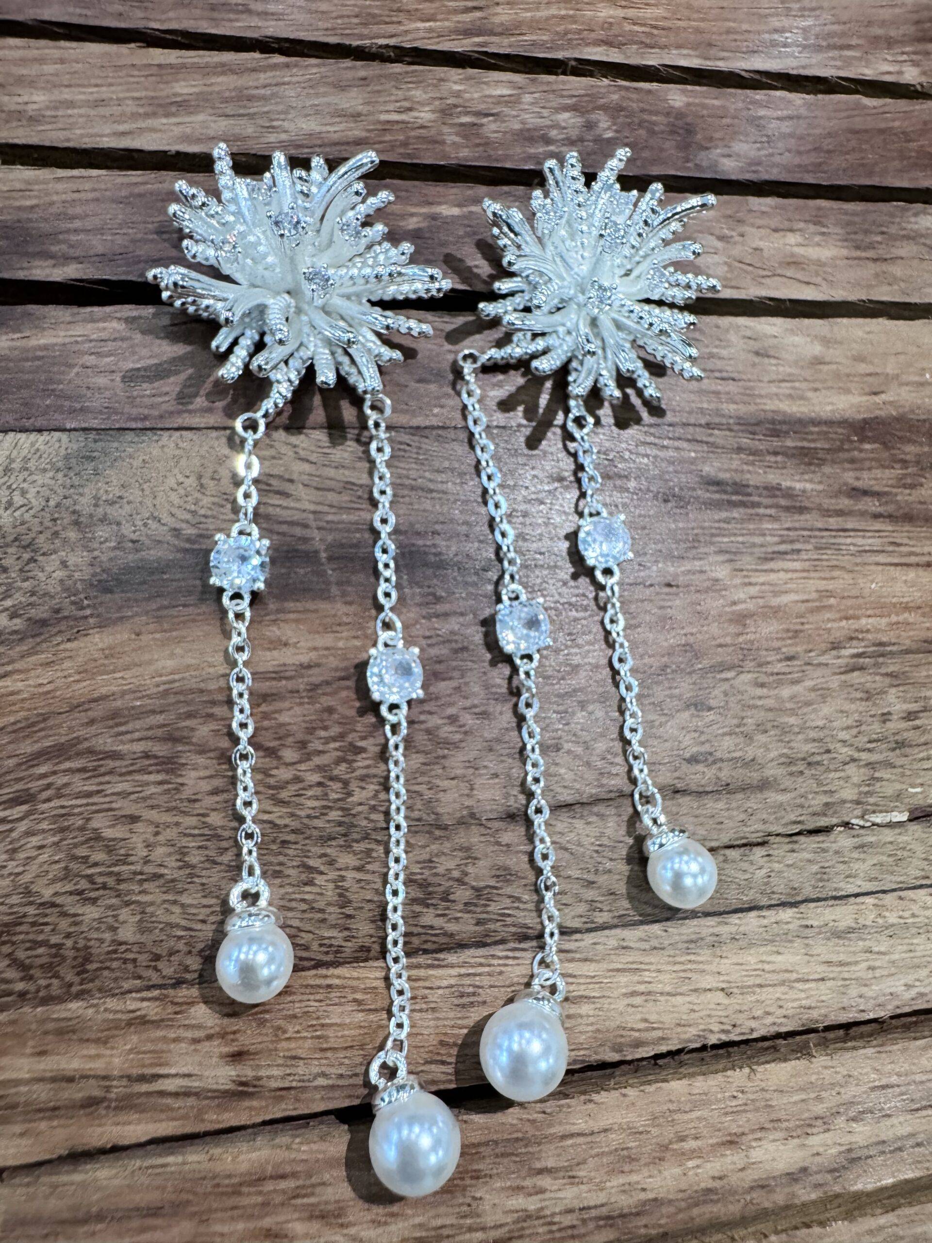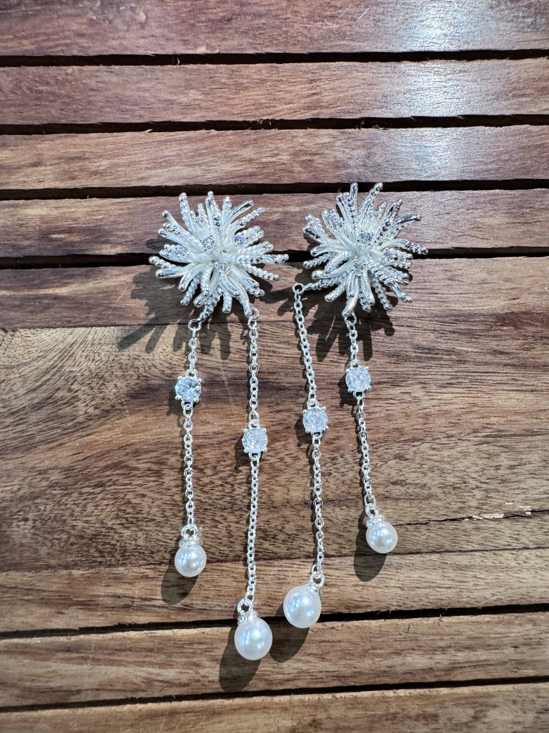 Elegant silver earrings with starburst studs, cascading chains, and pearl-like drops—crafted for graceful sparkle in office and formal settings.