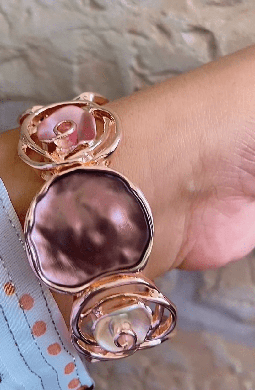 Embrace the mystique of the Aurora Spiral Cuff by Stile Sovrano. This statement bracelet features two mauve pearlized stones encased in sculpted gold-tone frames, joined at the center by a radiant spiral motif embracing a translucent blush crystal. Its flowing design evokes celestial balance and organic movement, making it an enchanting accessory for both day and night. Ideal for those who seek bold elegance with a touch of cosmic symbolism.