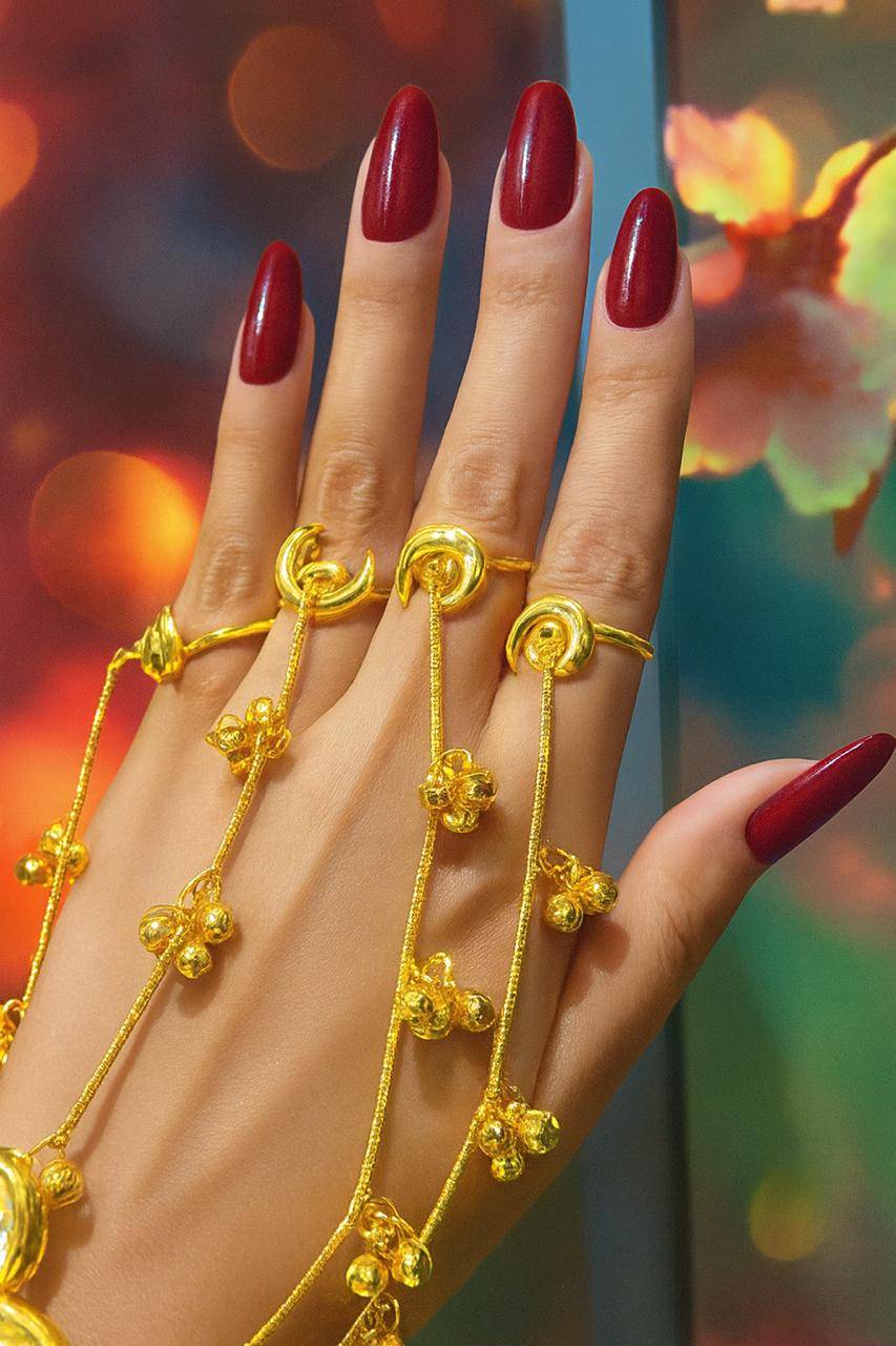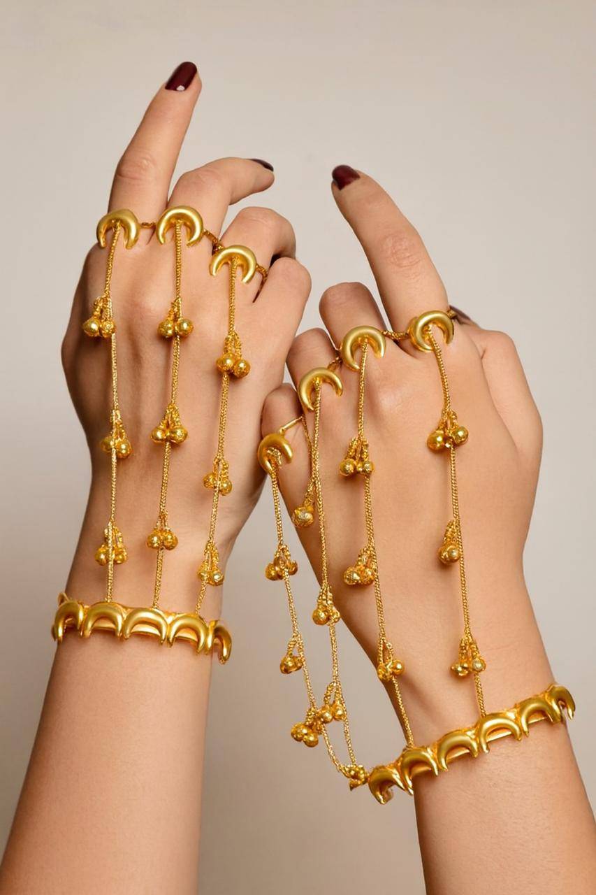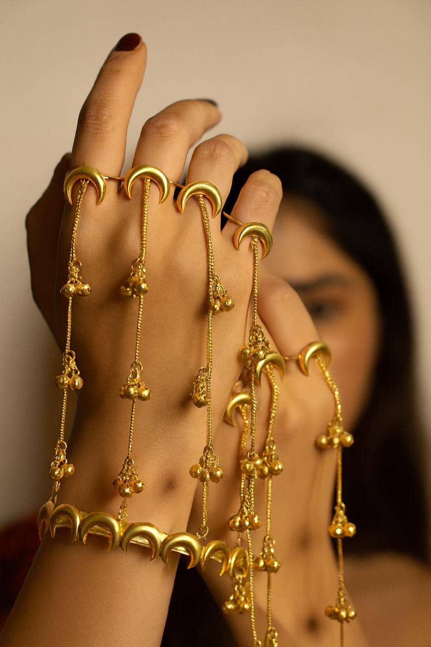 The Chandra Lehera Collection celebrates Indian heritage through rhythmic crescent motifs and cascading chain detailing. This gold-finished haathphool hand harness connects structured finger rings to a bold wrist cuff, creating a fluid, architectural silhouette across the hand.