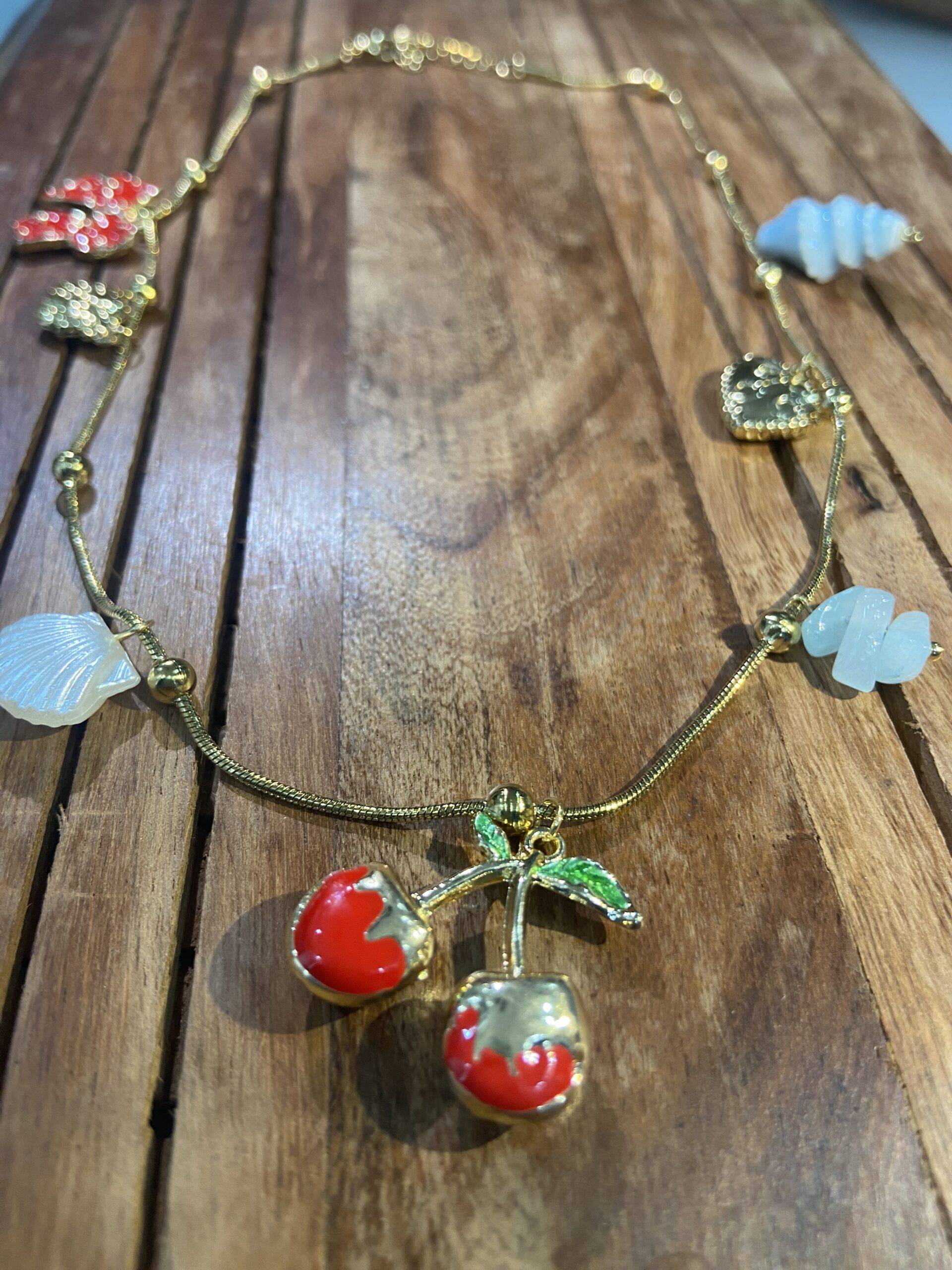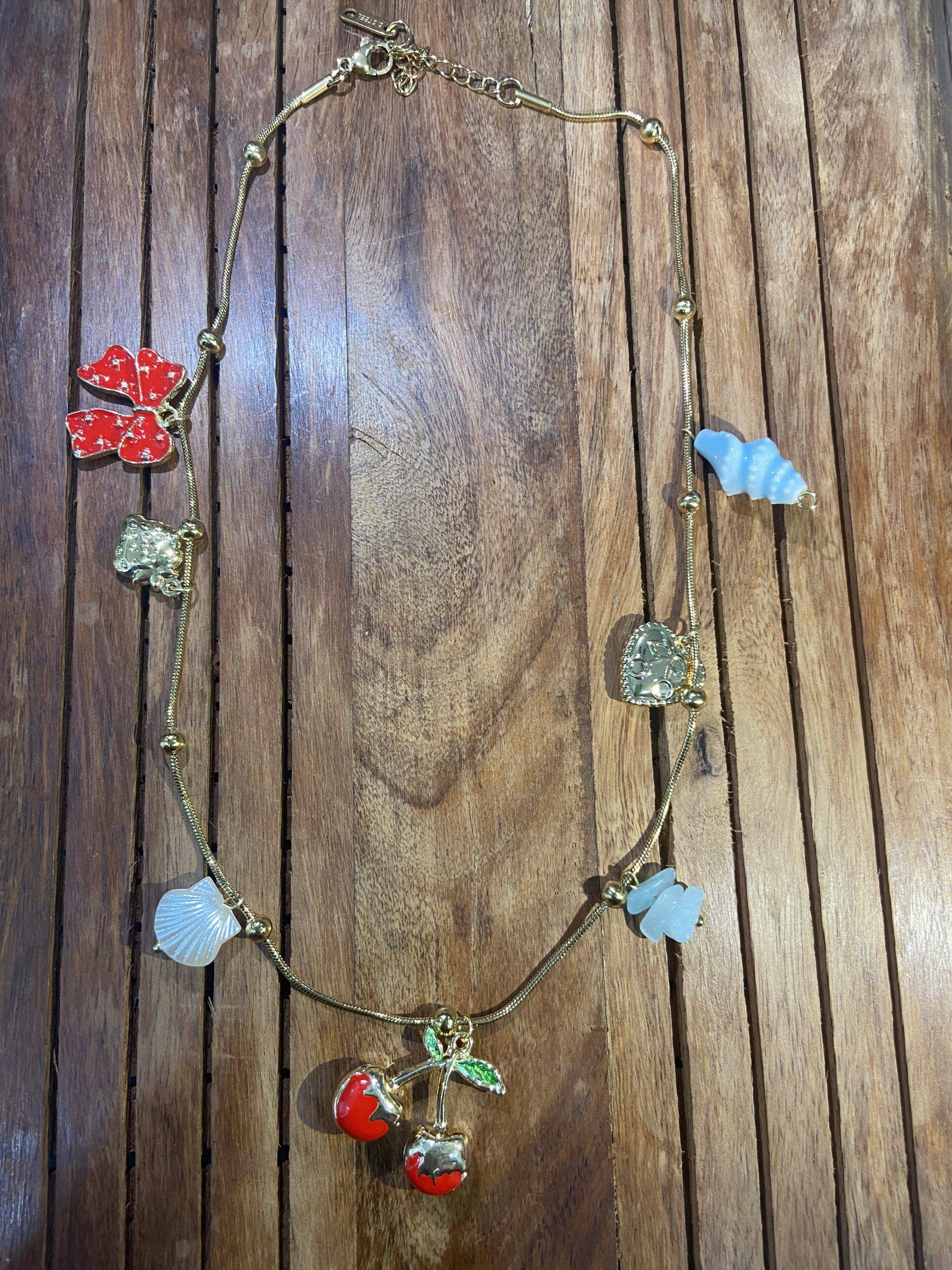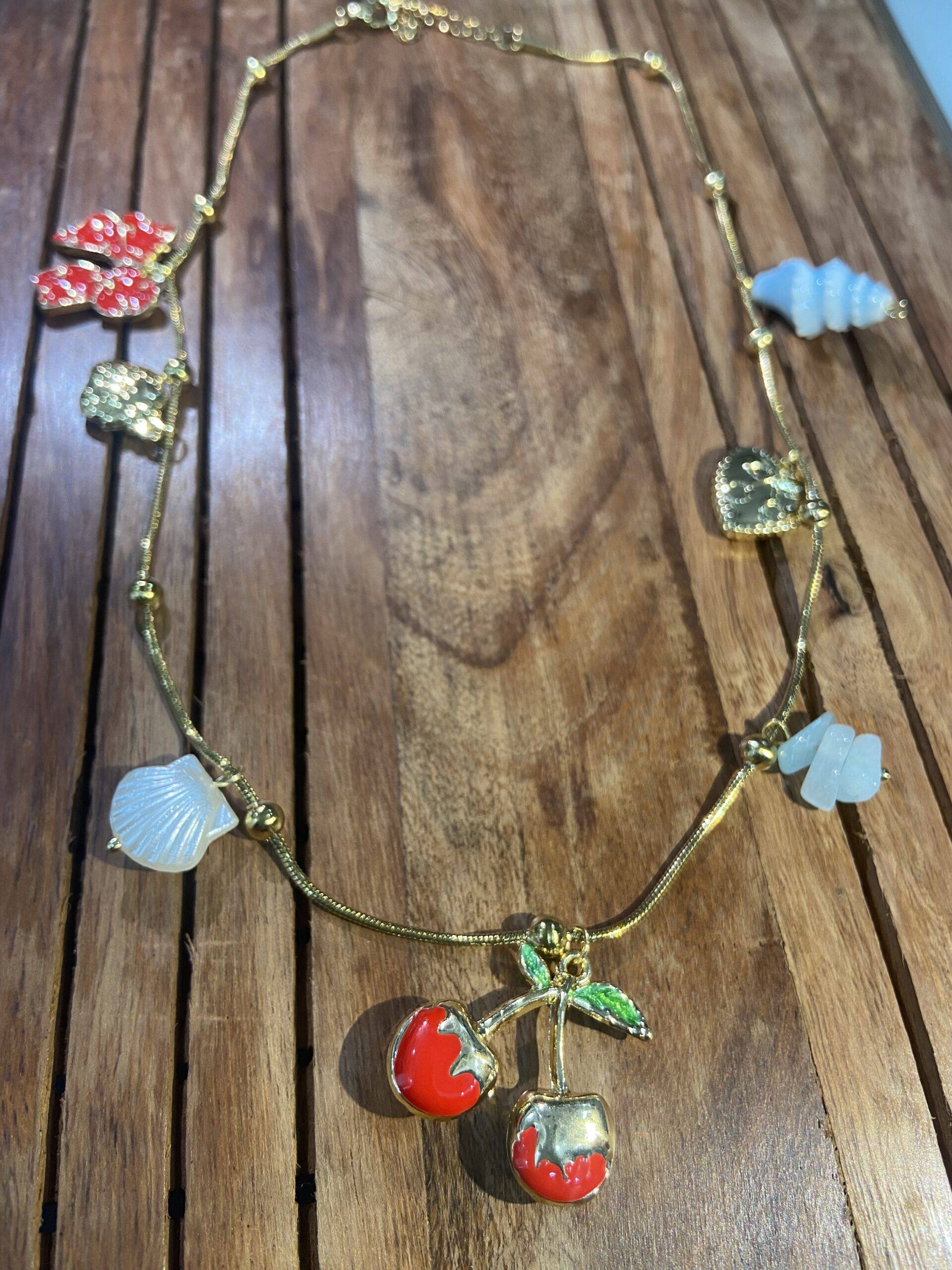 Evoke the whimsy of beloved tales with the Cherry Jubilee Necklace by Stile Sovrano. This captivating gold-tone chain is adorned with an array of playful charms: a pair of cherries with vibrant red enamel and green leaves, a textured seashell, a light blue spiral reminiscent of a confection, a filigree heart, and a vibrant red bow. Each charm adds a touch of storytelling magic to this piece, making it the perfect accessory to bring a sense of wonder and charm to any ensemble.