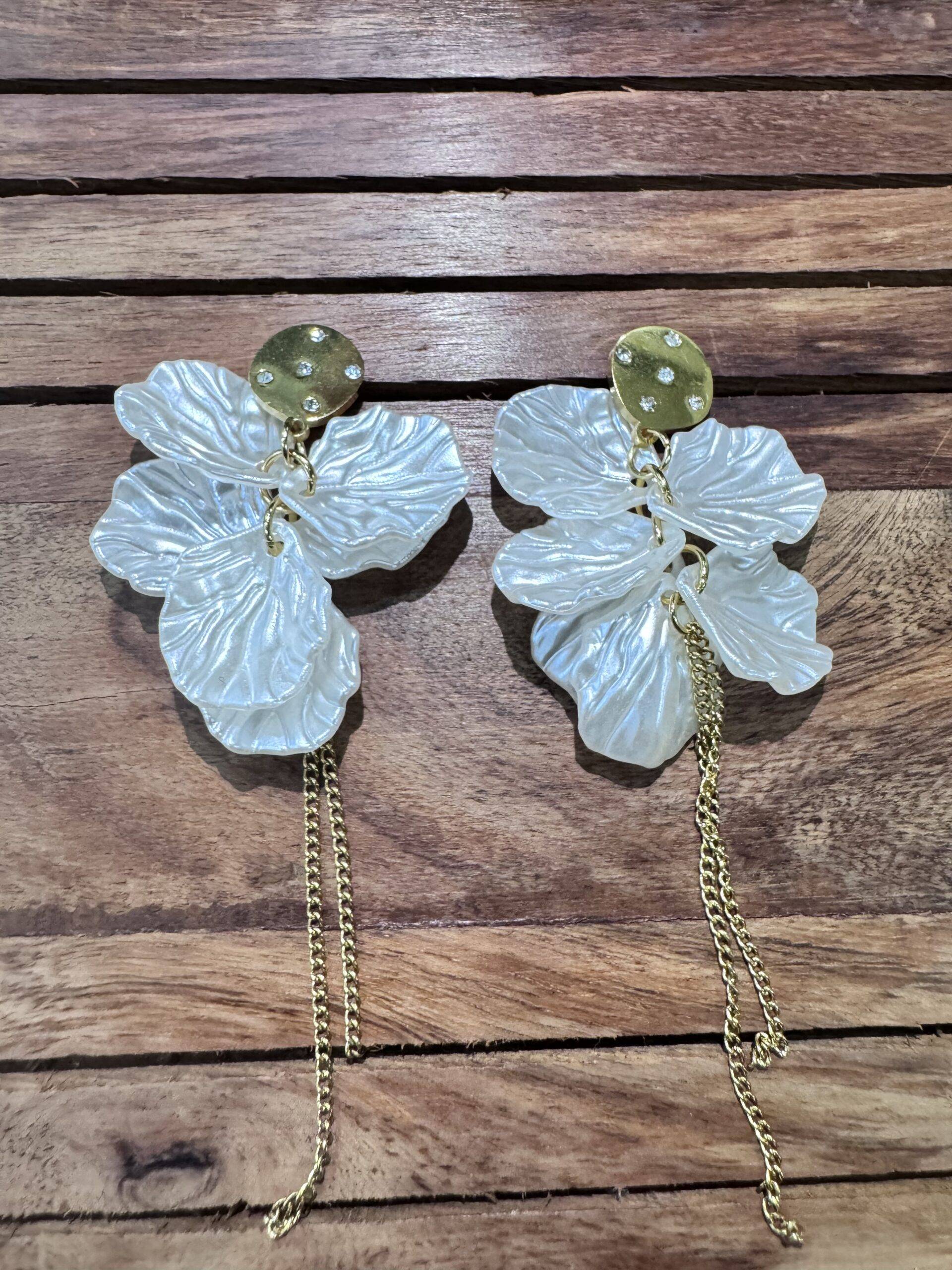 A graceful blend of floral artistry and modern elegance, the Floré Pearlveil Office Earrings are designed to elevate everyday sophistication. Each earring features a translucent white flower crafted in a mother-of-pearl–like finish, radiating soft luminosity and delicate charm. Nestled at the center is a gold-toned disc adorned with three subtle embedded stones, adding a refined sparkle. From this golden accent, a sleek chain flows downward, enhancing the silhouette with gentle movement and understated luxury. Perfect for office wear, formal luncheons, or minimal bridal styling, these earrings offer a fresh take on tradition—lightweight, versatile, and effortlessly chic.