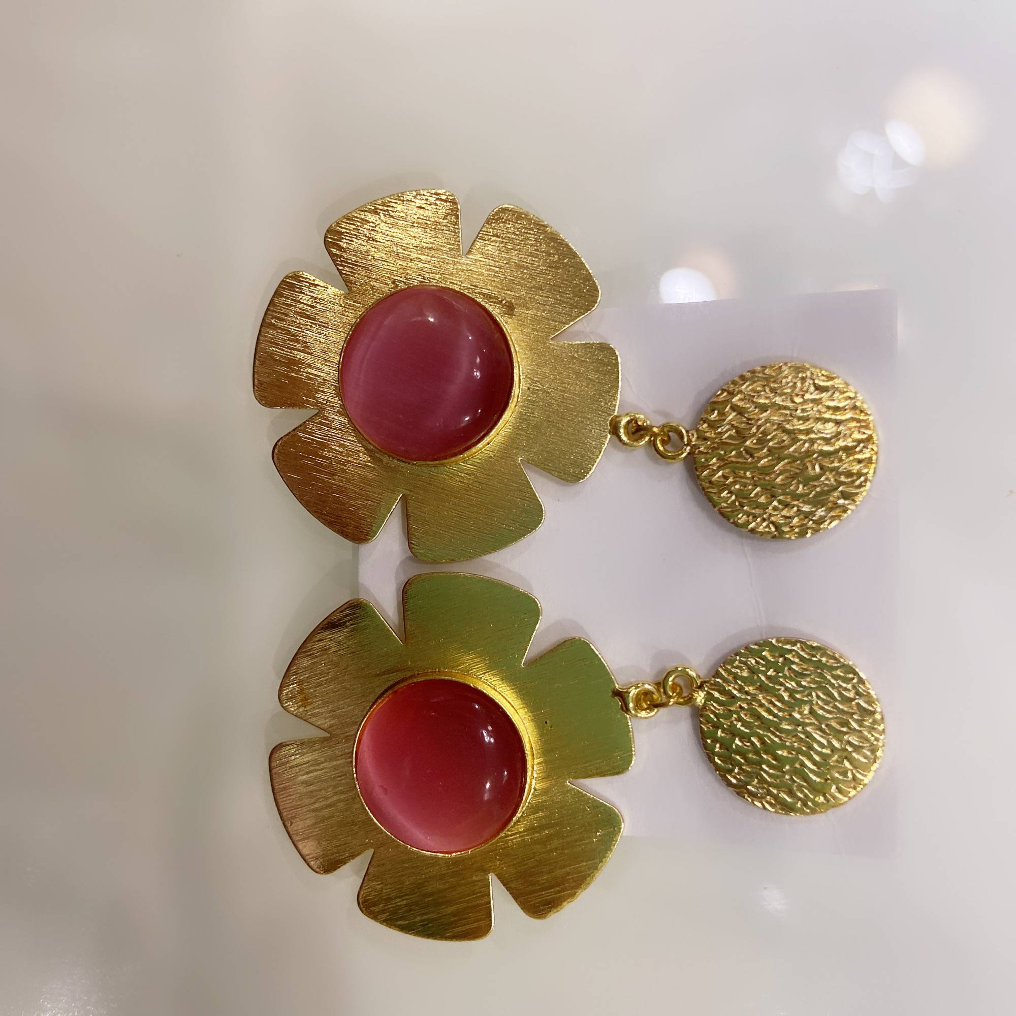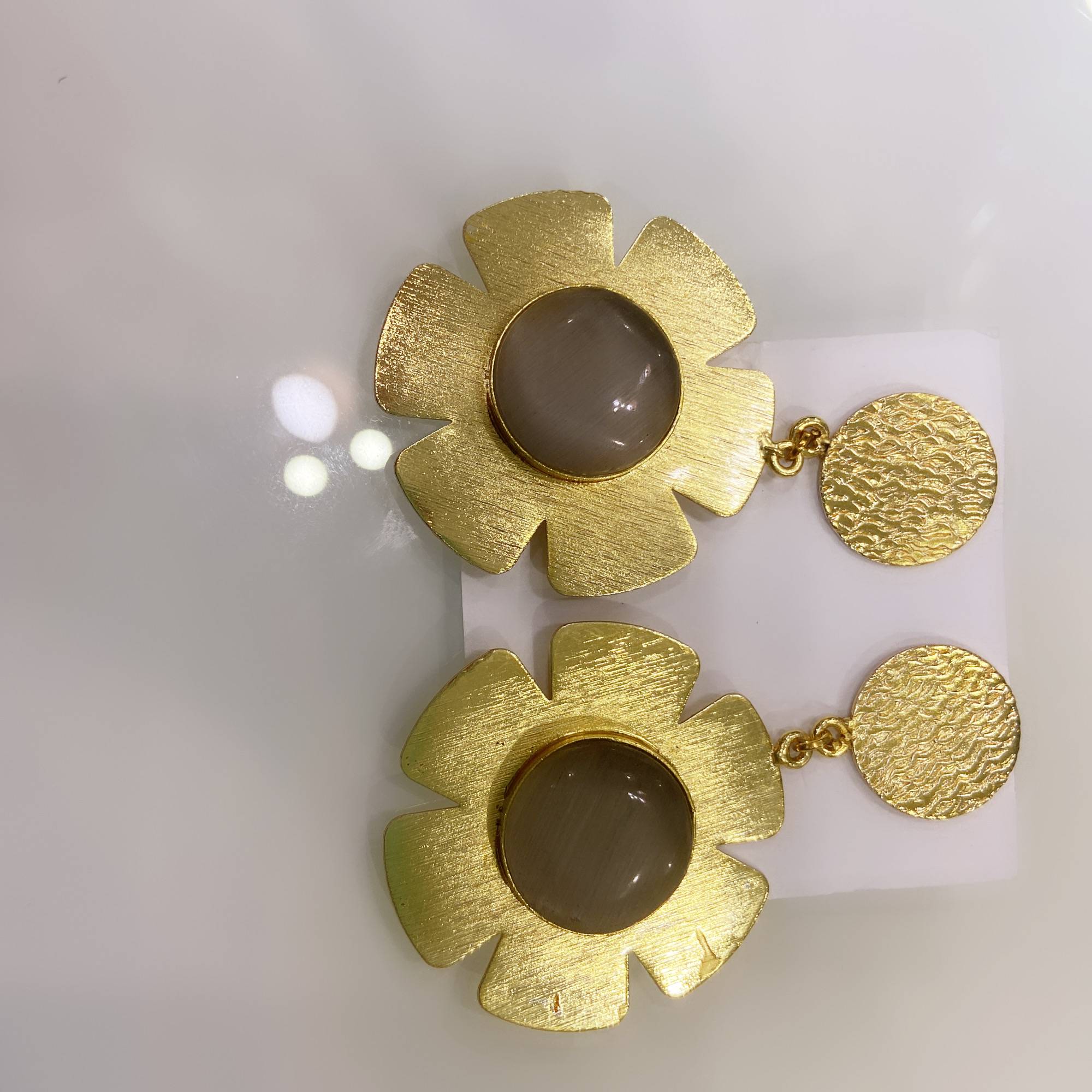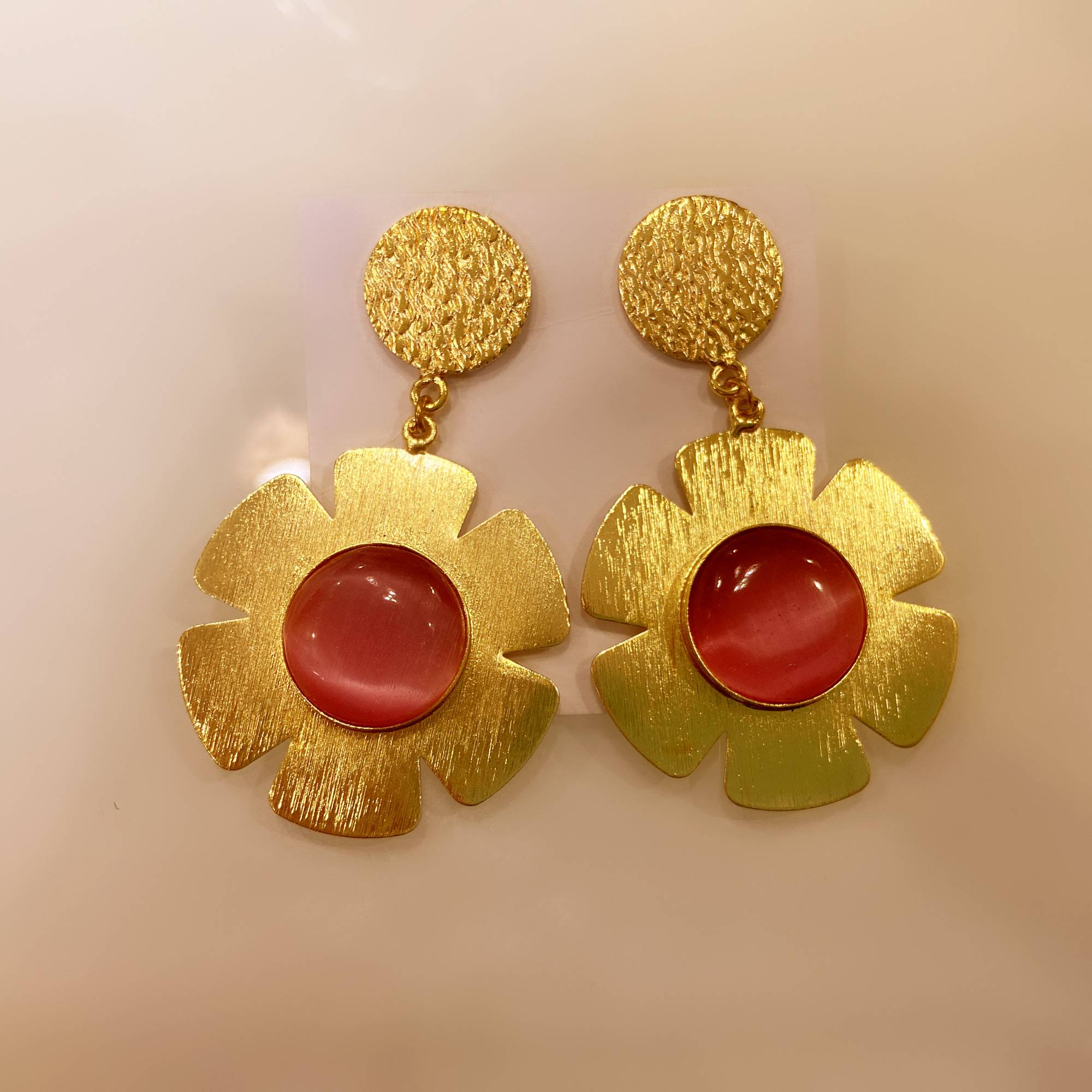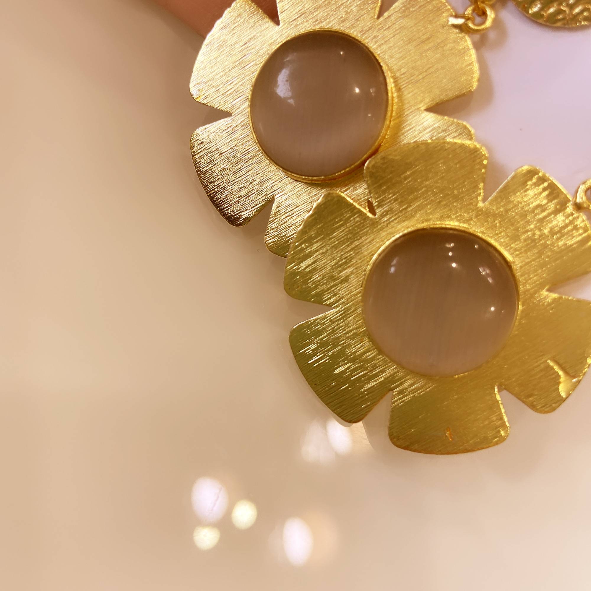 Make a statement with the Fiori D’Arte earrings by Stile Sovrano. These bold floral studs feature a hammered gold-toned disc top paired with a sculpted flower base, centered by a smooth gemstone. The contrast of matte metal and soft-toned stone creates a contemporary yet timeless look—ideal for daytime chic, cocktail evenings, or festive flair.