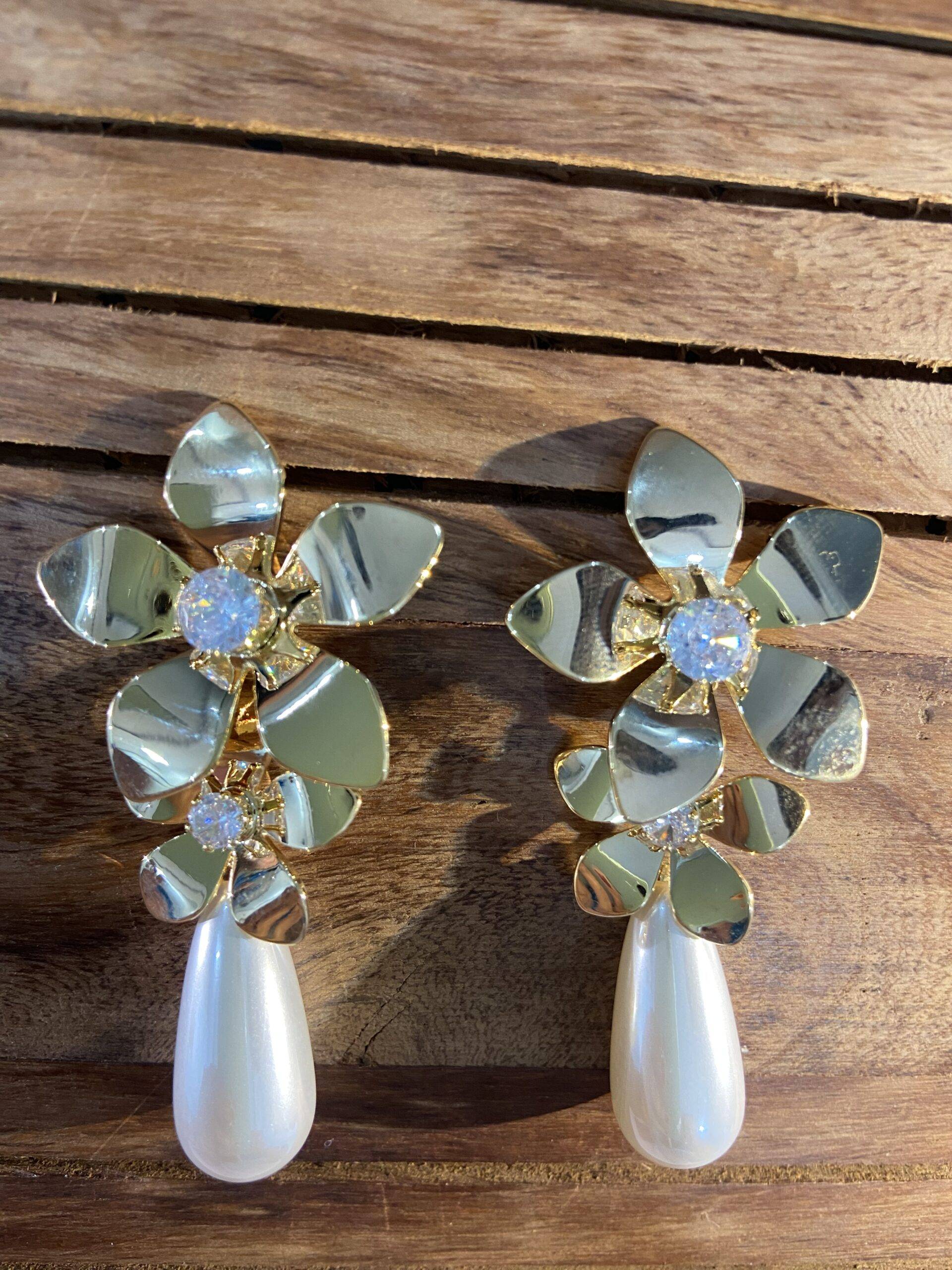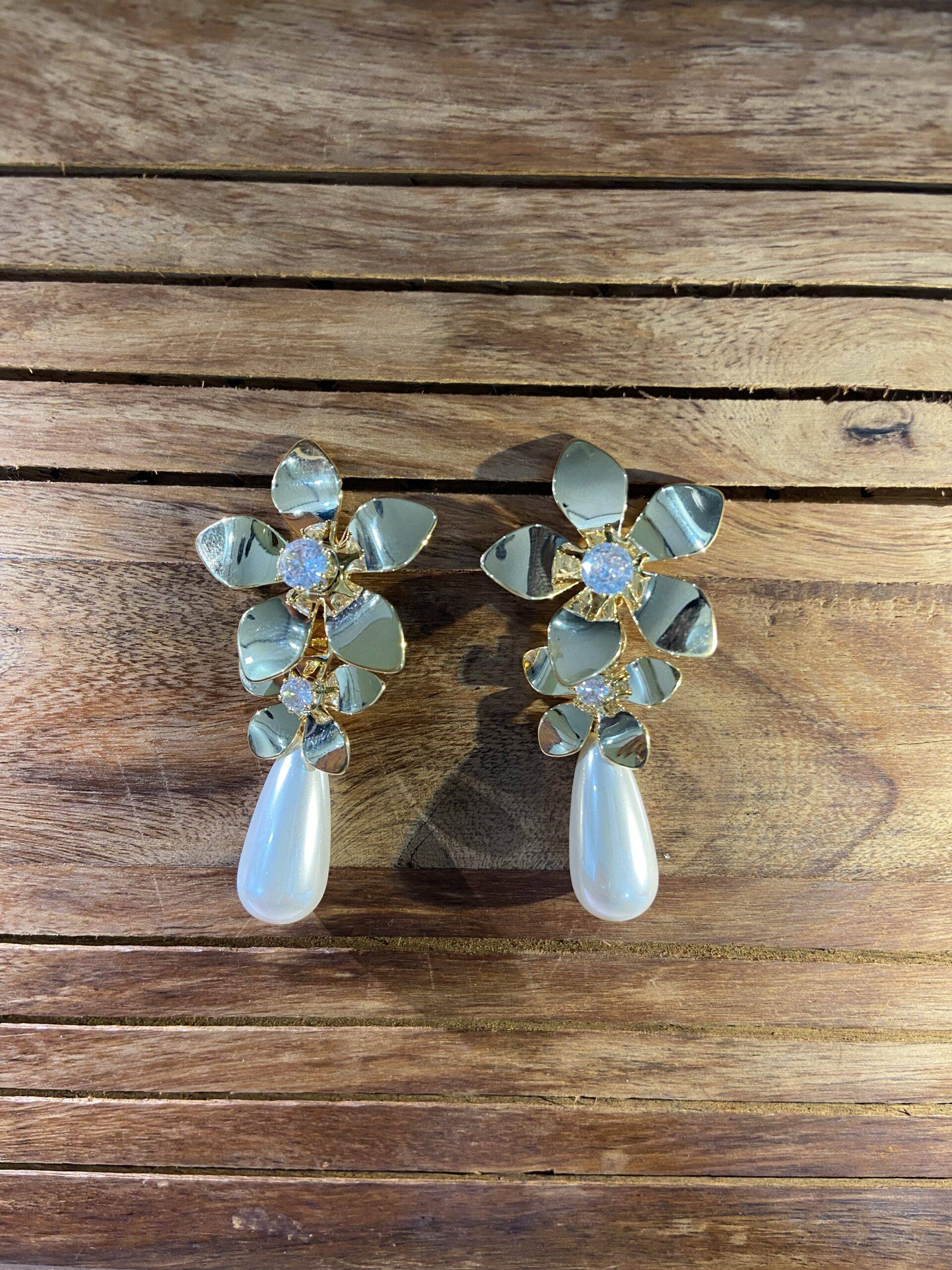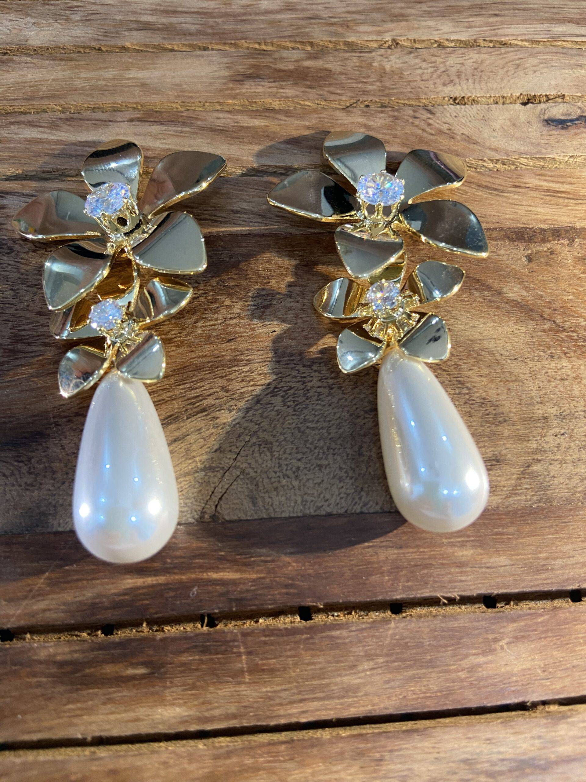 Gold flower earrings topped with lustrous teardrop pearls for botanical luxury.