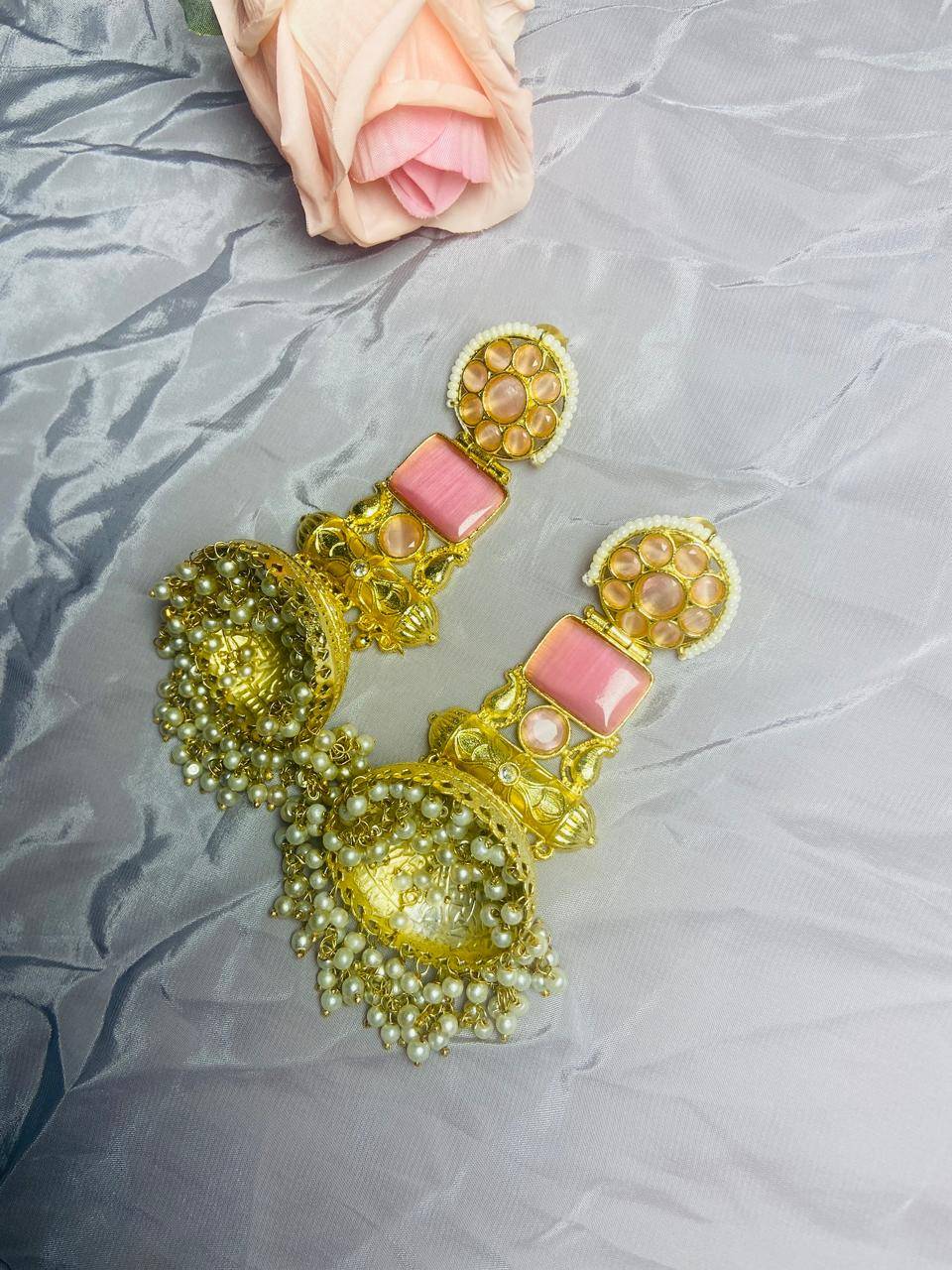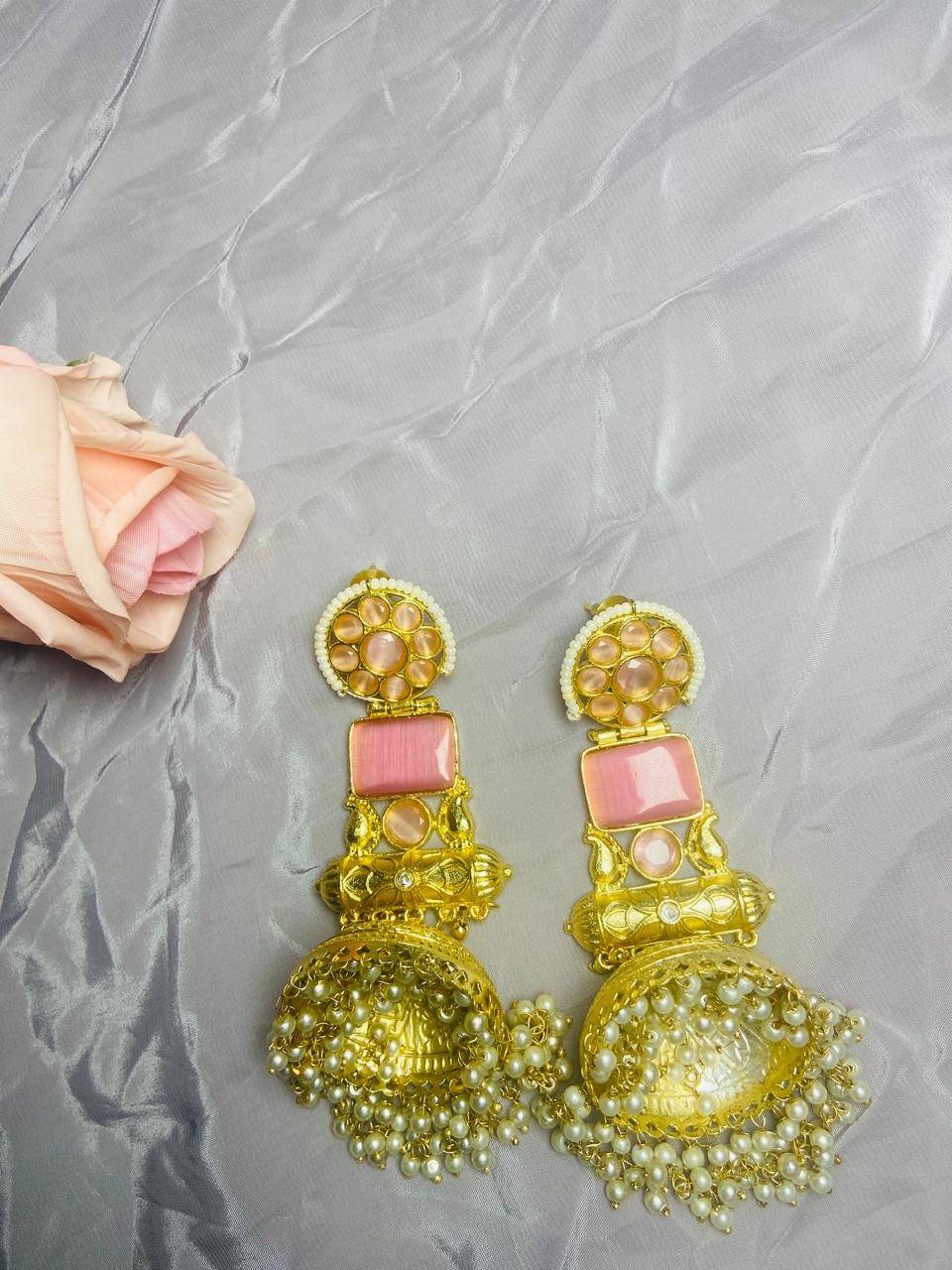 A regal pair of Kashmiri-inspired jhumka earrings featuring blush pink stones, antique gold detailing, pearl drops, and long chain tassels—crafted to elevate bridal and festive looks with timeless heritage elegance.