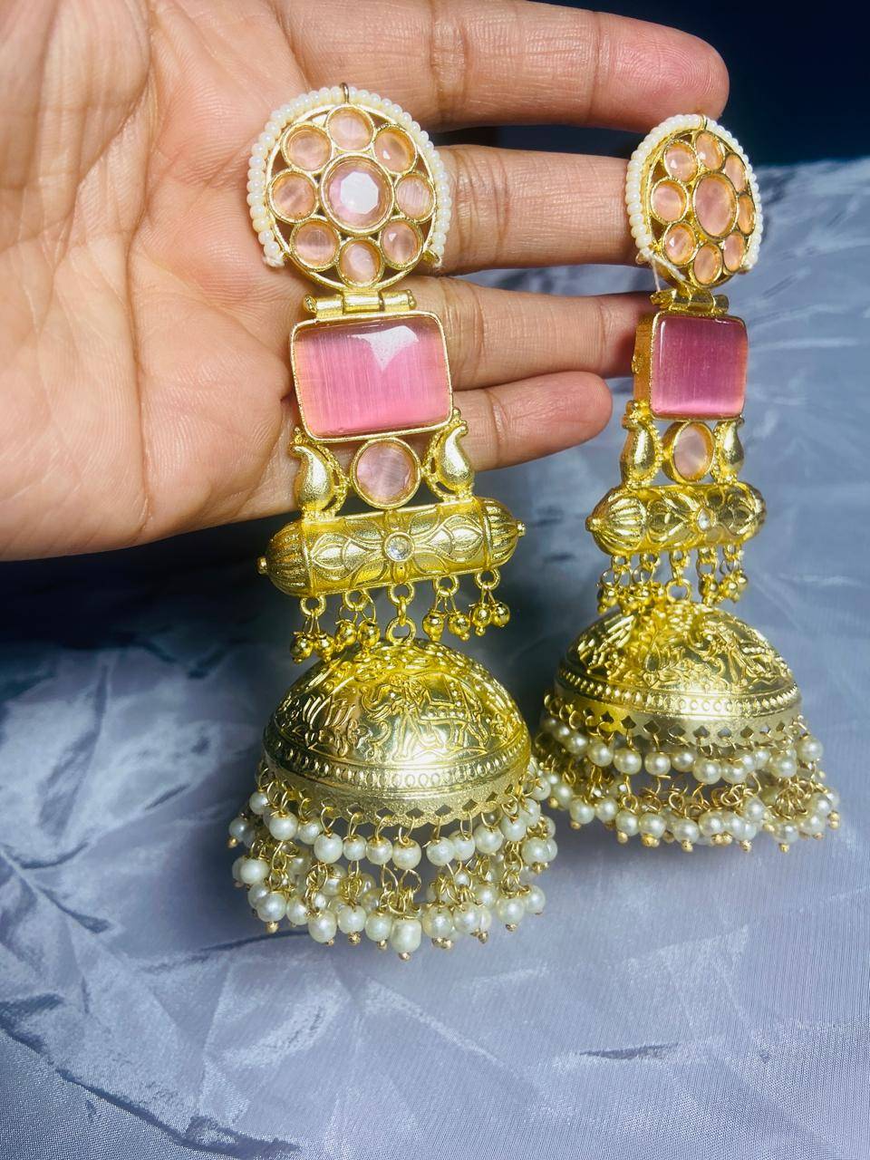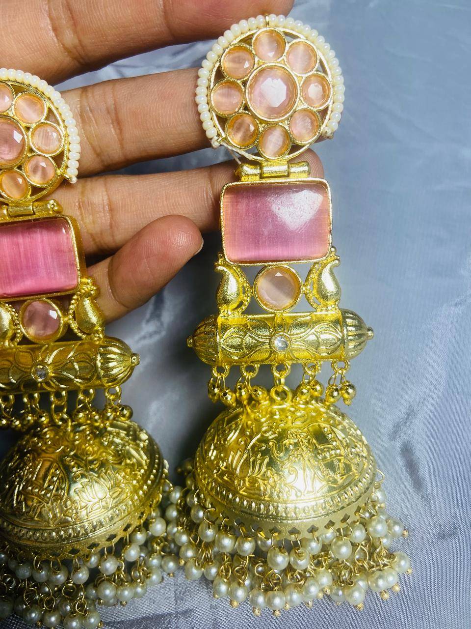 PREMIUM STONE & PEARL ACCENTS: Adorned with blush pink cabochon stones, circular kundan-style elements, and delicate pearl fringe drops for a regal finish.