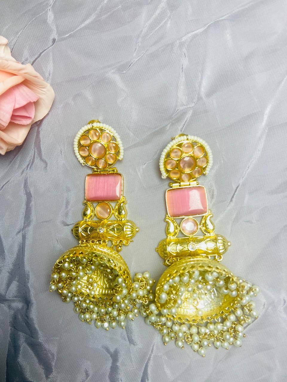 Rooted in heritage elegance, the Gulnaar-e-Viraasat Earrings by Stile Sovrano are a celebration of timeless Indian craftsmanship. The design features soft blush pink stones framed in intricate gold-toned metalwork, reminiscent of floral motifs found in traditional Kashmiri jewelry.