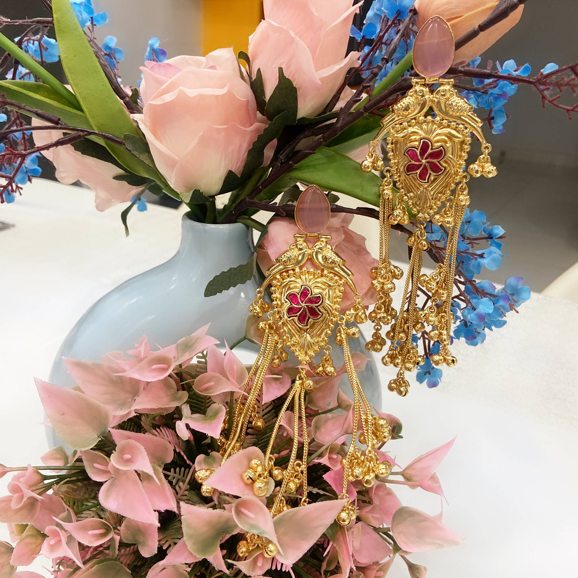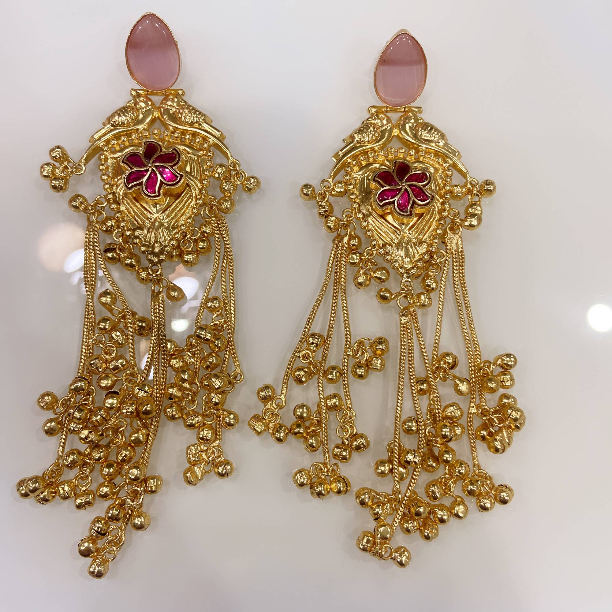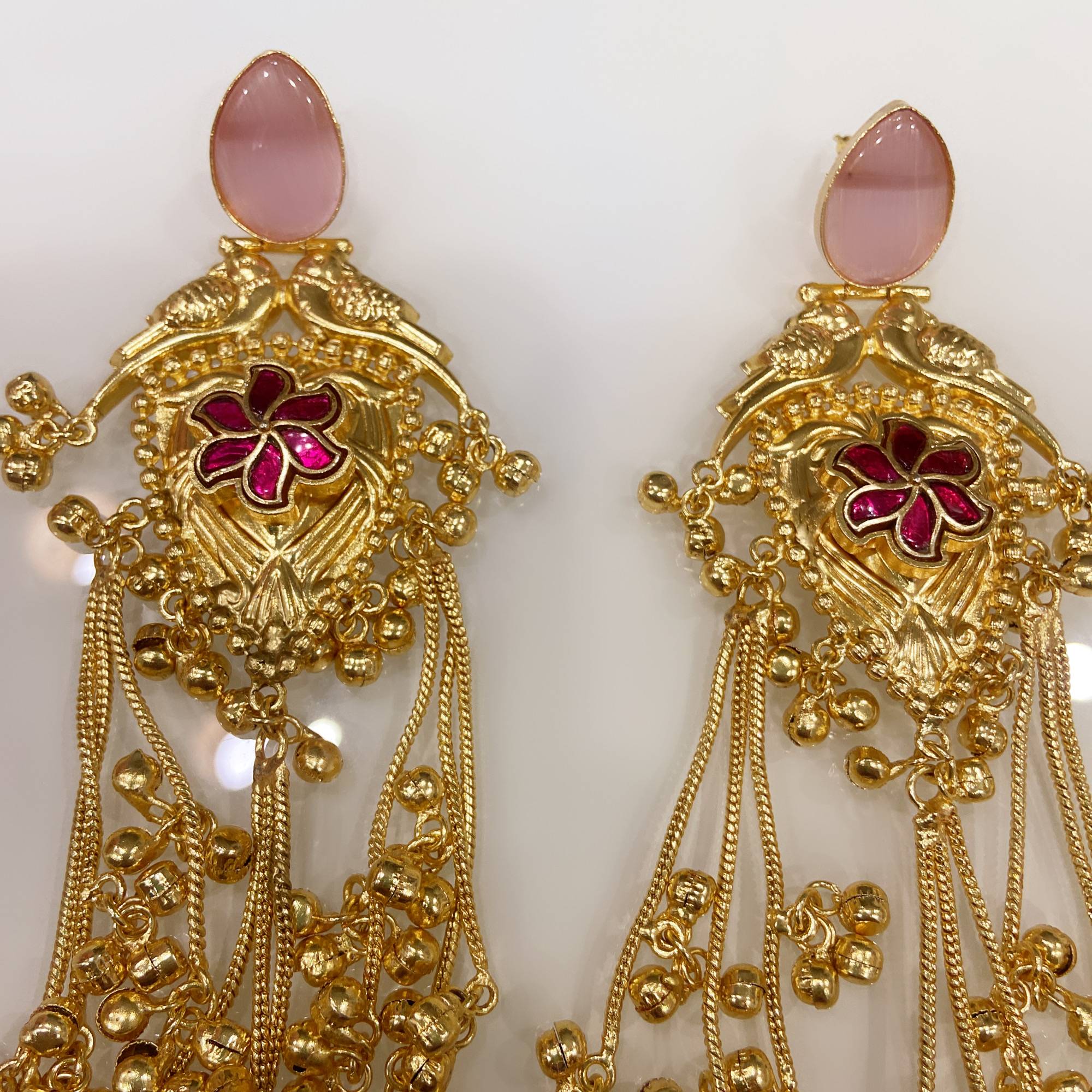 A stunning blend of romance and regality, these earrings feature a blush pink teardrop stud with twin golden birds perched over a ruby floral motif. Cascading golden chains with clustered beads add a waterfall charm, making them perfect for weddings, receptions, and festive nights.