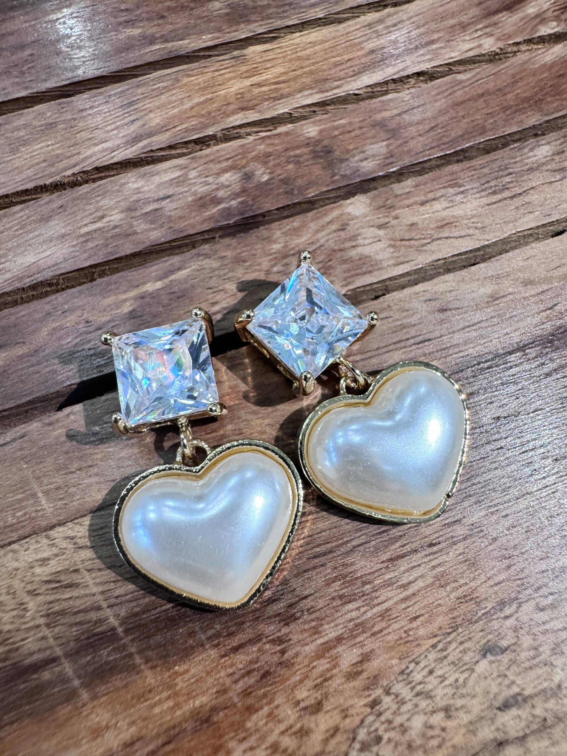 A romantic fusion of warmth and brilliance. These earrings feature a pearlescent heart bordered in gold-toned metal, paired with a square-cut clear gemstone that catches the light with every turn. The prong-set stone adds architectural elegance, while the heart motif evokes timeless affection. Perfect for gifting or elevating everyday luxury.