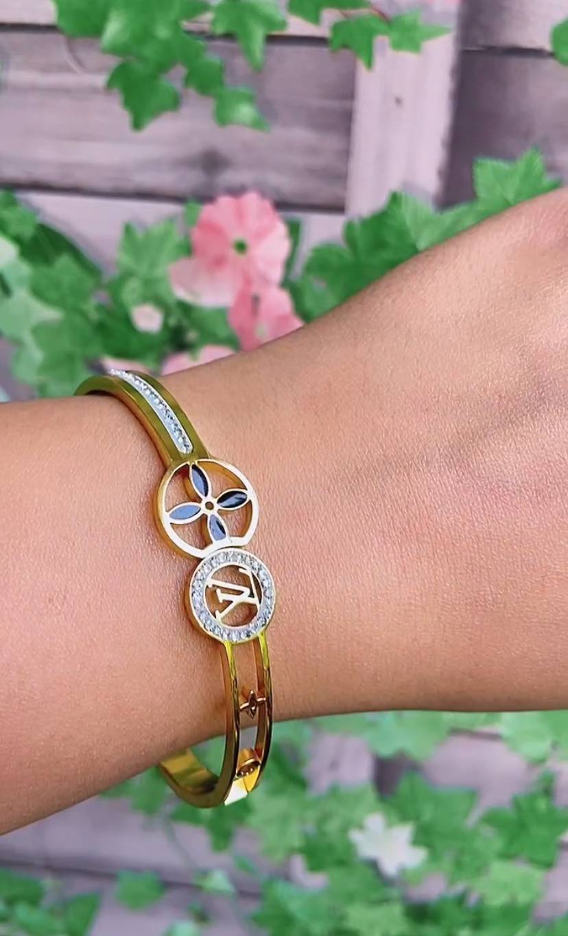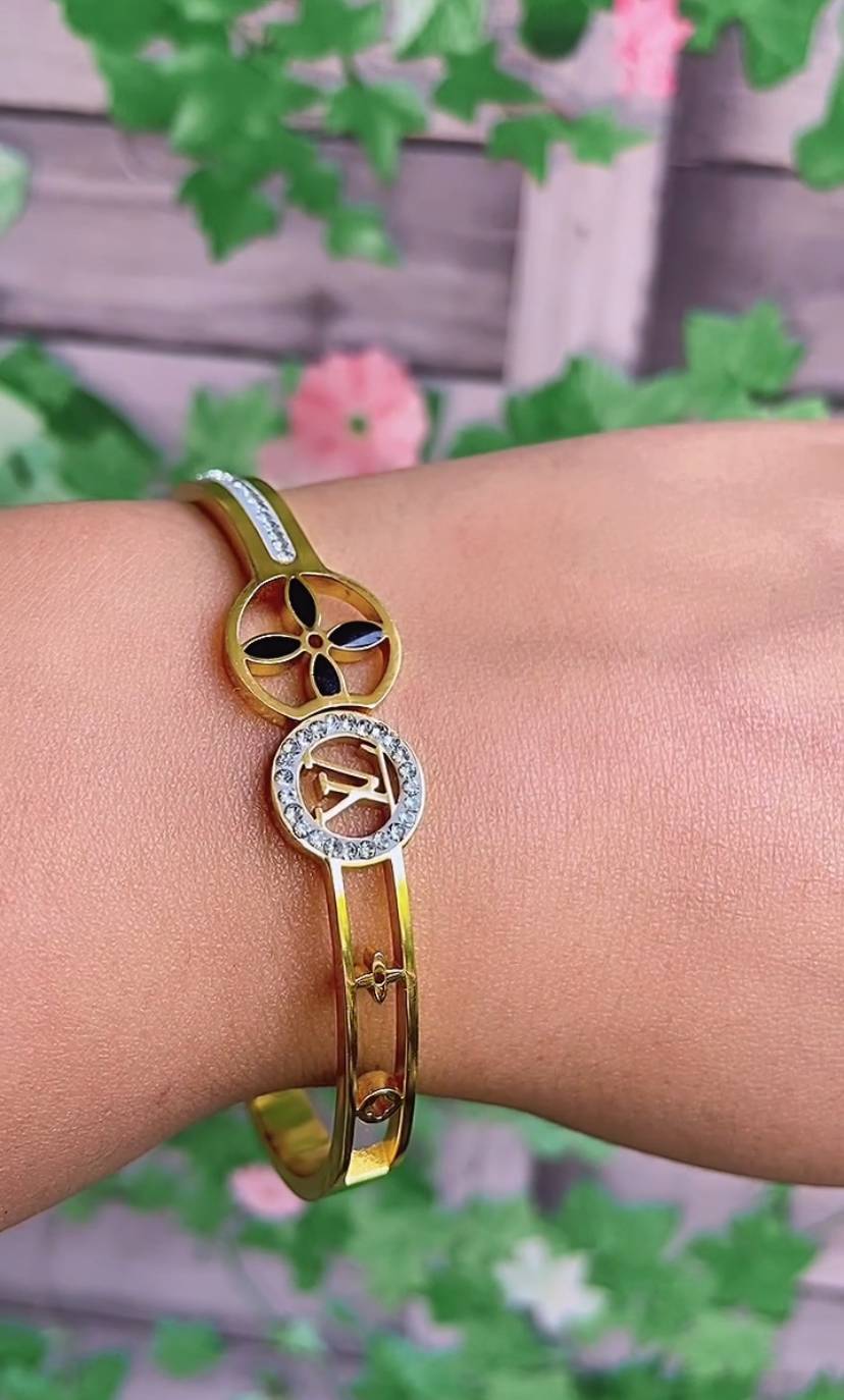 Embrace elegance with the Heritage Symbols Bracelet. This gold-tone bracelet showcases two distinct motifs: a clover-like floral accent in black enamel and a sparkling charm featuring a cut-out airplane encircled by clear stones. The slender, polished design merges heritage symbolism with modern wanderlust, making it a perfect accessory for those who carry stories on their wrist. Ideal for gifting or personal styling, this piece adds iconic sophistication to any ensemble.
