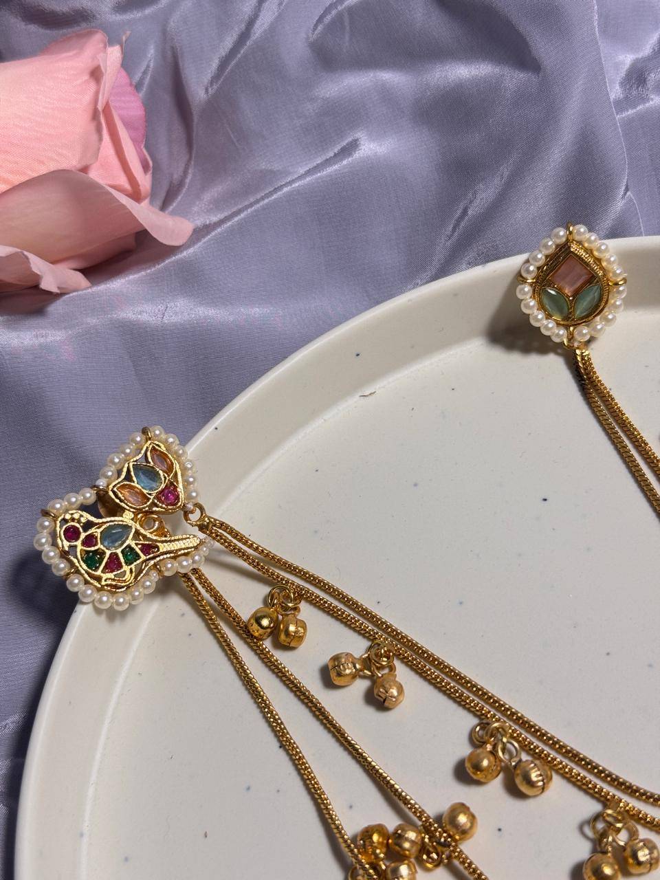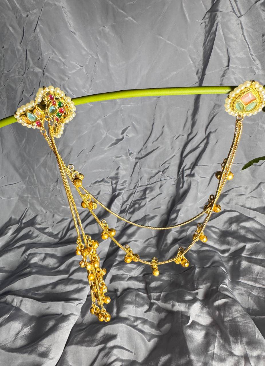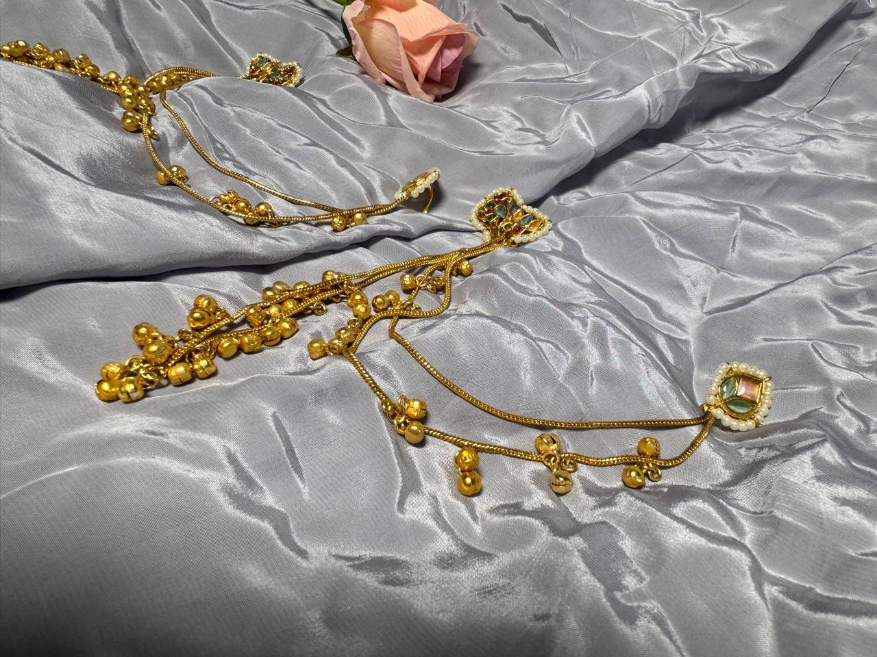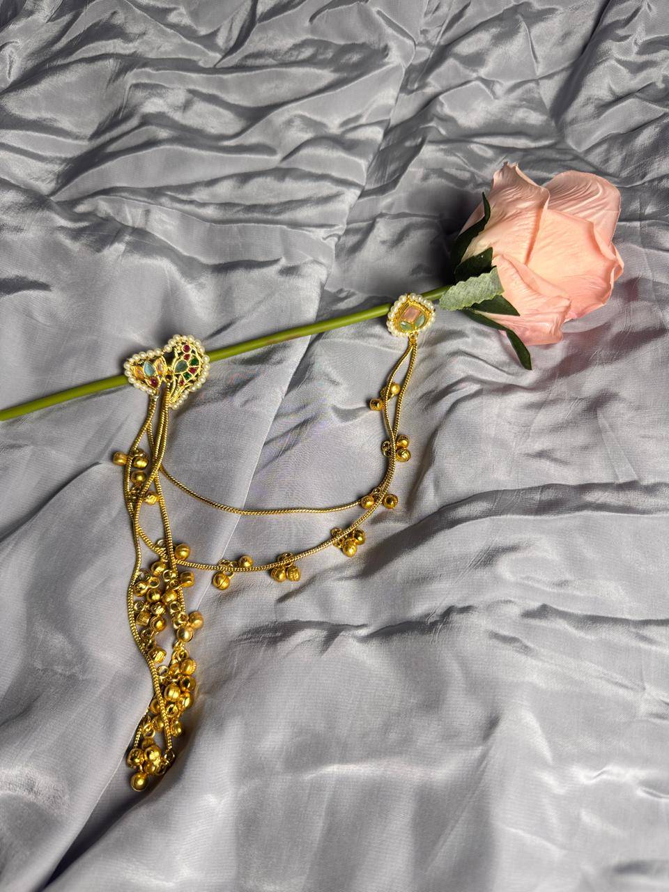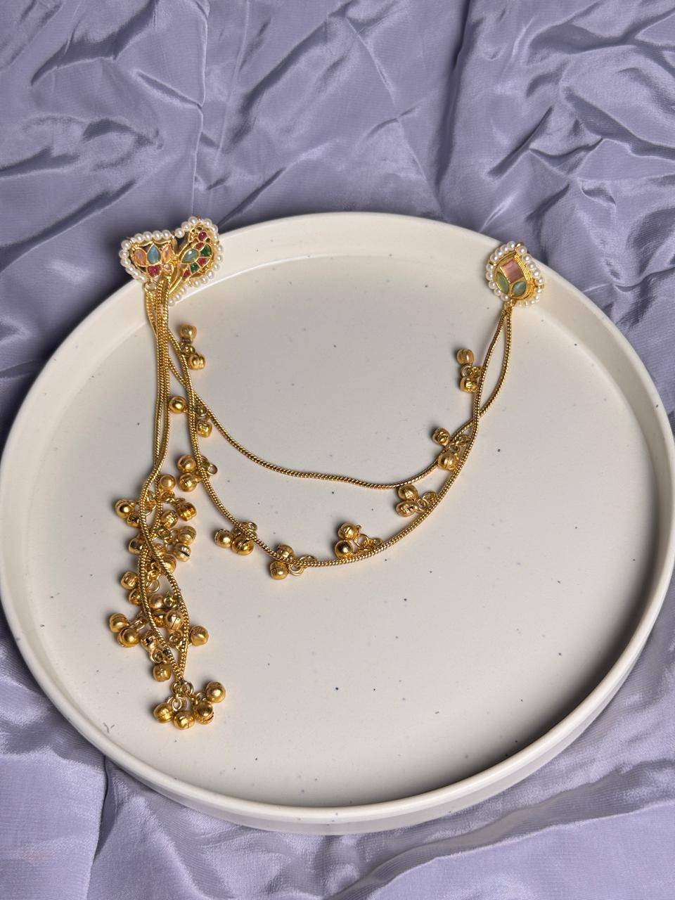 A regal fusion of Kashmiri craftsmanship and luxurious detailing, featuring enamel-kundan inspired studs, hand-set pearls, and flowing dual chains adorned with golden ghungroos.
