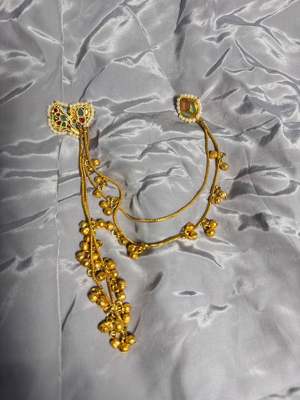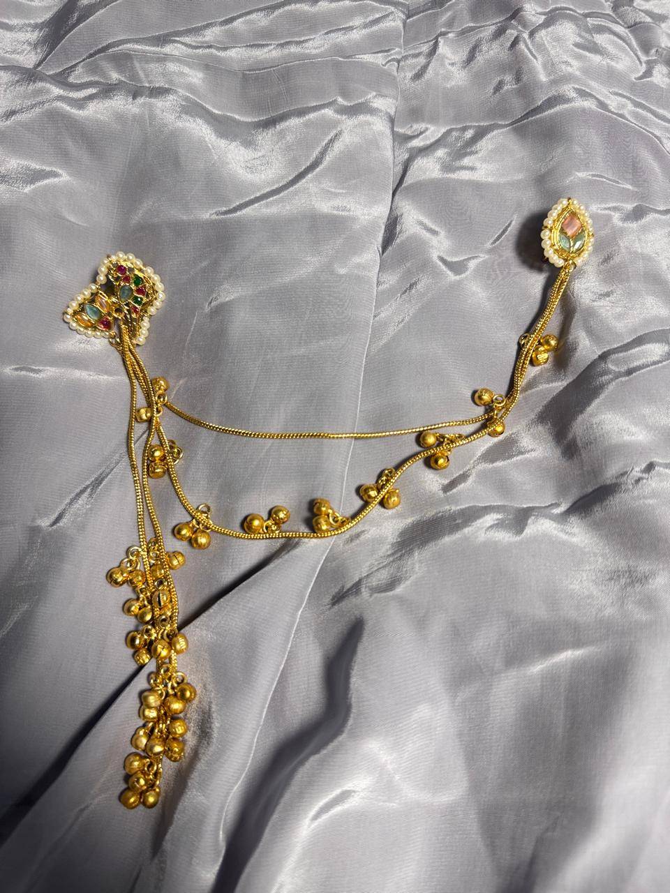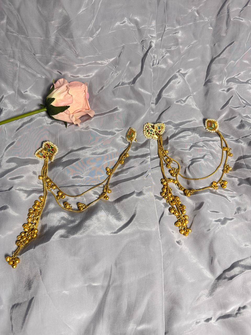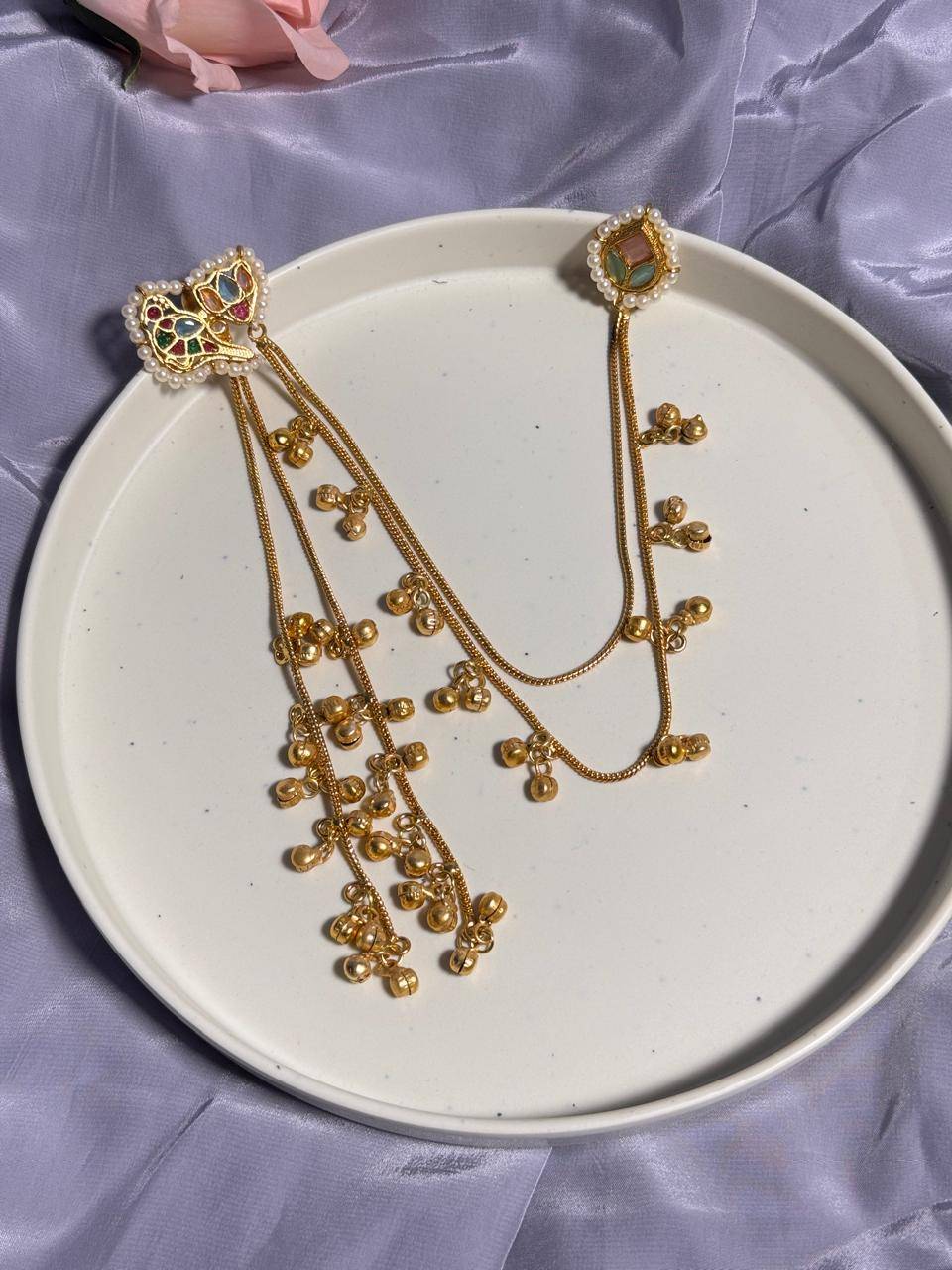 A regal fusion of Kashmiri craftsmanship and luxurious detailing, featuring enamel-kundan inspired studs, hand-set pearls, and flowing dual chains adorned with golden ghungroos.