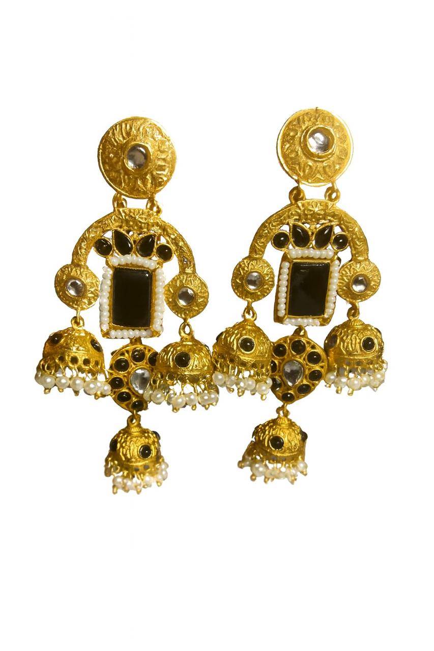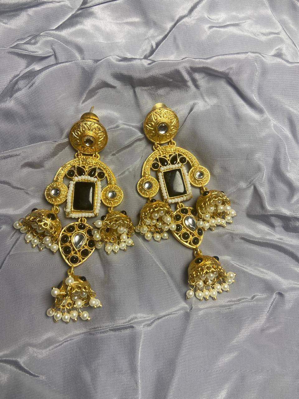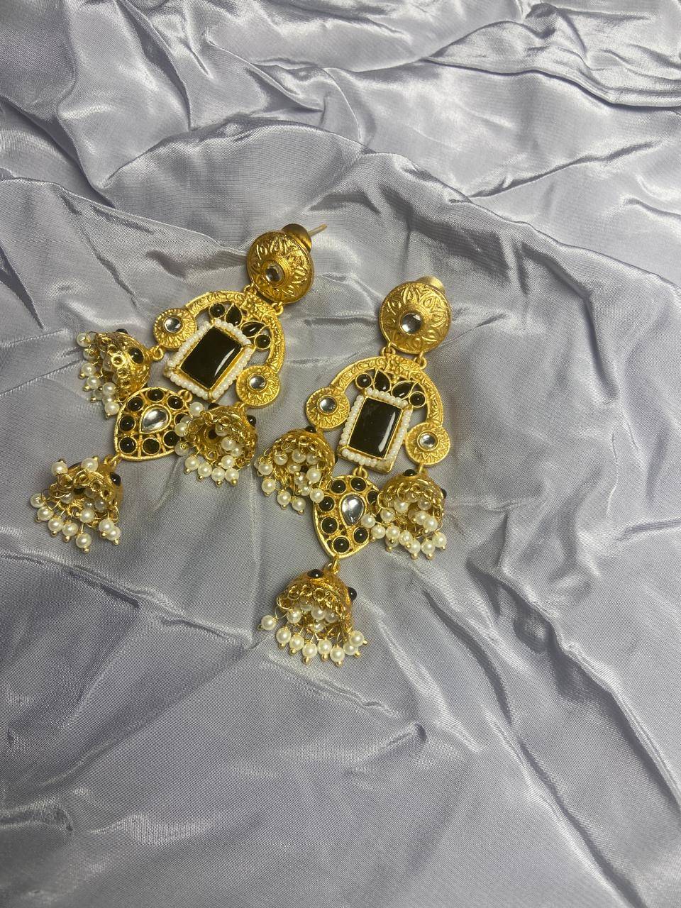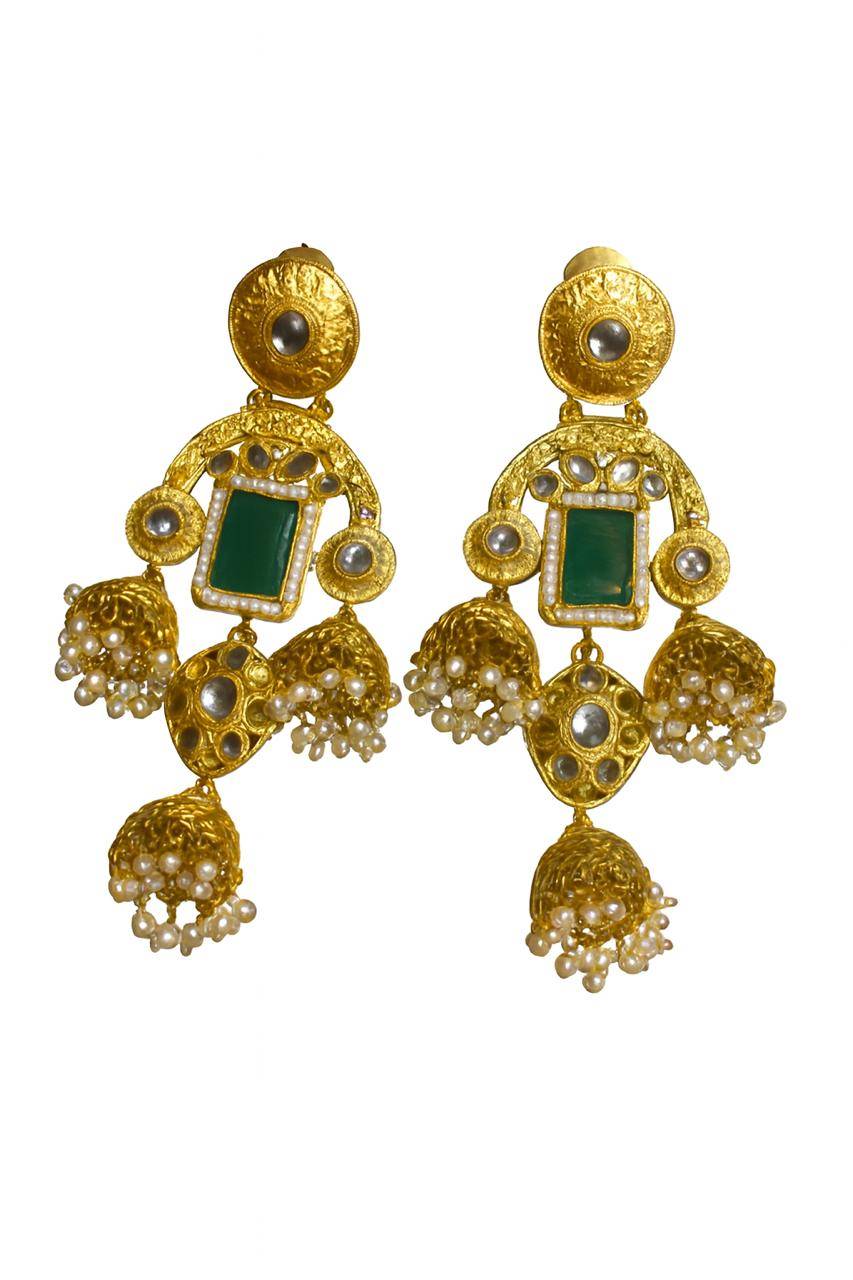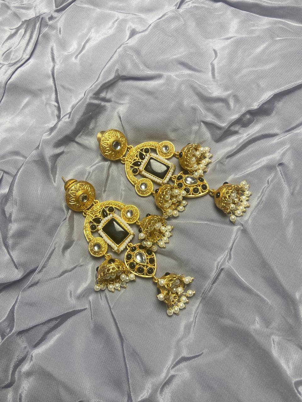 Rooted in timeless Indian artistry, these Stile Sovrano Kashmiri Inspired Kundan Jhumki Earrings are crafted to celebrate heritage elegance with a regal presence. The design features a bold rectangular statement stone framed by delicate pearl detailing and surrounded by kundan-style embellishments. The graceful arch structure flows into traditional jhumki drops enriched with pearl clusters, creating beautiful movement and a rich festive appeal. Finished in a luminous gold-toned polish, these earrings balance statement grandeur with comfortable wear. Perfect for weddings, festive occasions, and special cultural celebrations, this pair is designed for women who appreciate traditional craftsmanship blended with refined luxury.