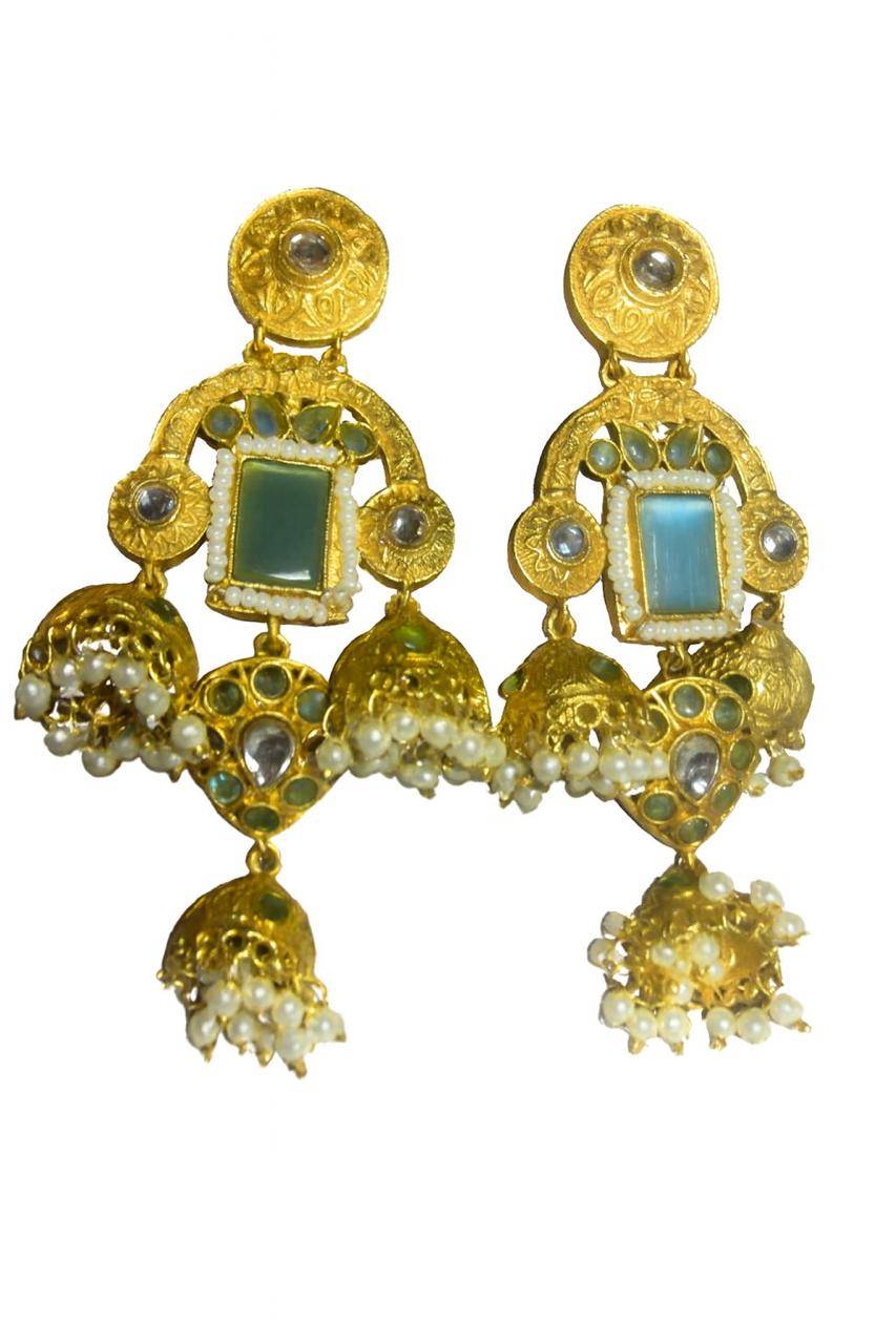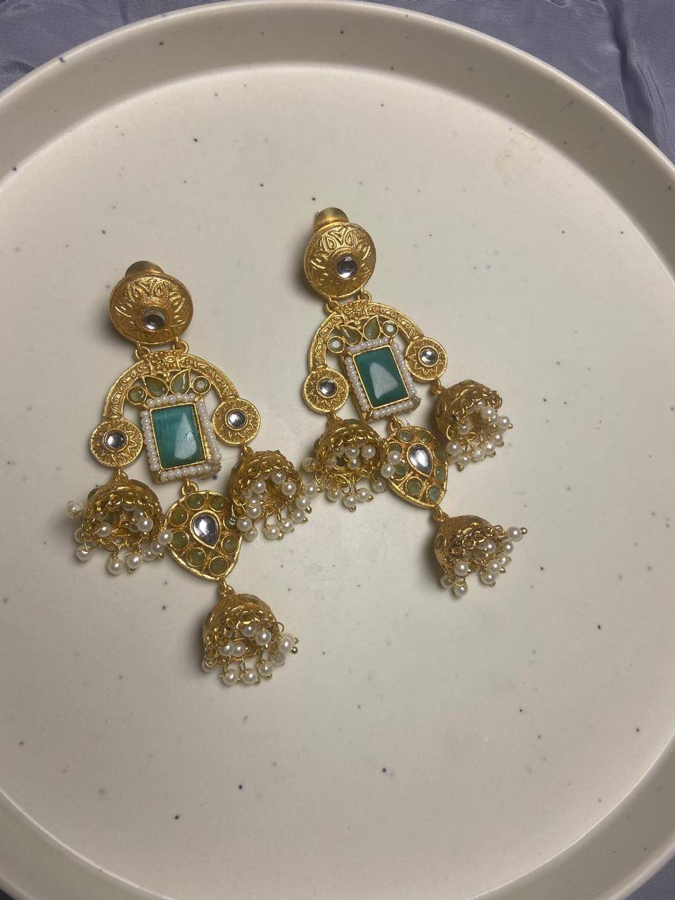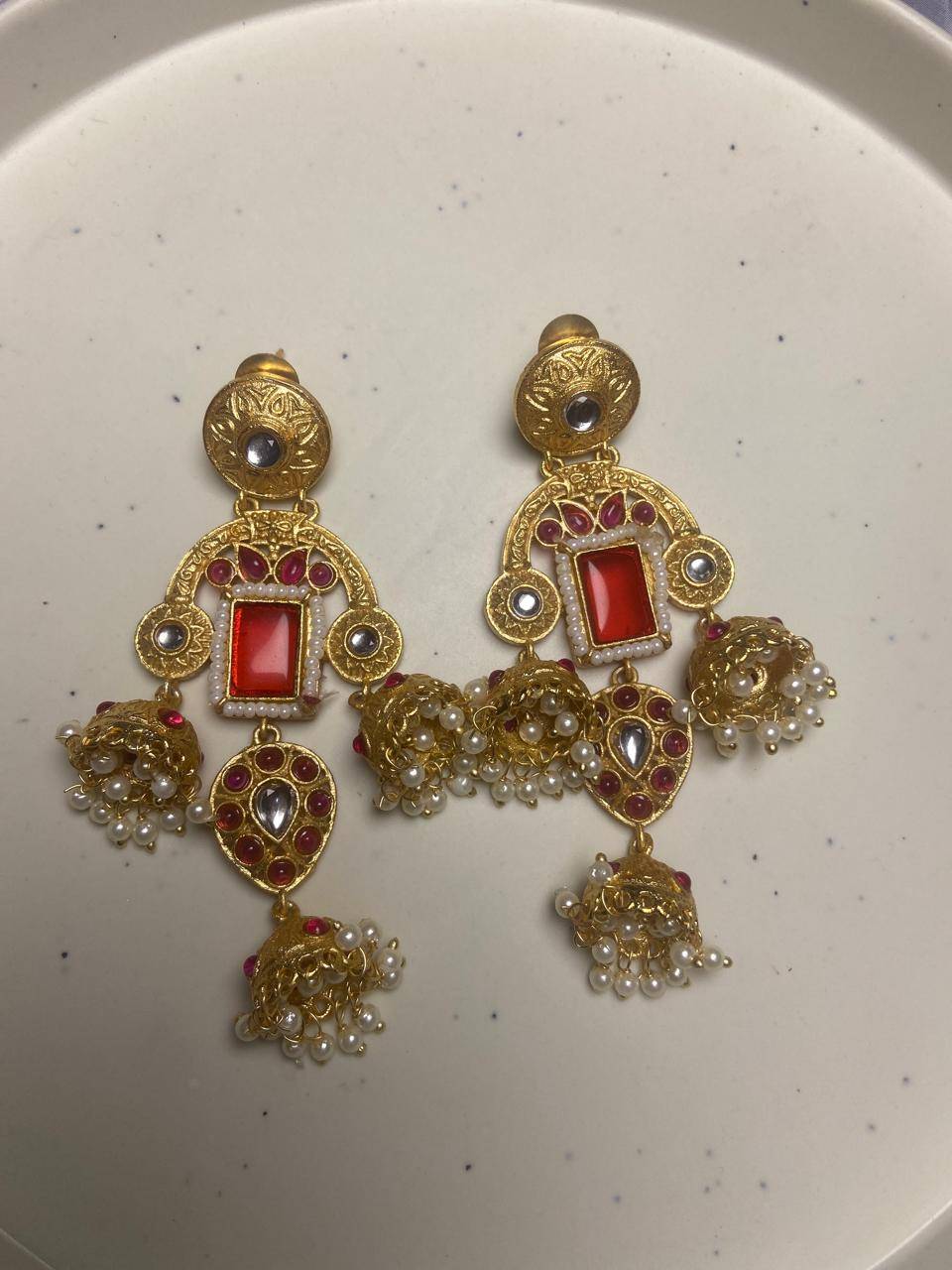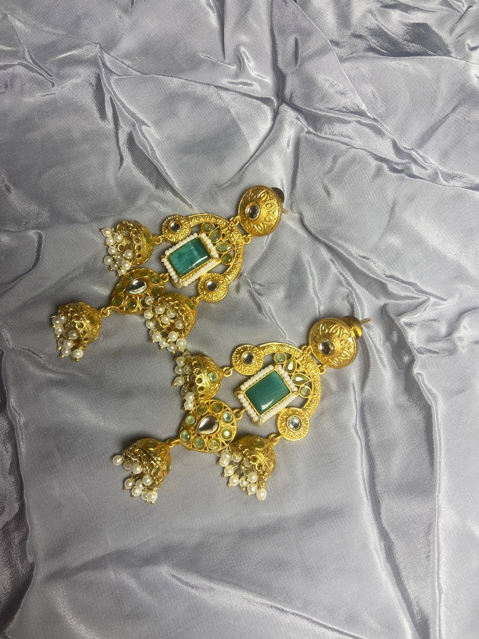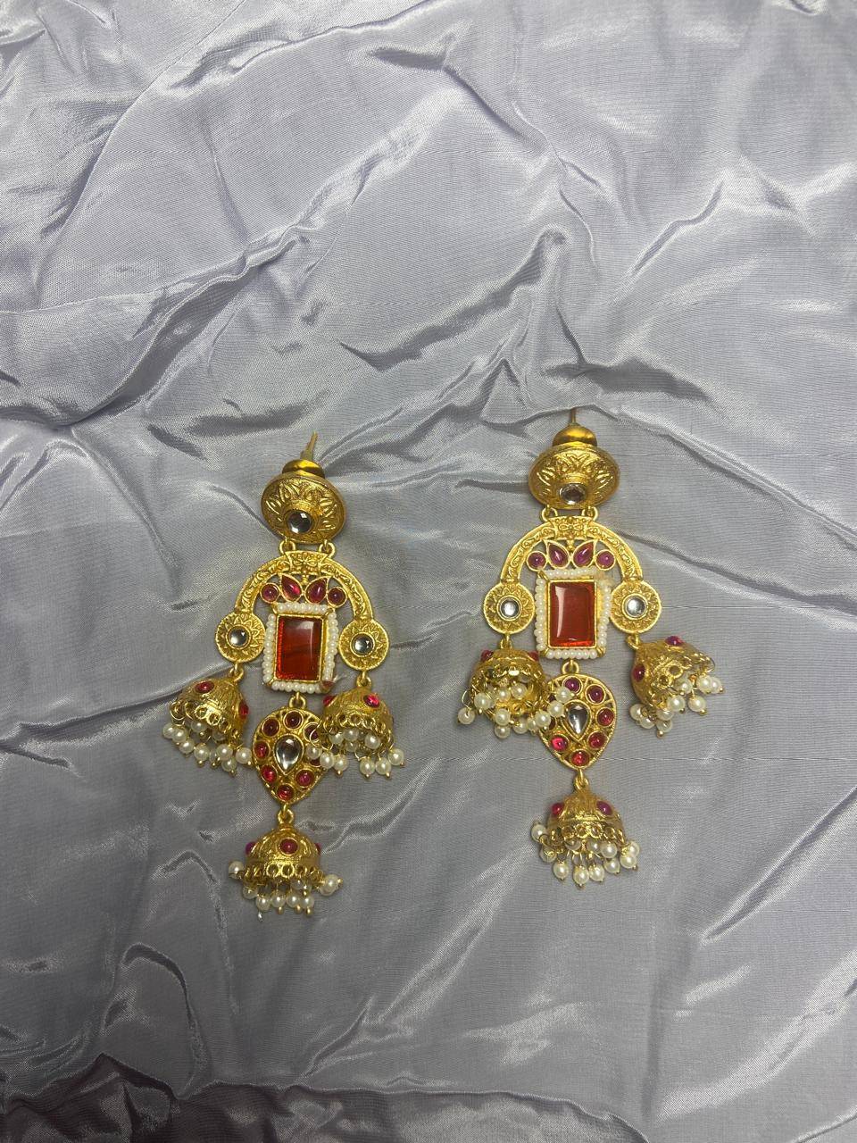 Rooted in timeless Indian artistry, these Stile Sovrano Kashmiri Inspired Kundan Jhumki Earrings are crafted to celebrate heritage elegance with a regal presence. The design features a bold rectangular statement stone framed by delicate pearl detailing and surrounded by kundan-style embellishments. The graceful arch structure flows into traditional jhumki drops enriched with pearl clusters, creating beautiful movement and a rich festive appeal. Finished in a luminous gold-toned polish, these earrings balance statement grandeur with comfortable wear. Perfect for weddings, festive occasions, and special cultural celebrations, this pair is designed for women who appreciate traditional craftsmanship blended with refined luxury.