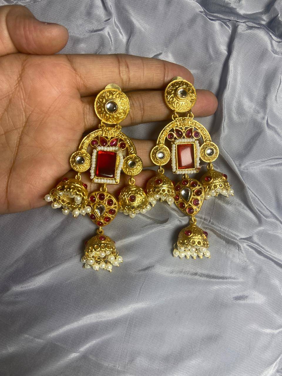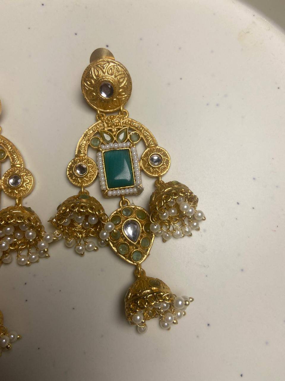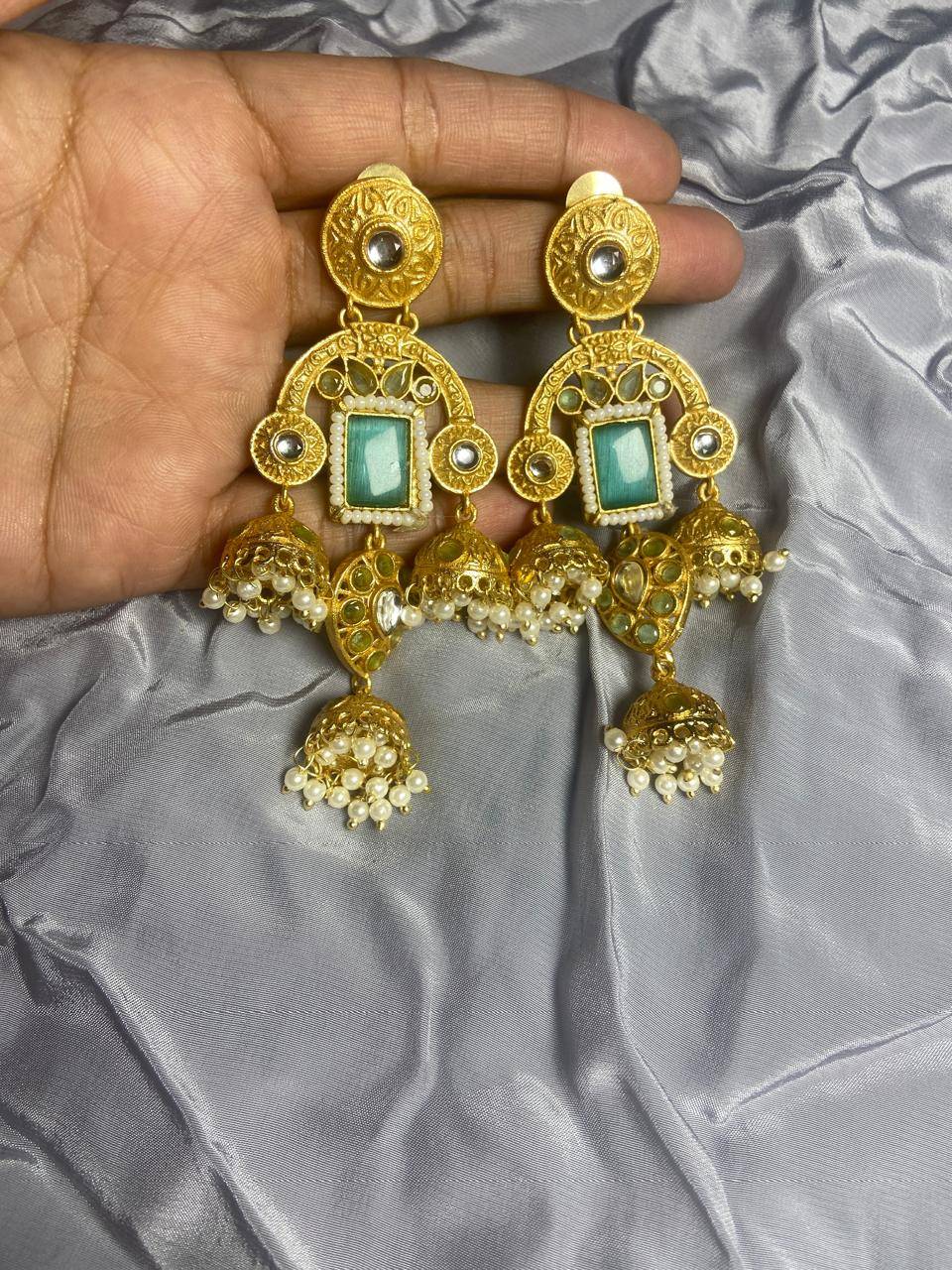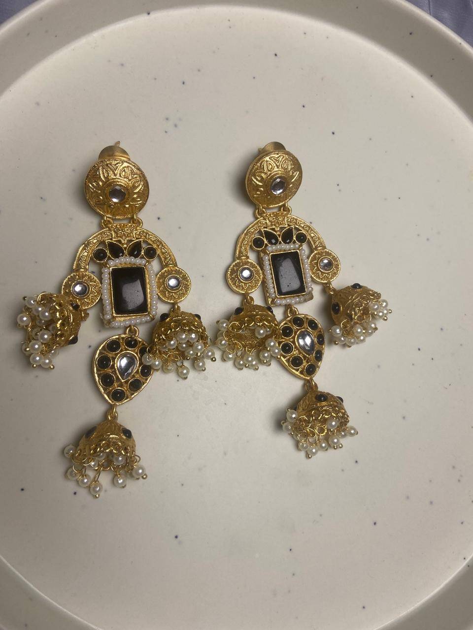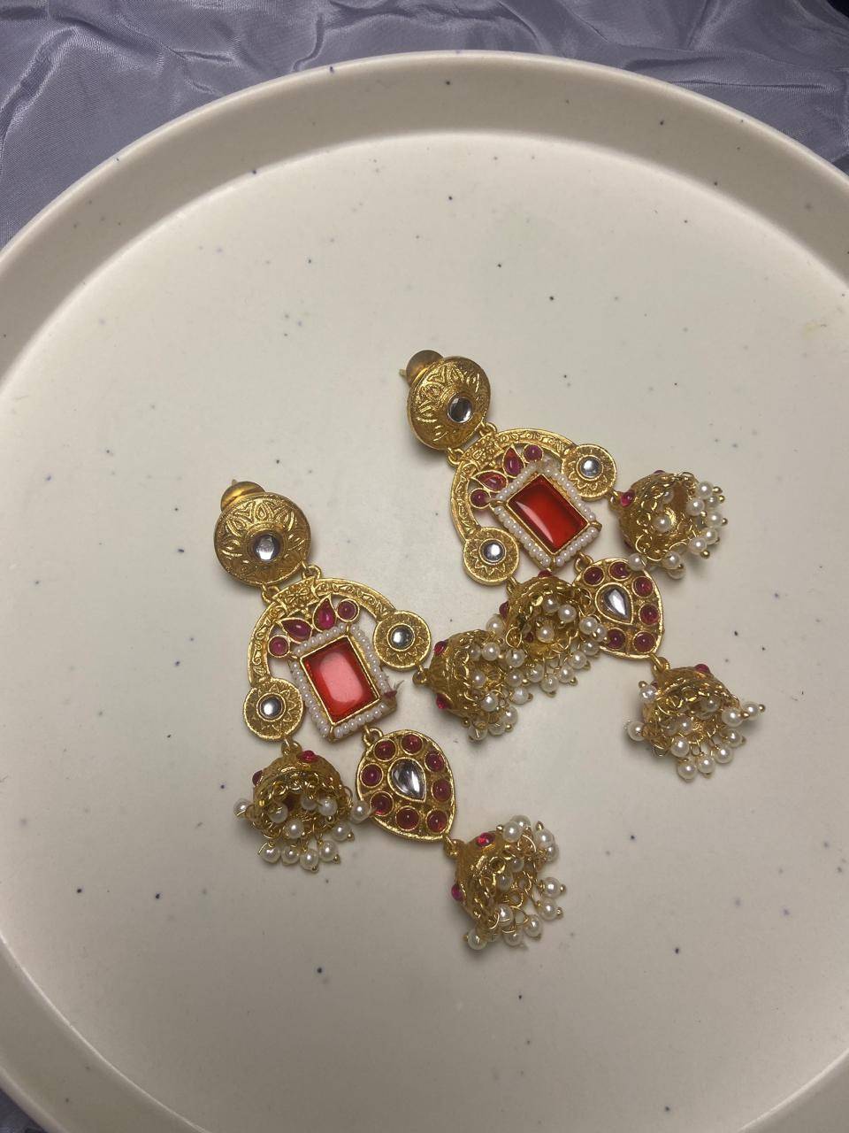 Rooted in timeless Indian artistry, these Stile Sovrano Kashmiri Inspired Kundan Jhumki Earrings are crafted to celebrate heritage elegance with a regal presence. The design features a bold rectangular statement stone framed by delicate pearl detailing and surrounded by kundan-style embellishments. The graceful arch structure flows into traditional jhumki drops enriched with pearl clusters, creating beautiful movement and a rich festive appeal. Finished in a luminous gold-toned polish, these earrings balance statement grandeur with comfortable wear. Perfect for weddings, festive occasions, and special cultural celebrations, this pair is designed for women who appreciate traditional craftsmanship blended with refined luxury.