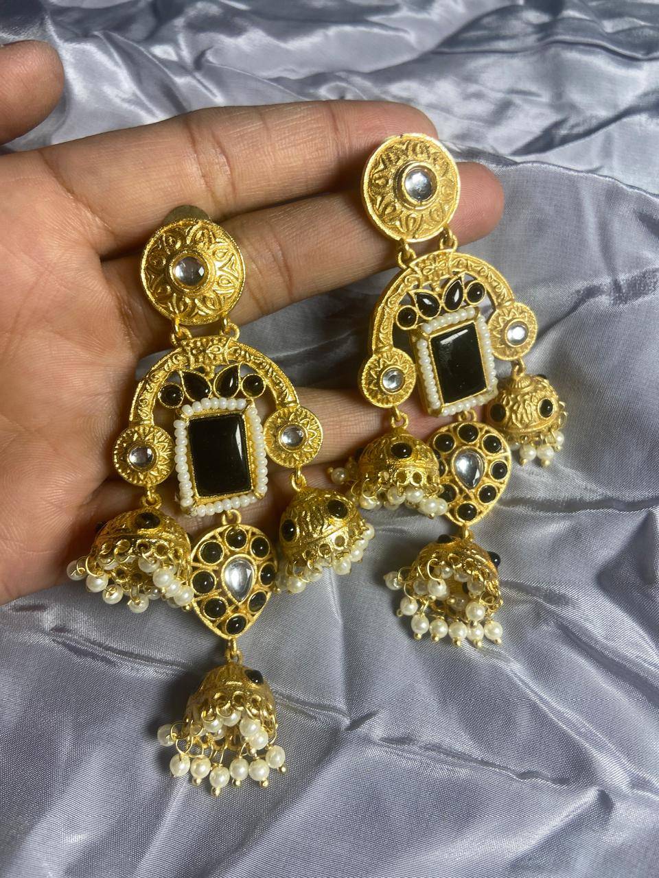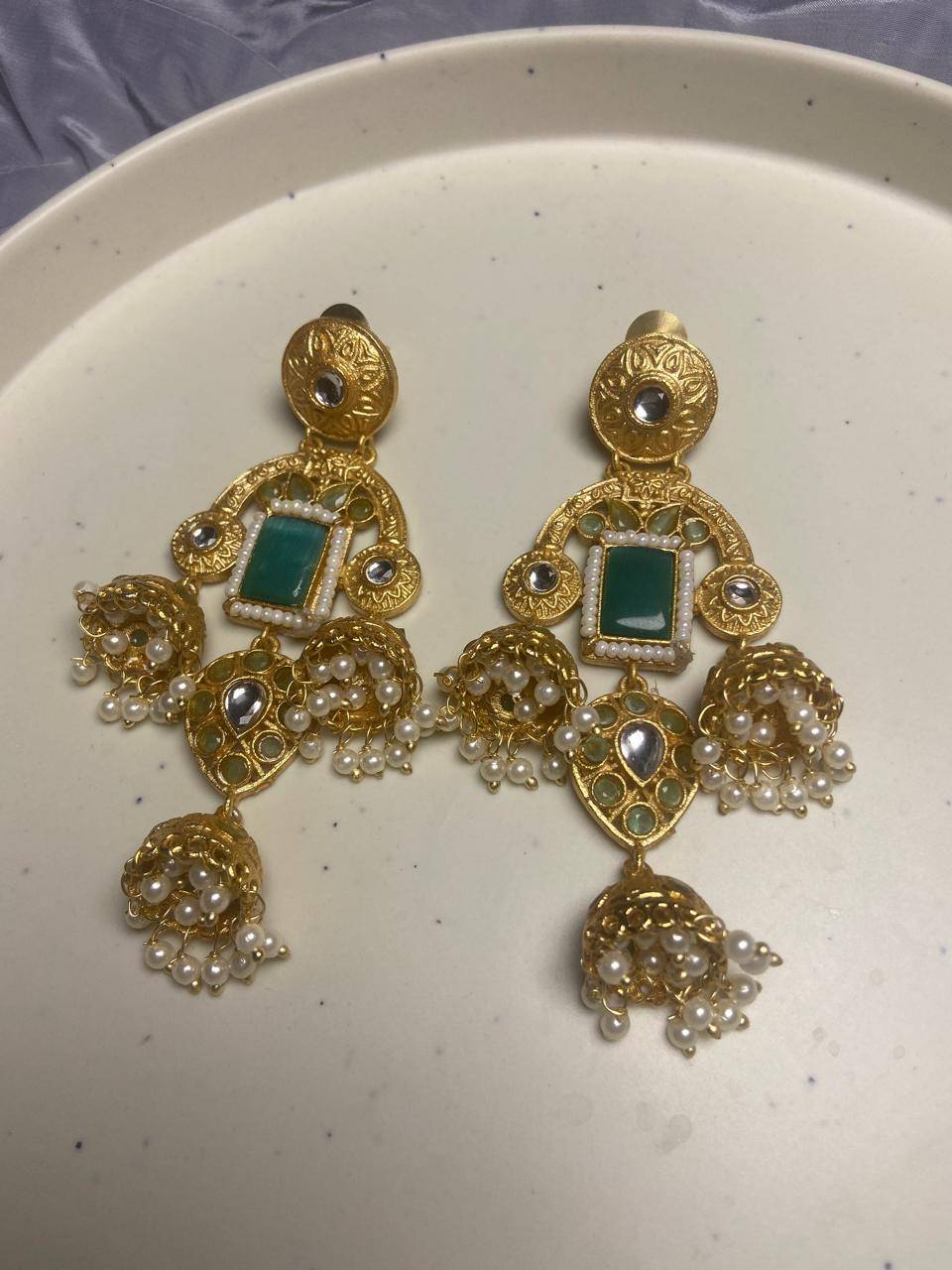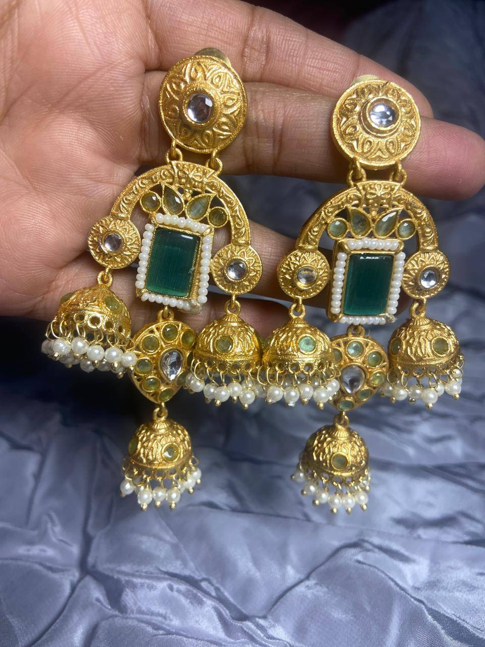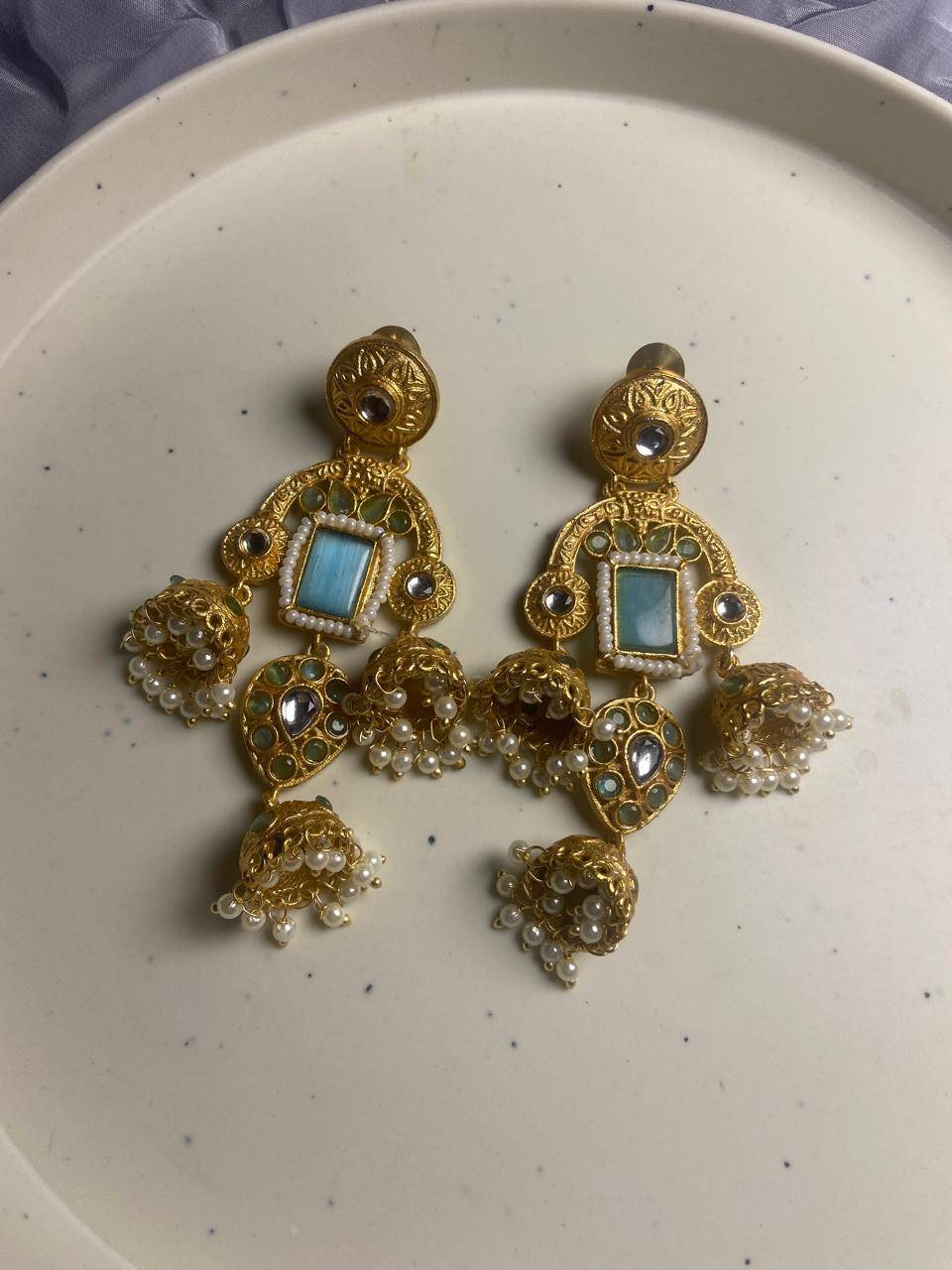 Rooted in timeless Indian artistry, these Stile Sovrano Kashmiri Inspired Kundan Jhumki Earrings are crafted to celebrate heritage elegance with a regal presence. The design features a bold rectangular statement stone framed by delicate pearl detailing and surrounded by kundan-style embellishments. The graceful arch structure flows into traditional jhumki drops enriched with pearl clusters, creating beautiful movement and a rich festive appeal. Finished in a luminous gold-toned polish, these earrings balance statement grandeur with comfortable wear. Perfect for weddings, festive occasions, and special cultural celebrations, this pair is designed for women who appreciate traditional craftsmanship blended with refined luxury.