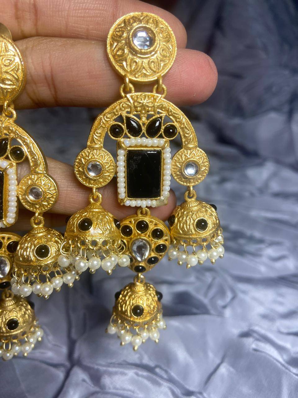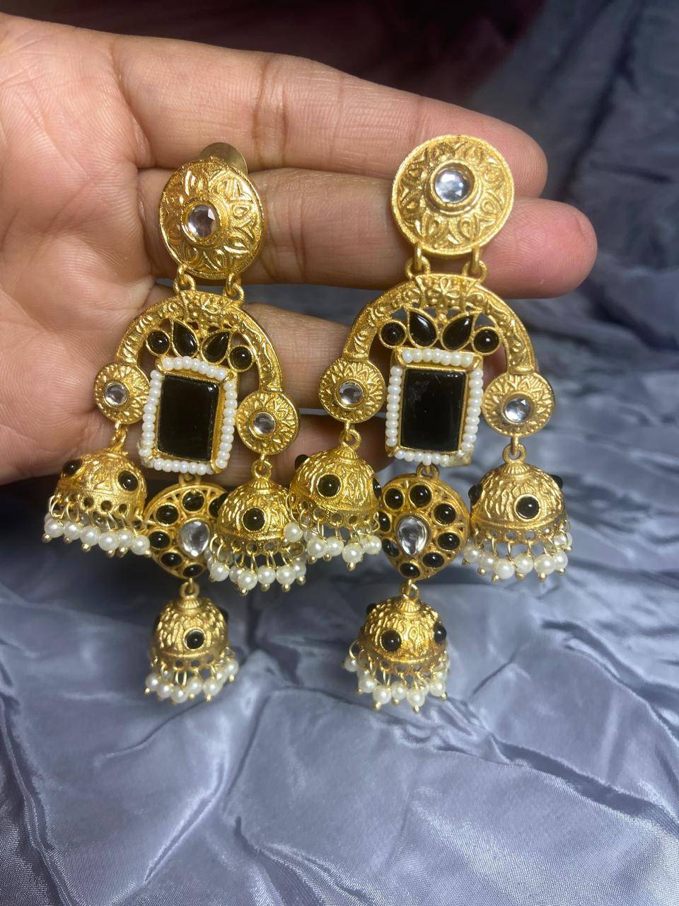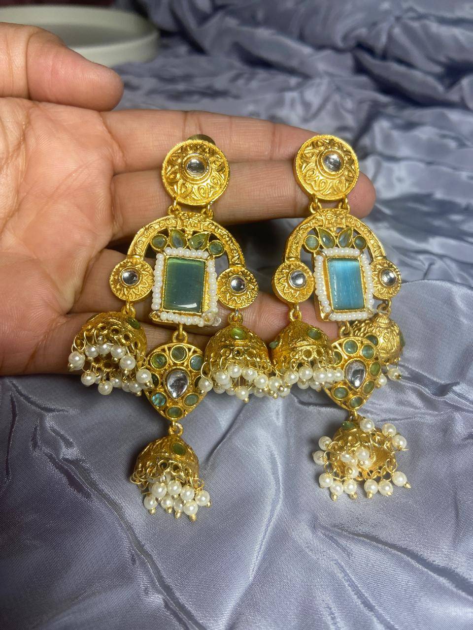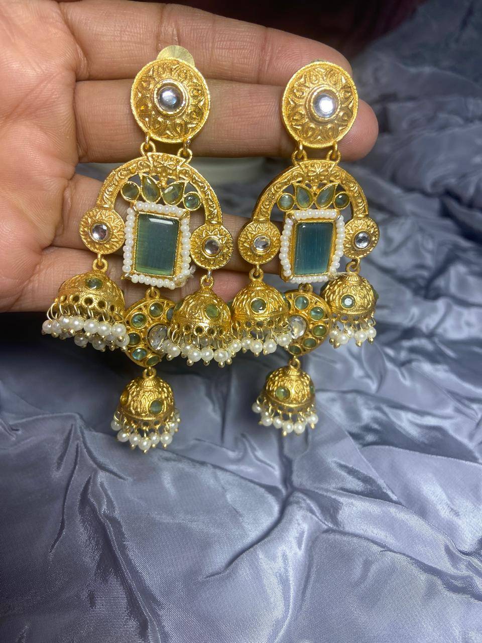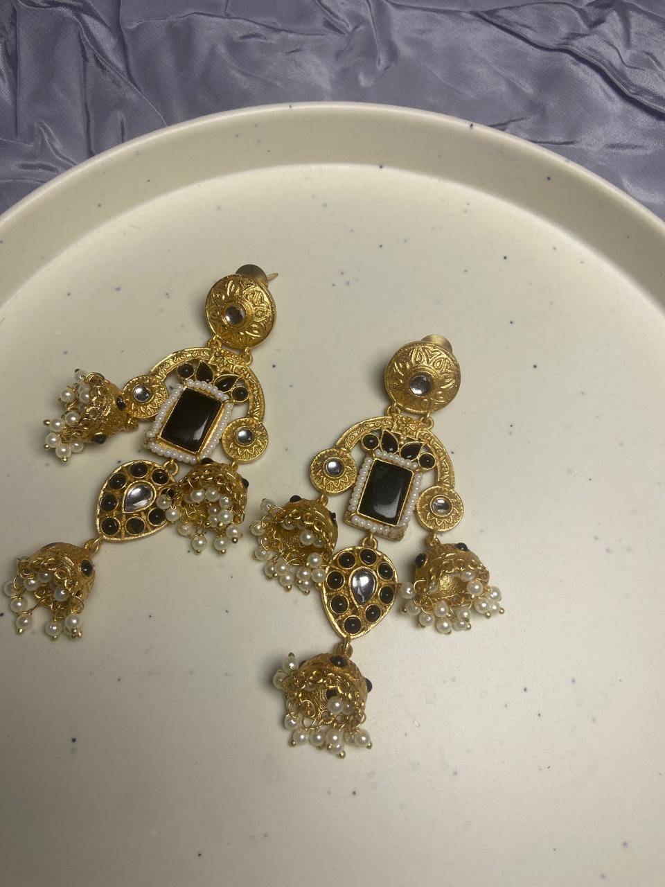 Rooted in timeless Indian artistry, these Stile Sovrano Kashmiri Inspired Kundan Jhumki Earrings are crafted to celebrate heritage elegance with a regal presence. The design features a bold rectangular statement stone framed by delicate pearl detailing and surrounded by kundan-style embellishments. The graceful arch structure flows into traditional jhumki drops enriched with pearl clusters, creating beautiful movement and a rich festive appeal. Finished in a luminous gold-toned polish, these earrings balance statement grandeur with comfortable wear. Perfect for weddings, festive occasions, and special cultural celebrations, this pair is designed for women who appreciate traditional craftsmanship blended with refined luxury.