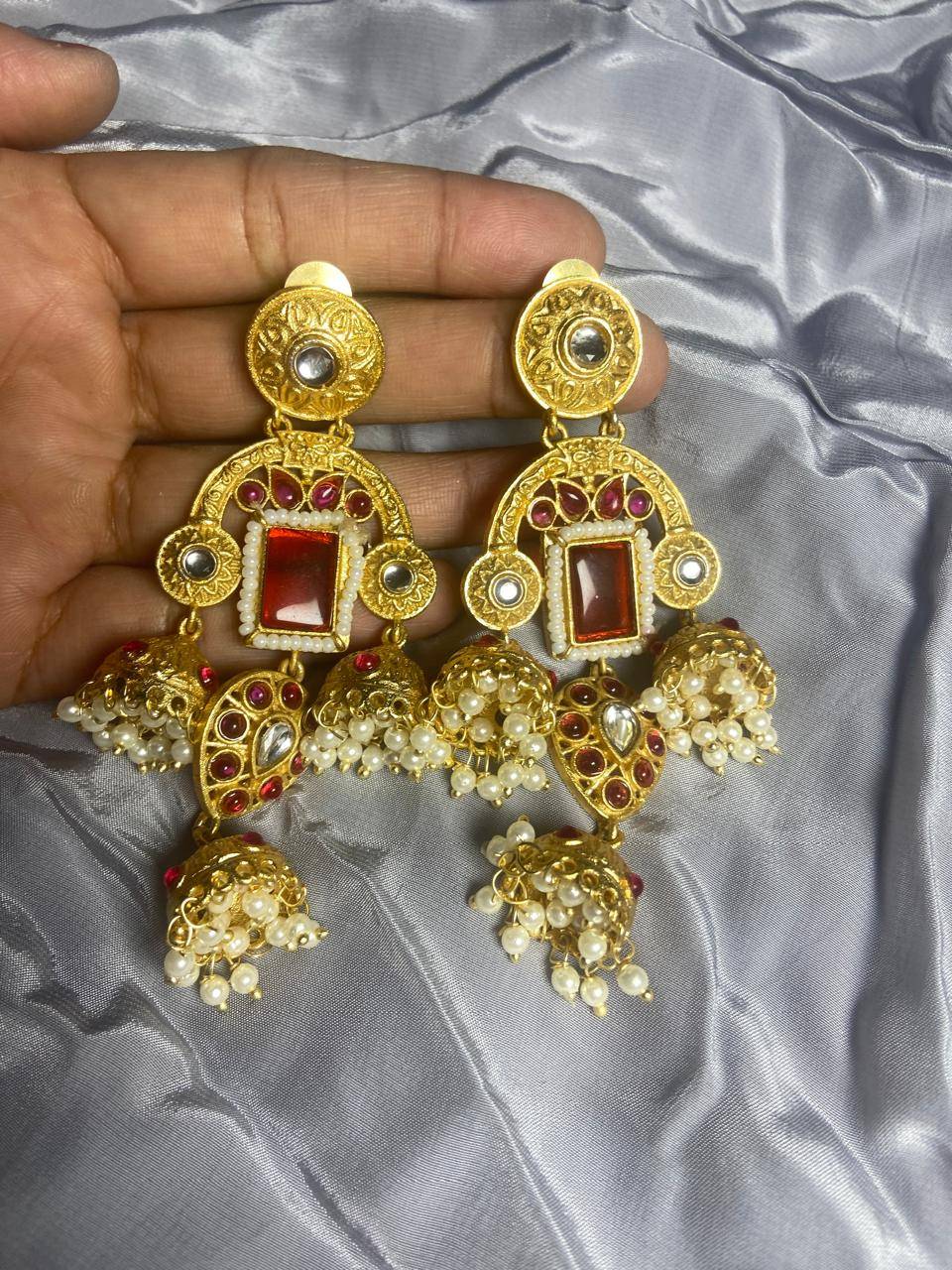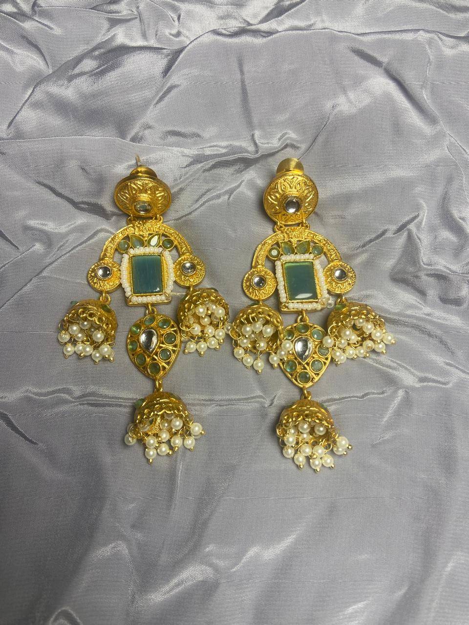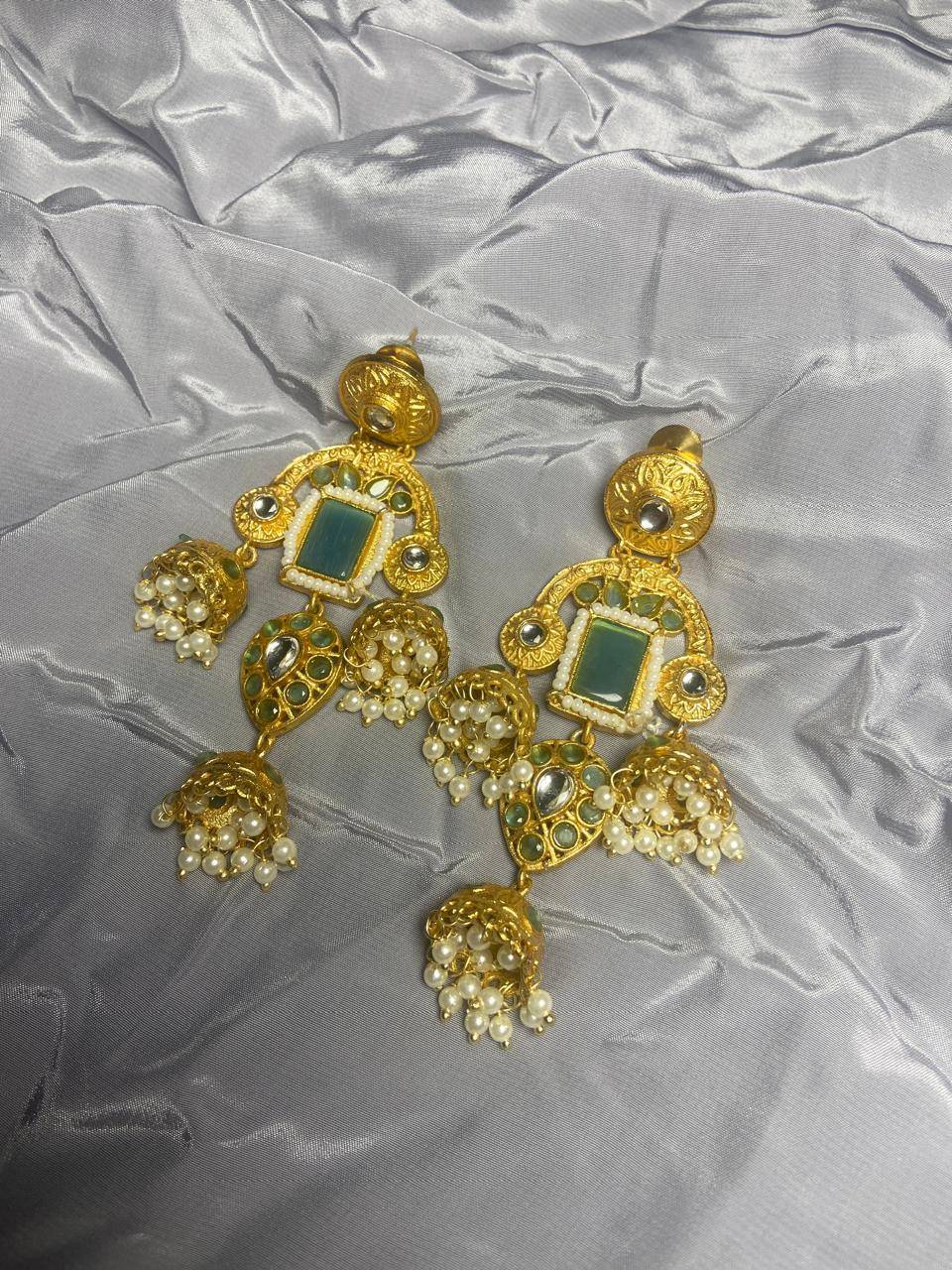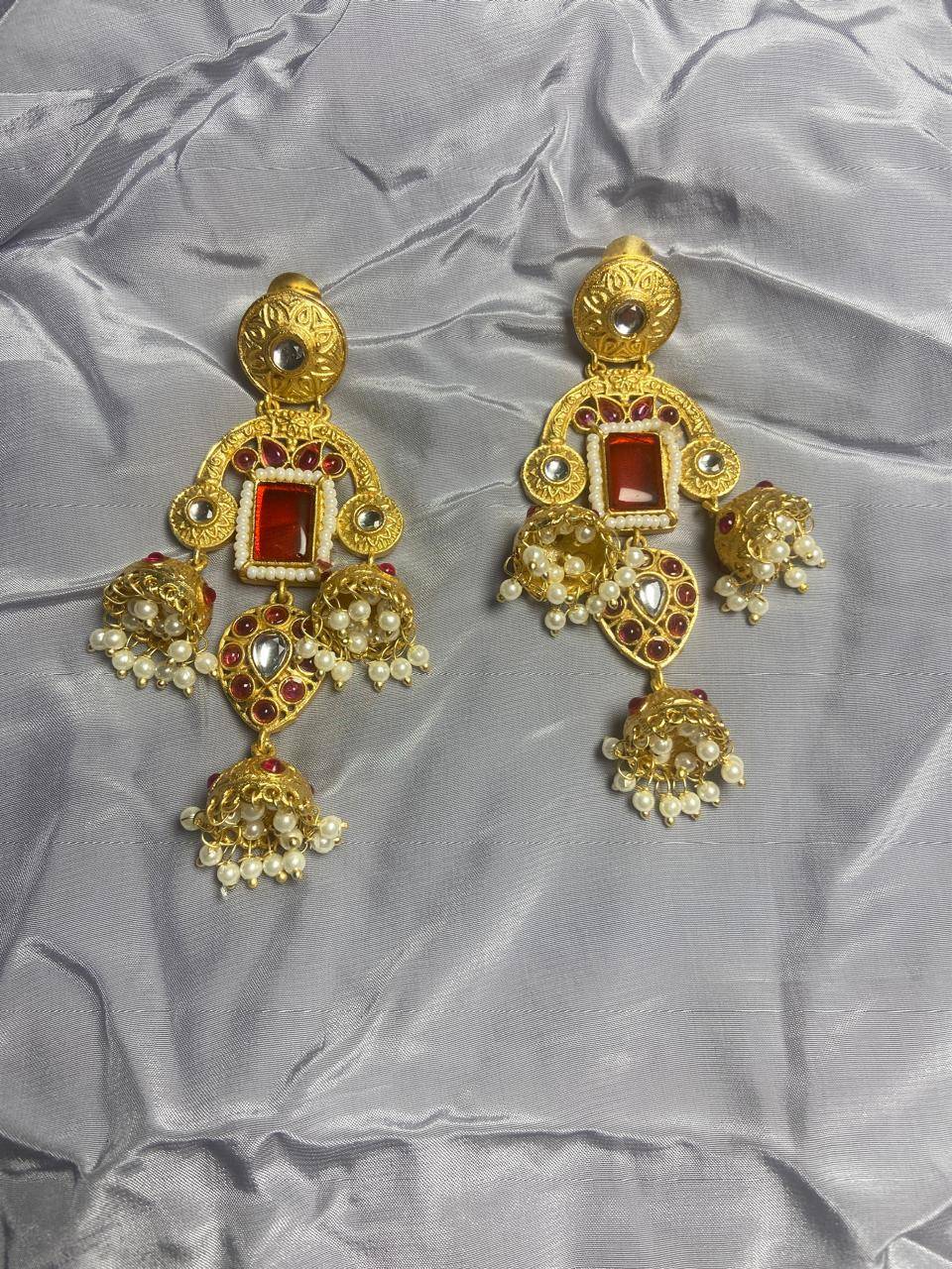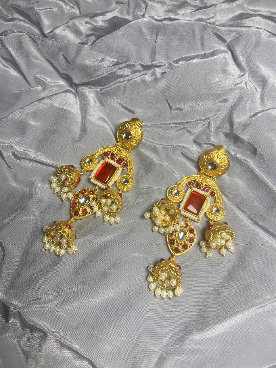 Kashmiri Inspired Kundan Jhumki Earrings with Pearl Clusters & Statement Stone | Traditional Ethnic Jewelry for Women
