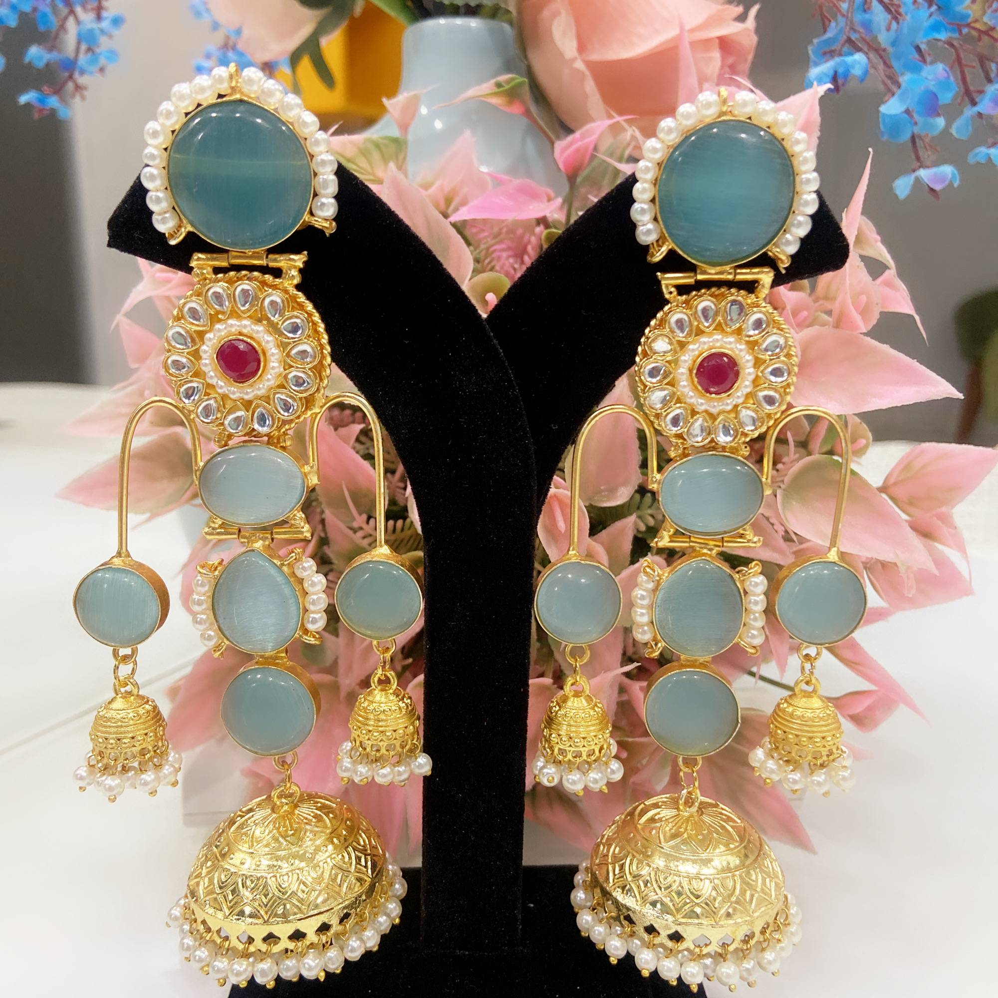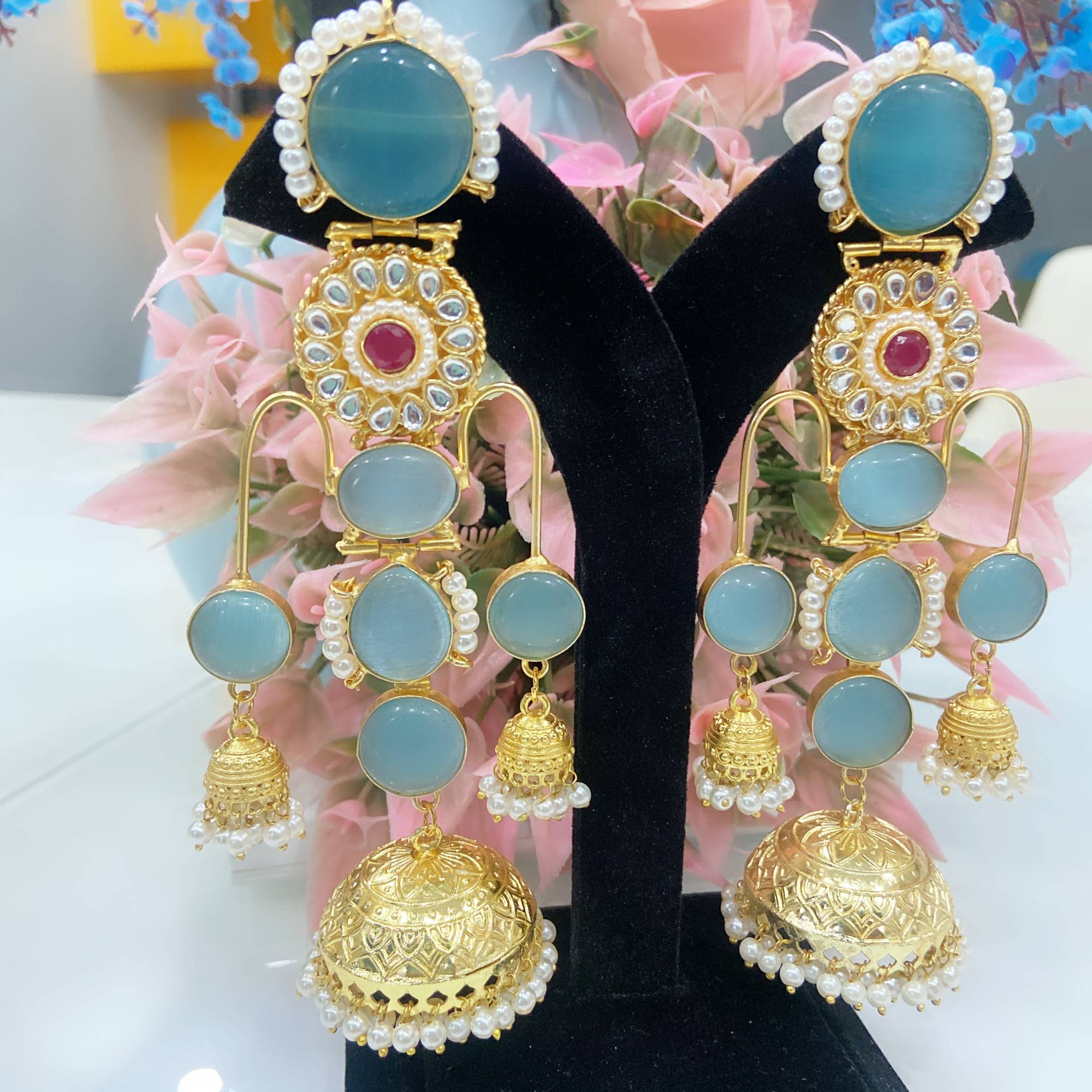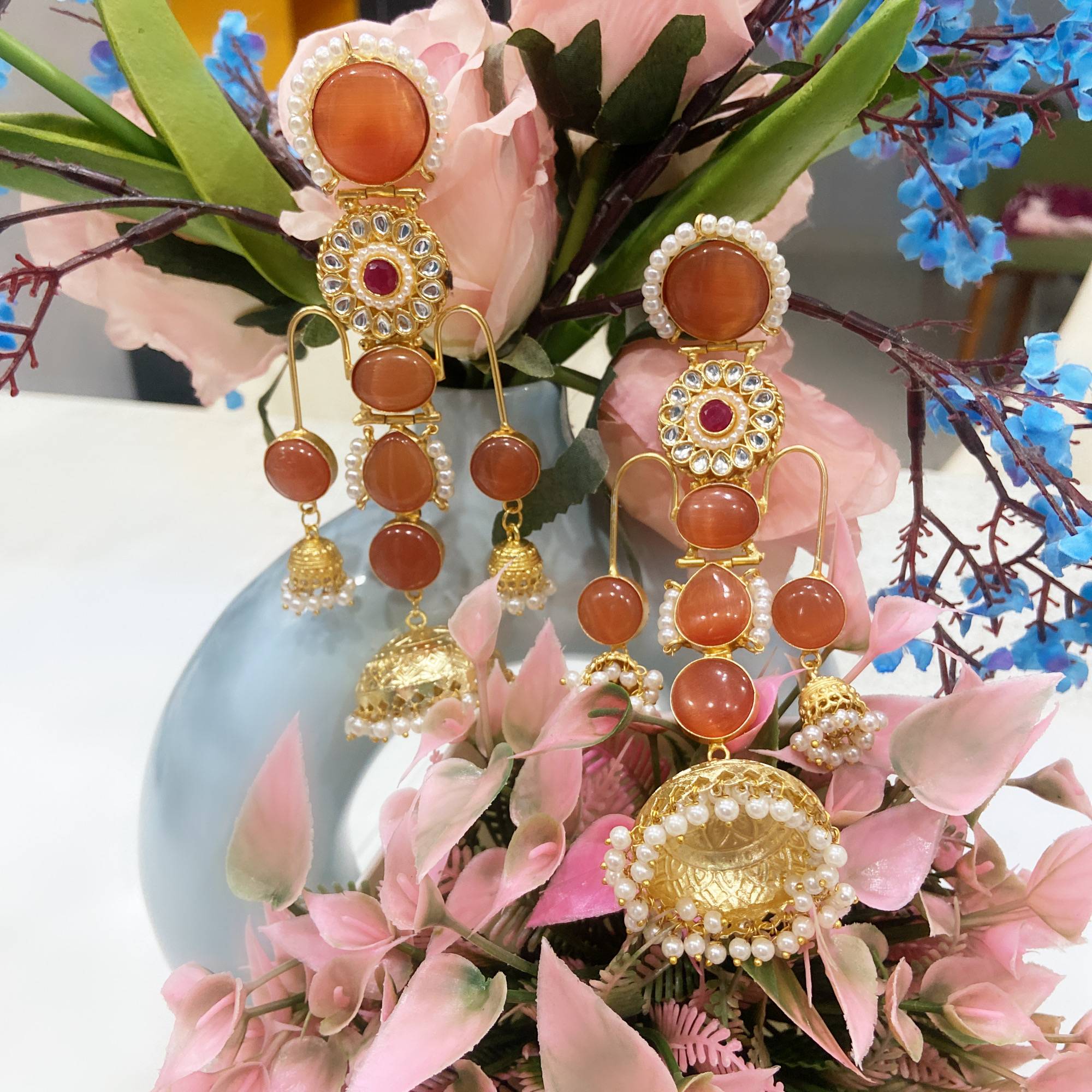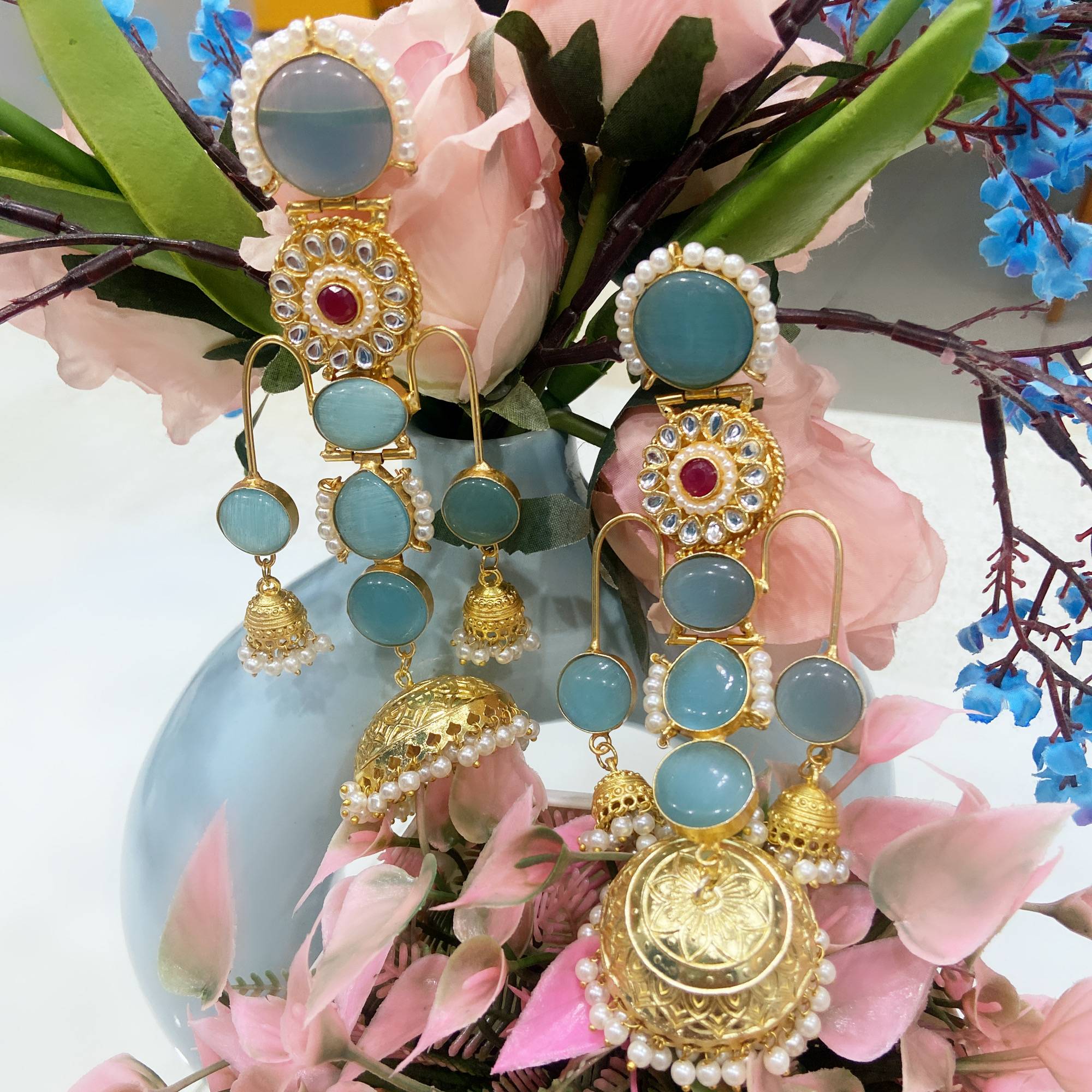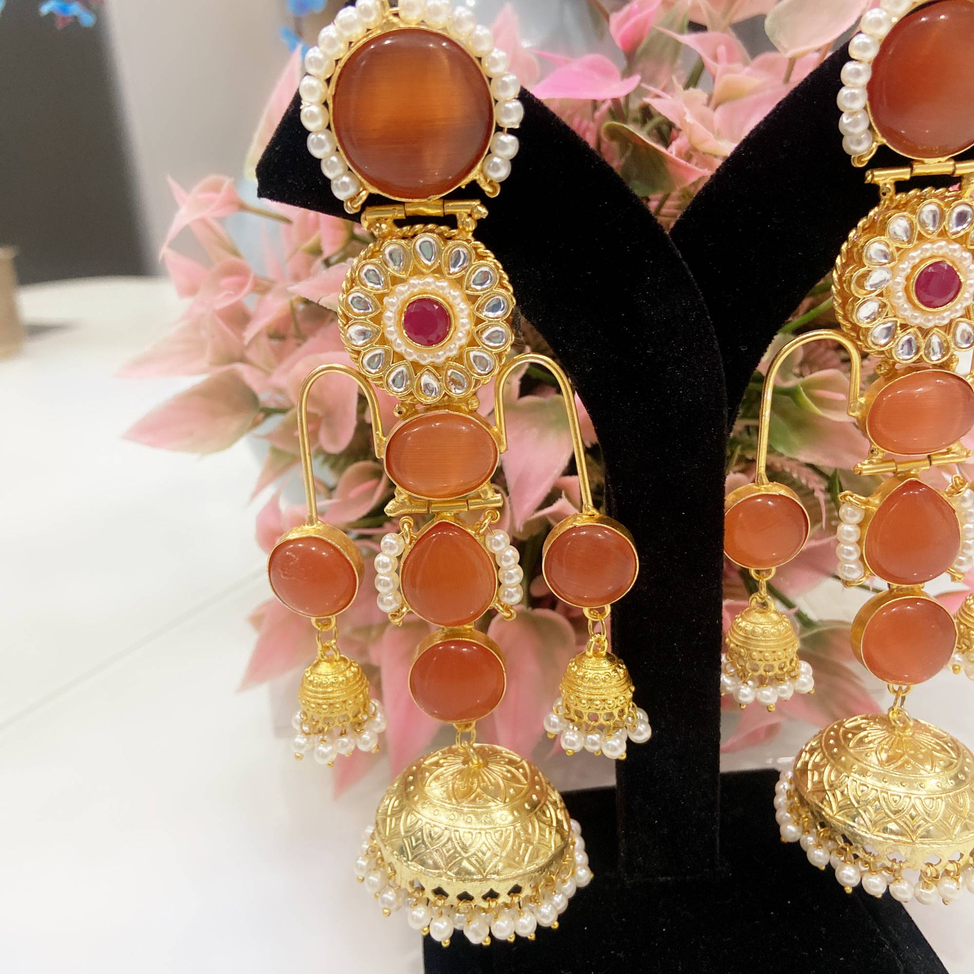 Crafted for grandeur, these majestic layered jhumkas feature pearl-bordered studs, a kundan cluster with a ruby-red centerpiece, and cascading orange-brown or aqua blue stones in circular and teardrop shapes. Finished with a trio of golden jhumkas — two petite and one grand dome bordered with pearls — this design embodies bridal royalty and festive elegance.