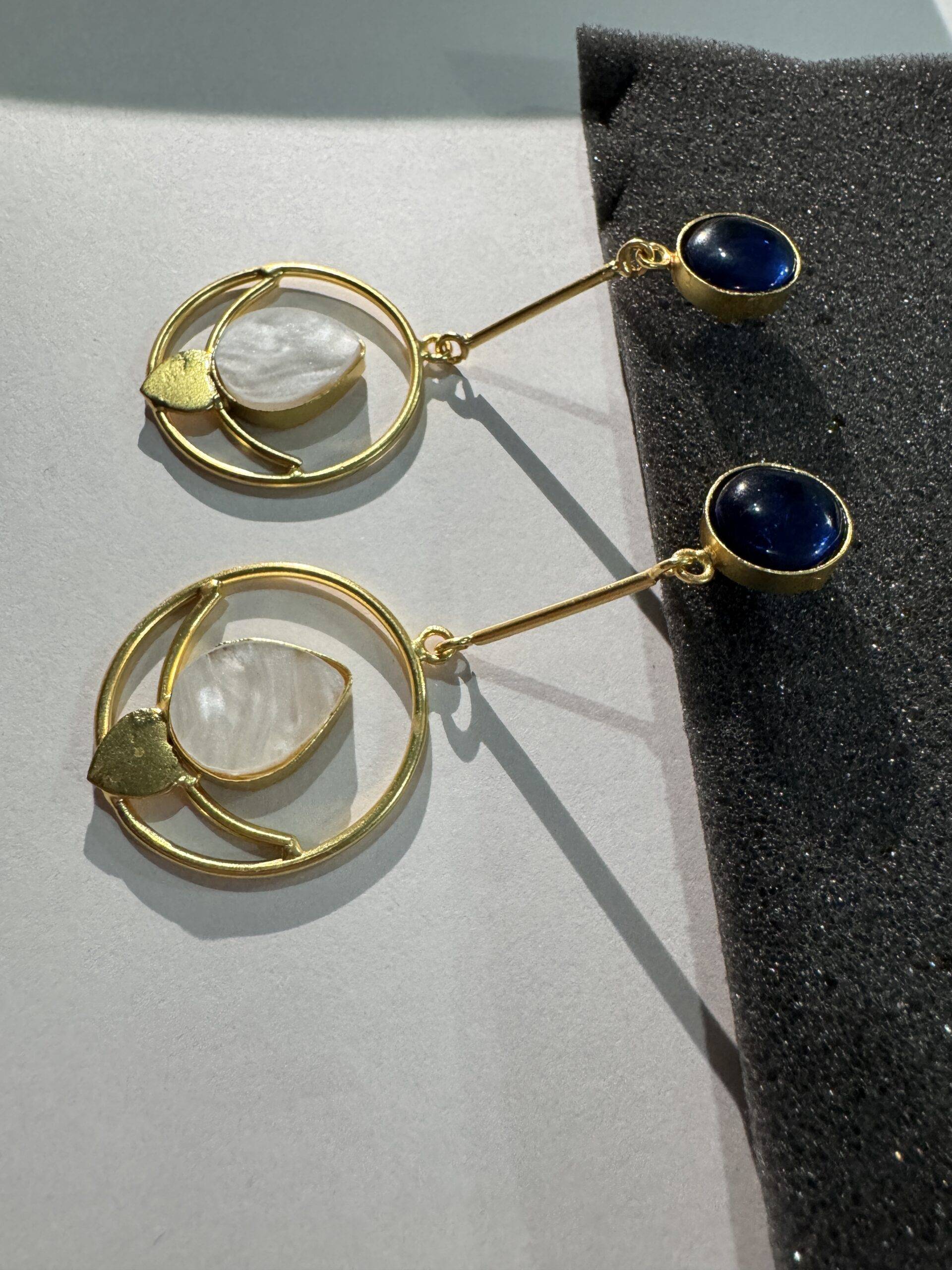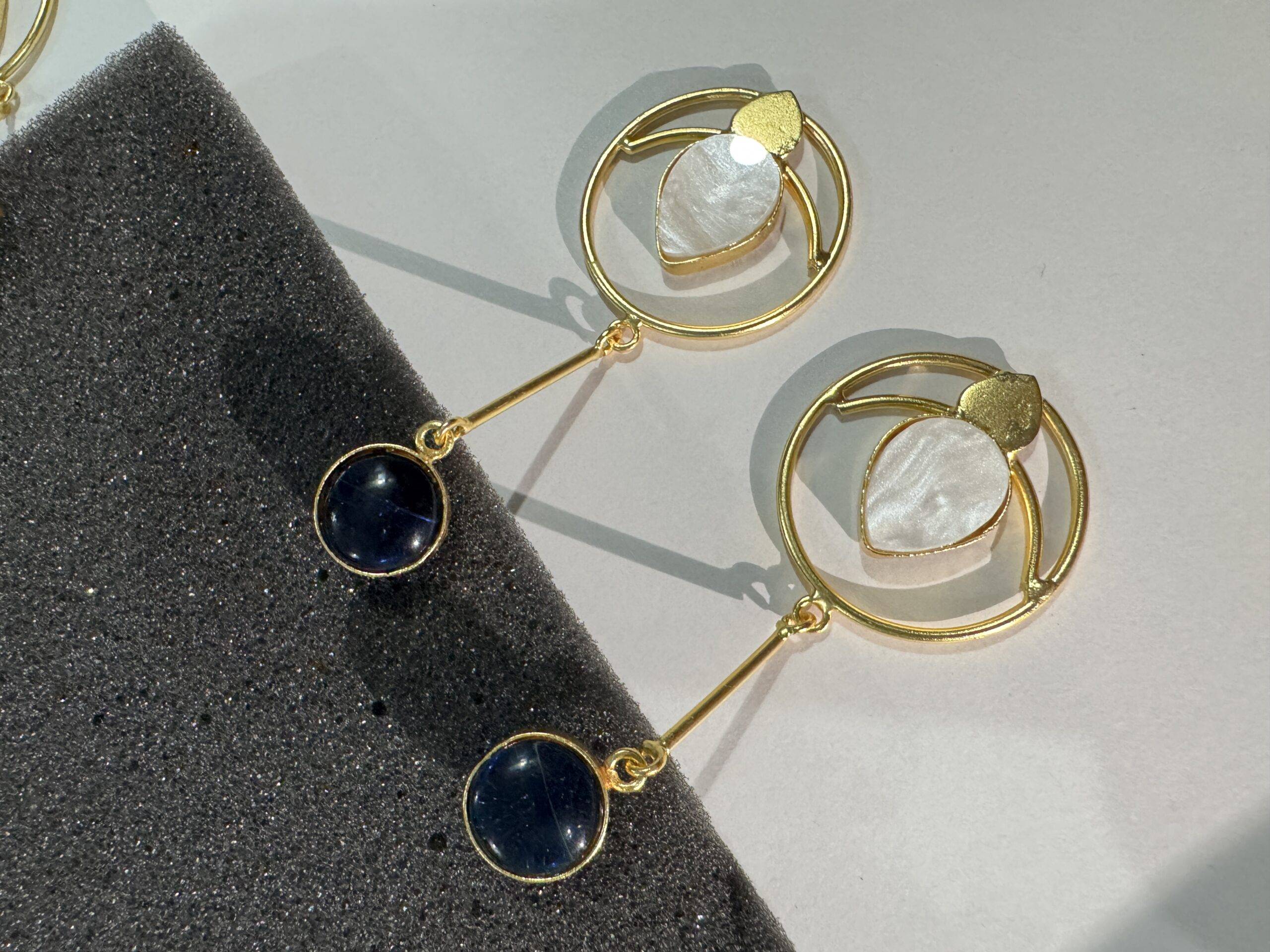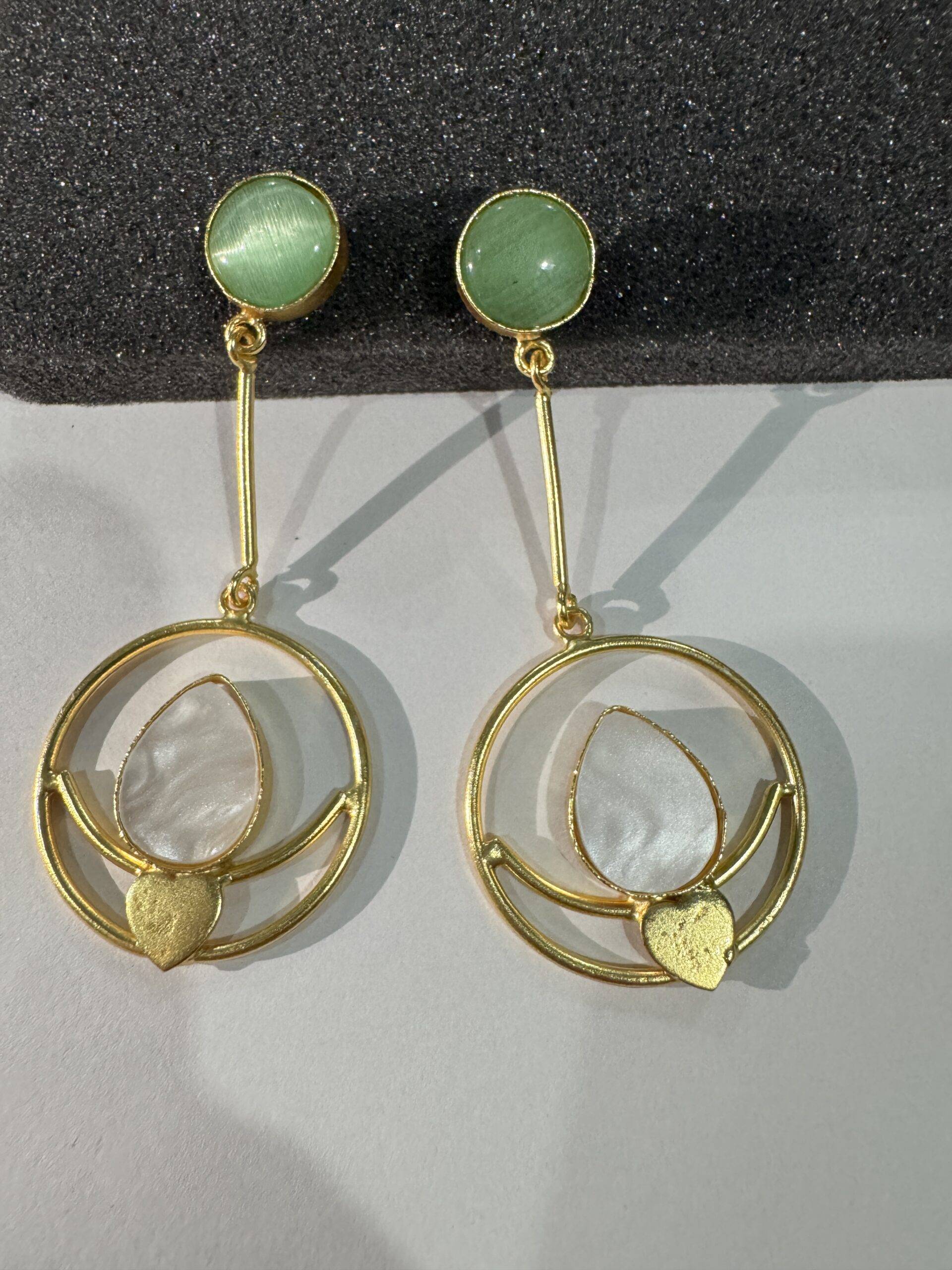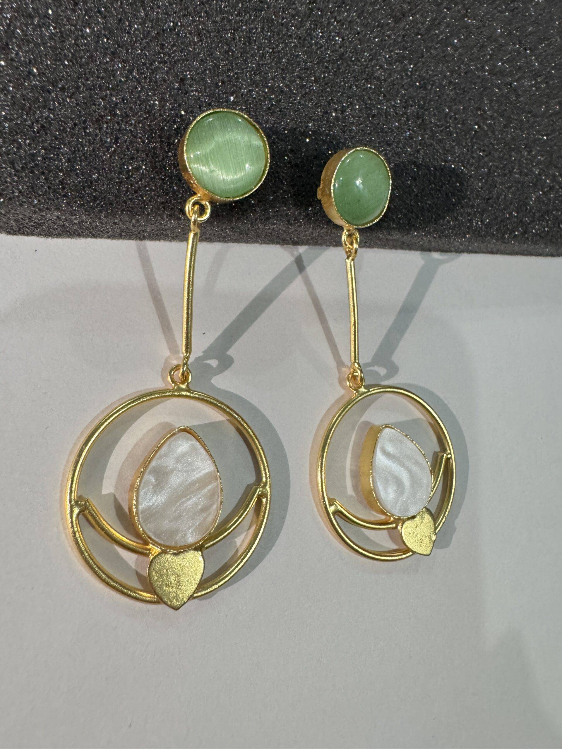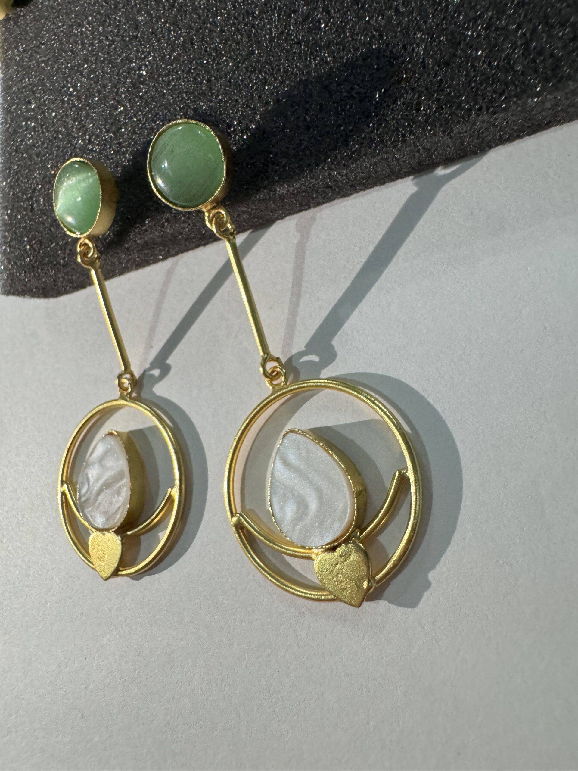 Discover the Oro e Loto earrings by Stile Sovrano, where smooth green or black studs connect to sleek golden bars and luminous hoops. Featuring a delicate white lotus-inspired stone framed in subtle gold, these earrings blend symbolism and style. Perfect for festive occasions, traditional attire, or serene daytime sophistication, their refreshing palette of green, white, and gold offers versatile elegance.