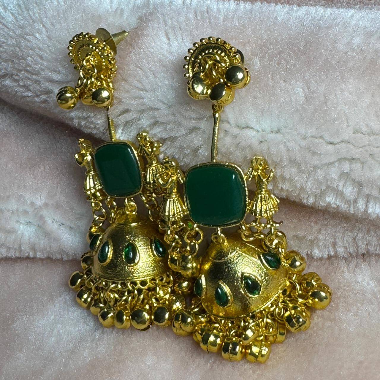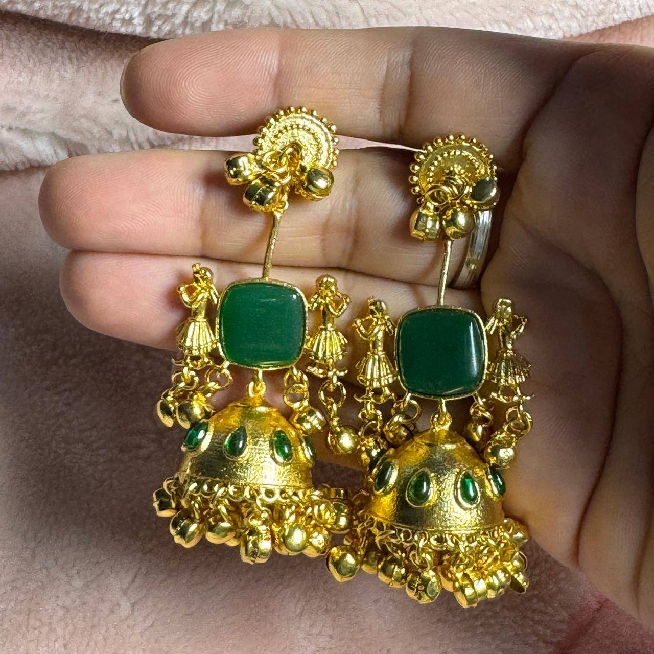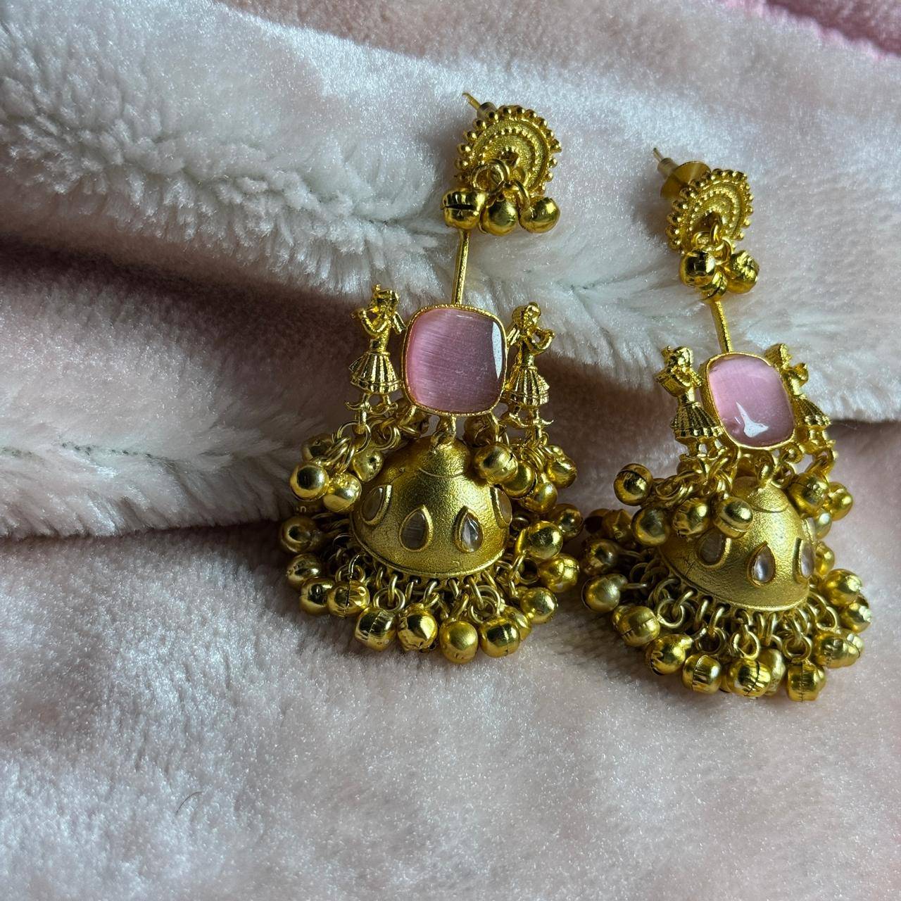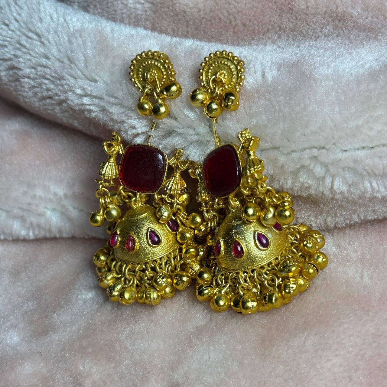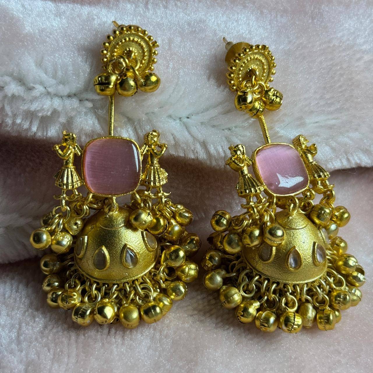 Heritage Temple-Inspired Design – Intricately crafted jhumka earrings featuring traditional Indian dancer motifs, inspired by classical artistry and timeless craftsmanship.