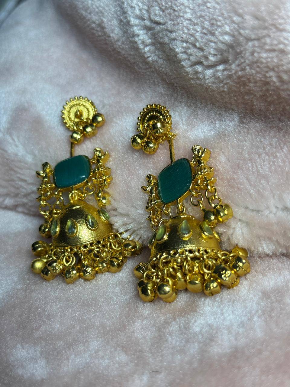 Each pair features a luminous gold-tone finish complemented by a cushion-cut gemstone accent, offering vibrant color contrast while maintaining a refined luxury feel. The detailed ghungroo-style bead drops add fluid movement, enhancing their festive charm without compromising comfort.
