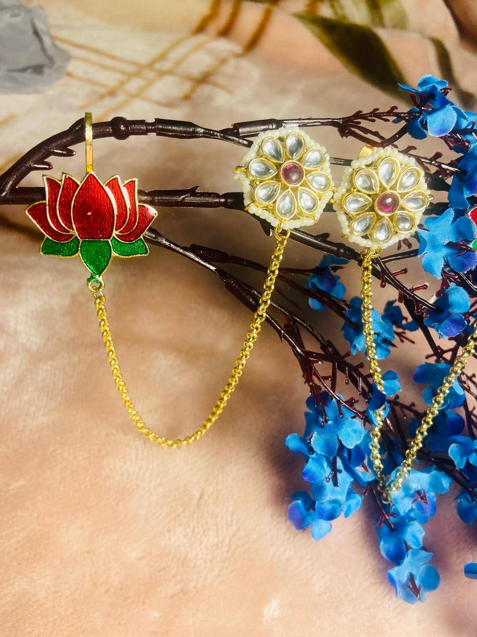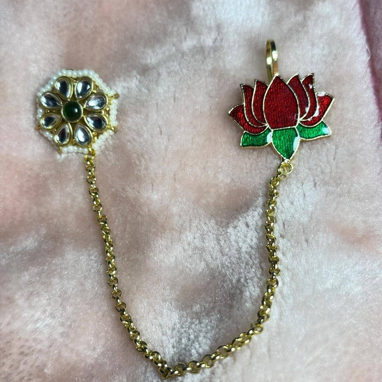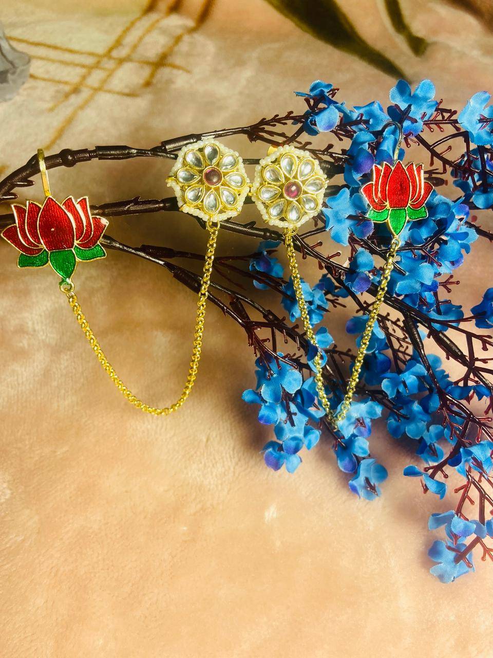 Meenakari & Kundan-Style Accents – Rich enamel lotus detailing paired with kundan-style stones and pearl-style borders for visual depth.
