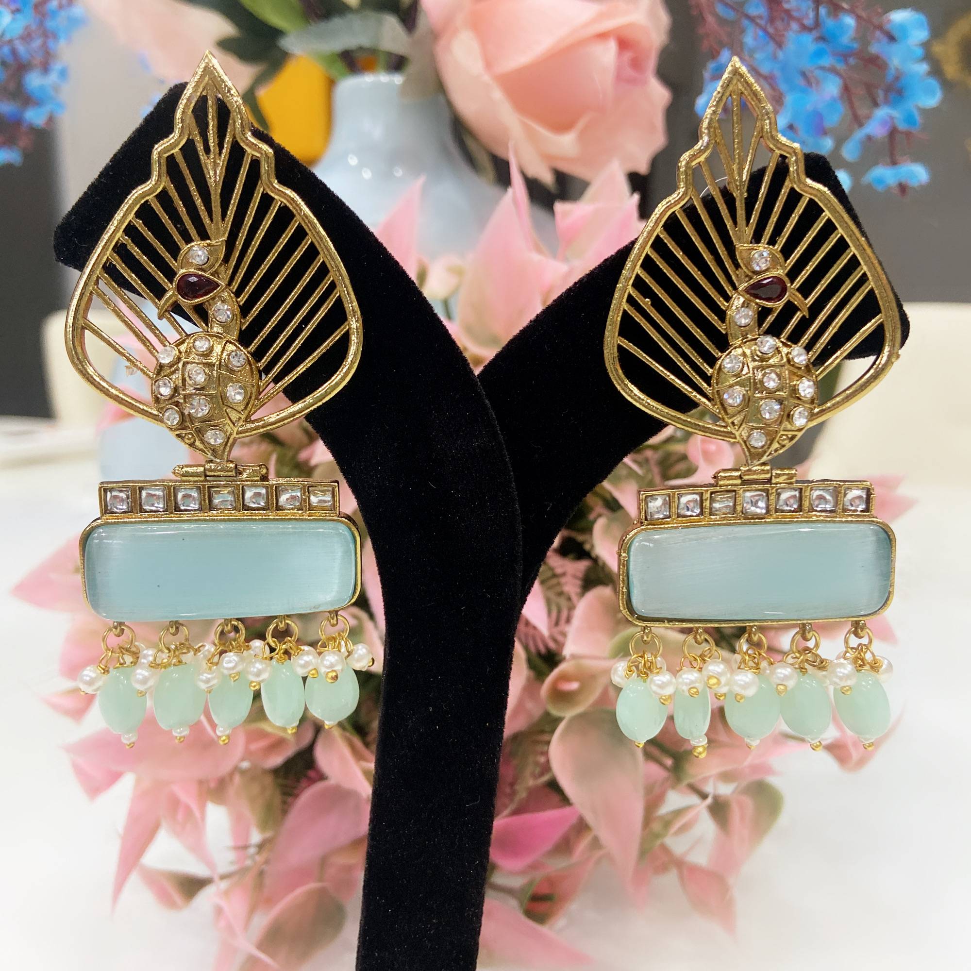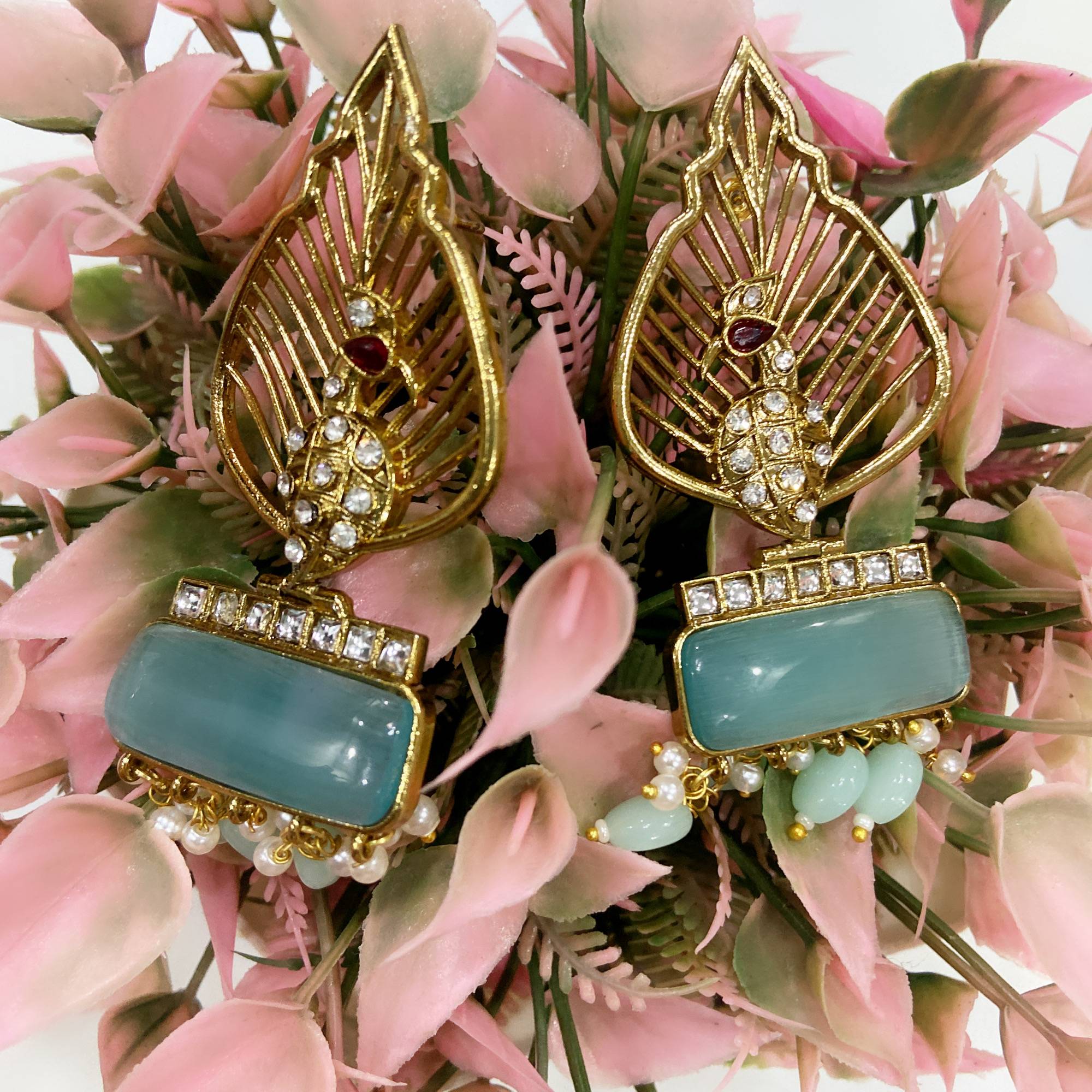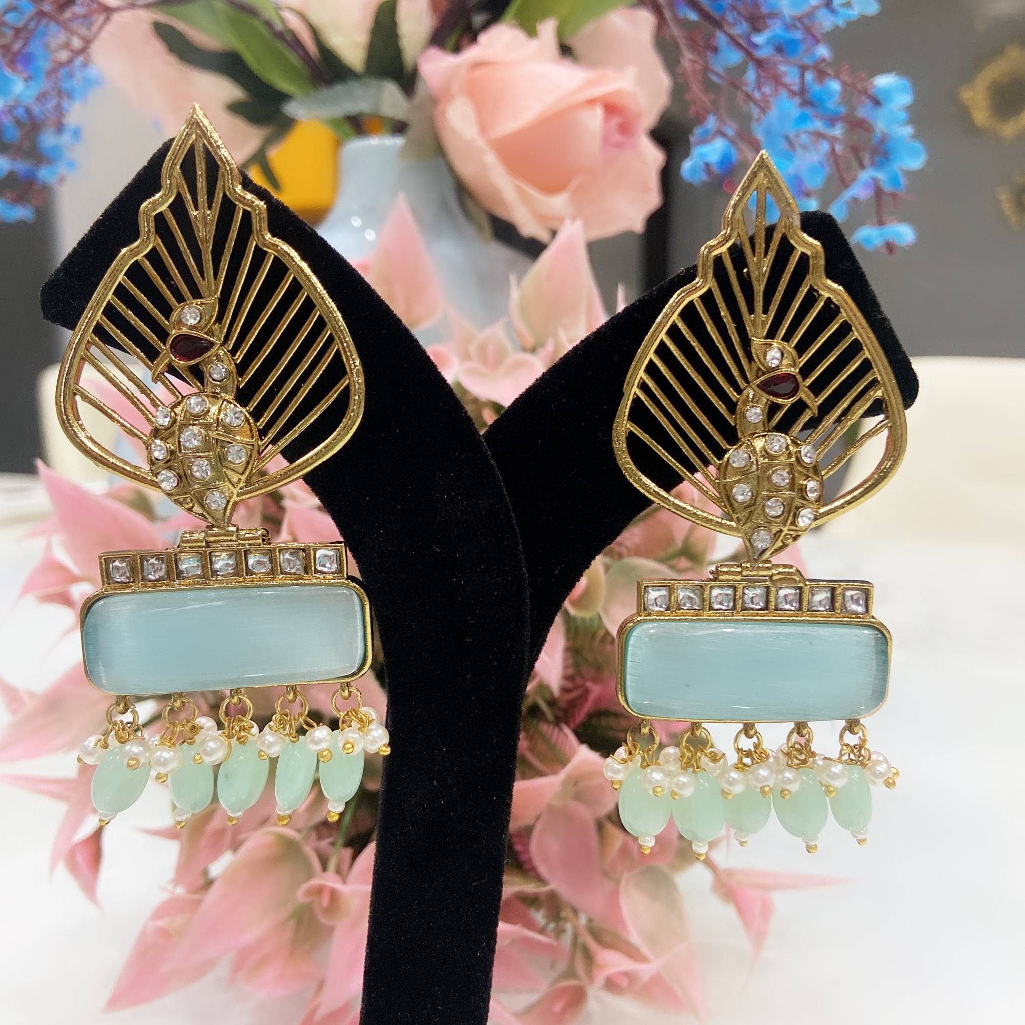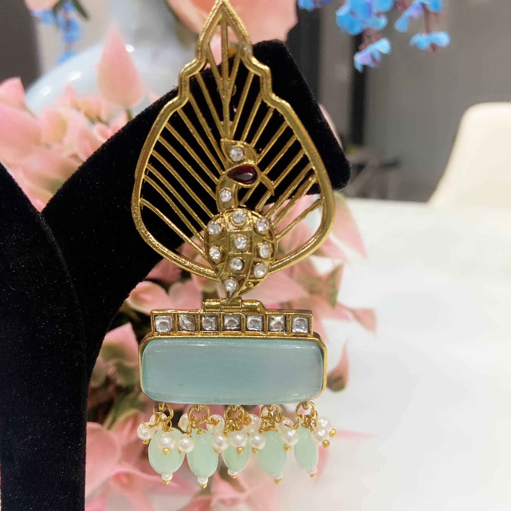Bring grace and grandeur to your look with the Peacock Radiance Chandbalis. These exquisite earrings feature a majestic peacock design in antique gold plating, encrusted with shimmering white stones and a striking maroon eye. Below it sits a row of square-cut embellishments followed by a horizontal mint-green stone bar, finishing with a cascade of soft green and pearl bead drops that sway with every move.