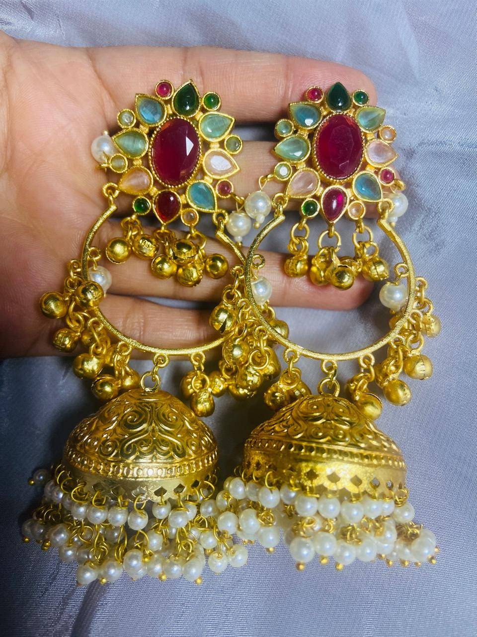 • Statement Hoop & Jhumka Fusion – Elegant circular gold-tone hoop adorned with ghungroo-style beads, leading to a carved dome jhumka with cascading pearl drops.