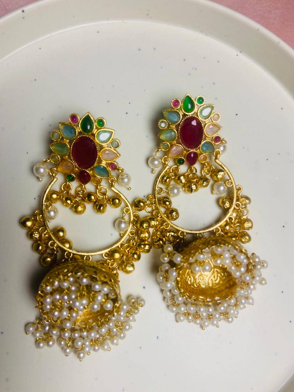 The Rajkumari Meherang Viraasat Pearl Jhumka Hoop Earrings by Stilesovrano embody the grandeur of Indian royal heritage with a contemporary silhouette. The intricate kundan-style floral top is adorned with a rich ruby-tone center stone, encircled by multicolor accents that reflect timeless craftsmanship and regal aesthetics.