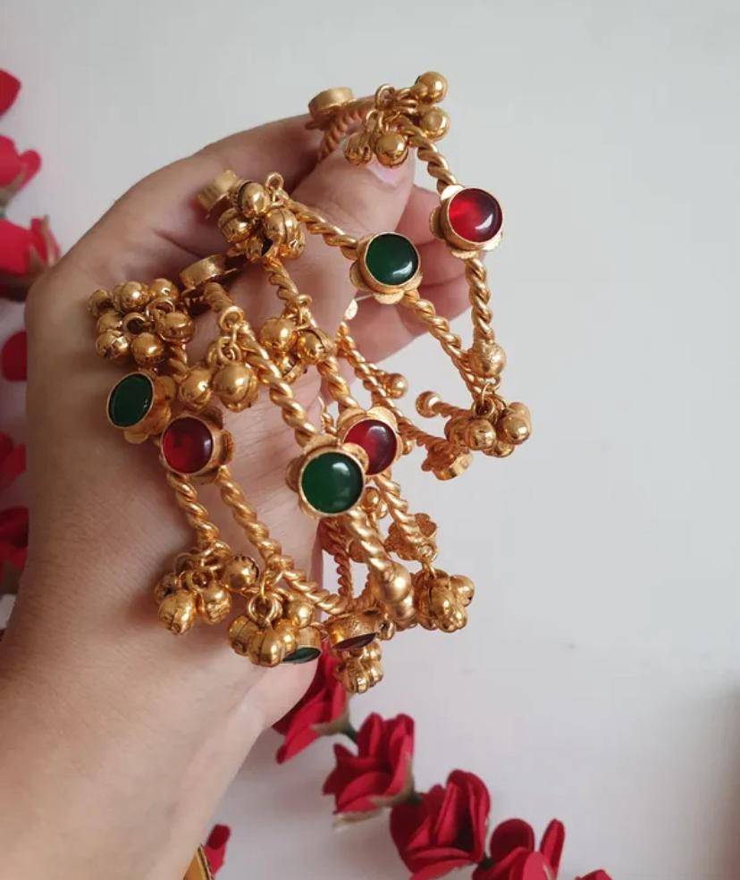 Gold-finished statement bangles from the Rajvani Ghungroo Royale Collection featuring red and emerald stone accents with bell cluster detailing. A bold festive accessory inspired by Indian heritage design.