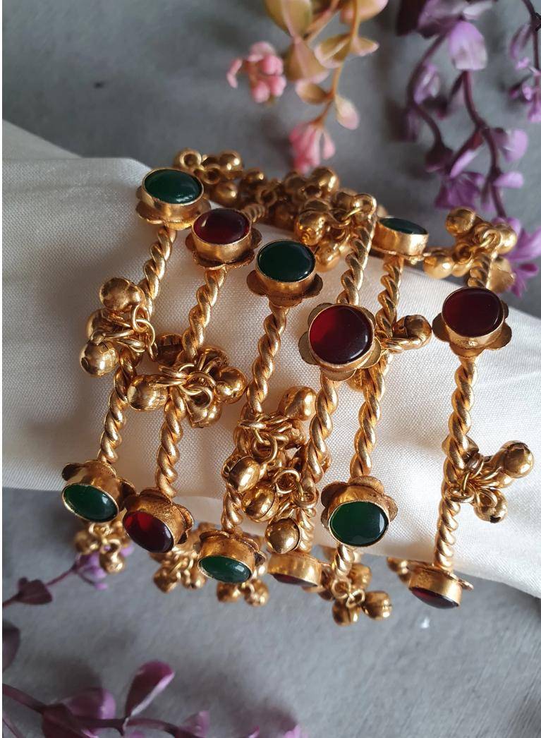 The Rajvani Ghungroo Royale Collection reflects the grandeur of traditional Indian adornment through bold craftsmanship and vibrant stone accents. These gold-finished statement bangles feature twisted rope-style metalwork adorned with ruby red and emerald green stones for a striking festive presence.