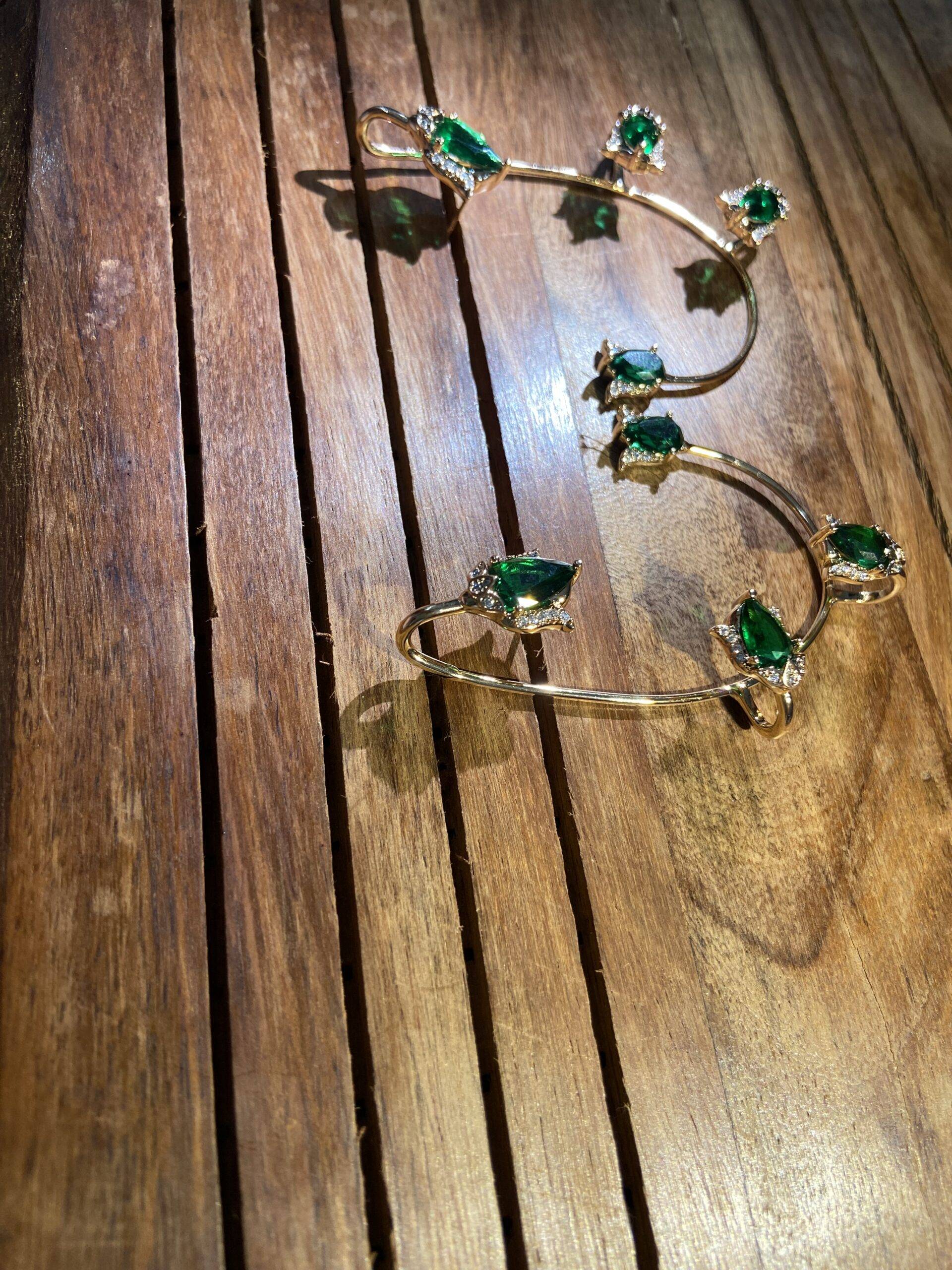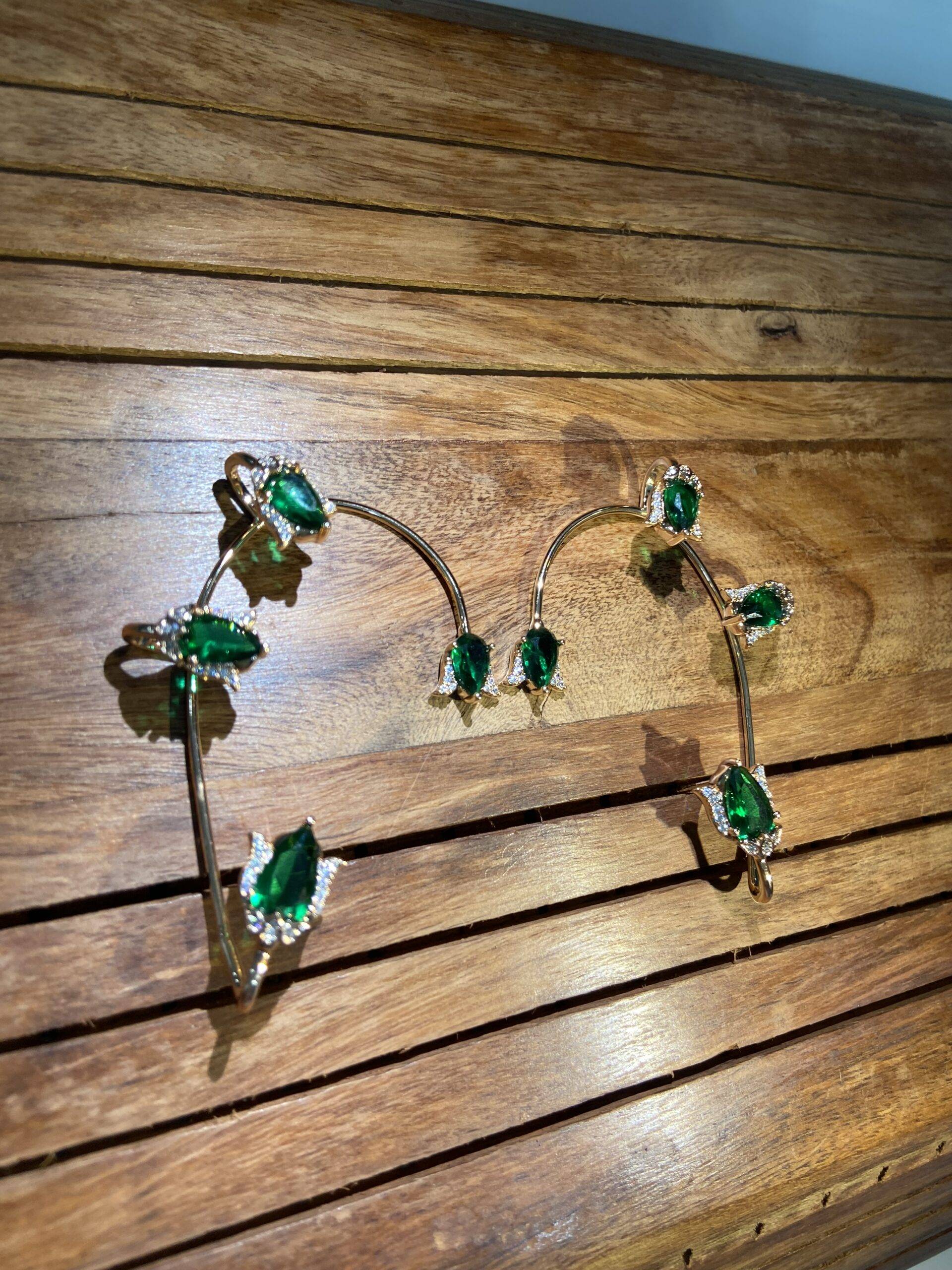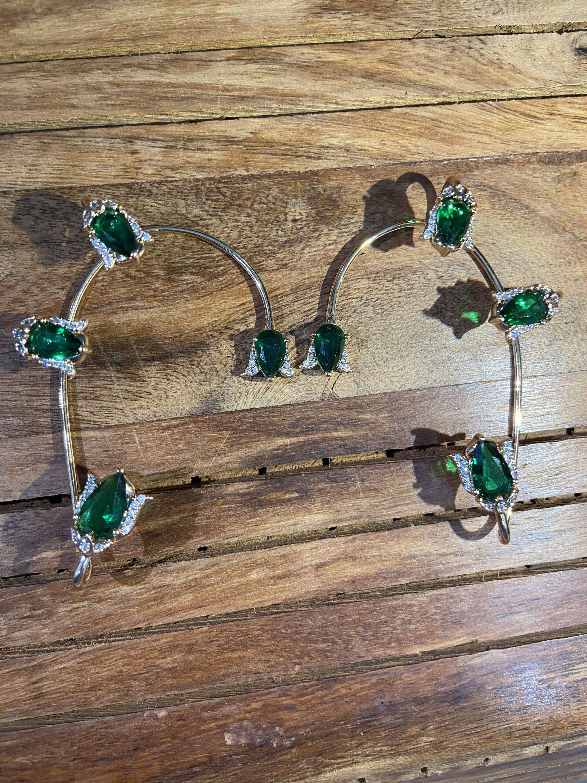 Make a bold yet refined statement with Stile Sovrano’s Regal Emerald Ear Cuffs, designed to contour the ear with sculptural grace. Each cuff features a series of oval-cut emerald green stones, framed by delicate halos of clear accents that enhance their brilliance. The gold-tone metalwork adds warmth and richness, while the mirrored design offers balance and symmetry. Perfect for festive occasions, bridal styling, or elevated everyday wear, these cuffs blend heritage-inspired luxury with modern edge—crafted for comfort, impact, and unmistakable elegance.