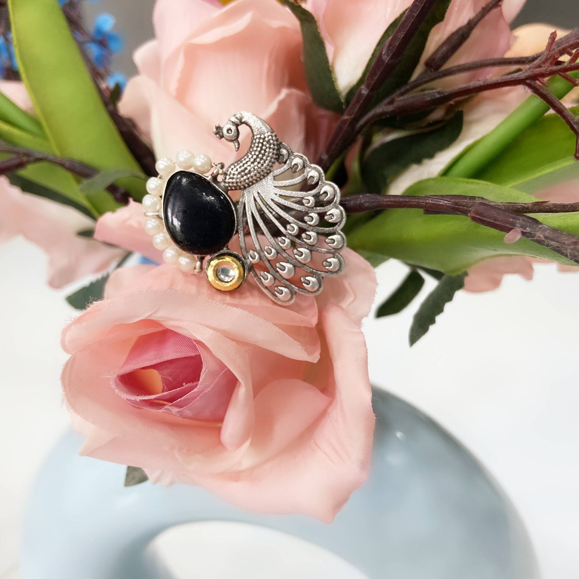 A majestic oxidized silver peacock ring with a glossy black stone, pearl detailing, and golden accent—crafted to evoke regal charm for festive and statement wear.
