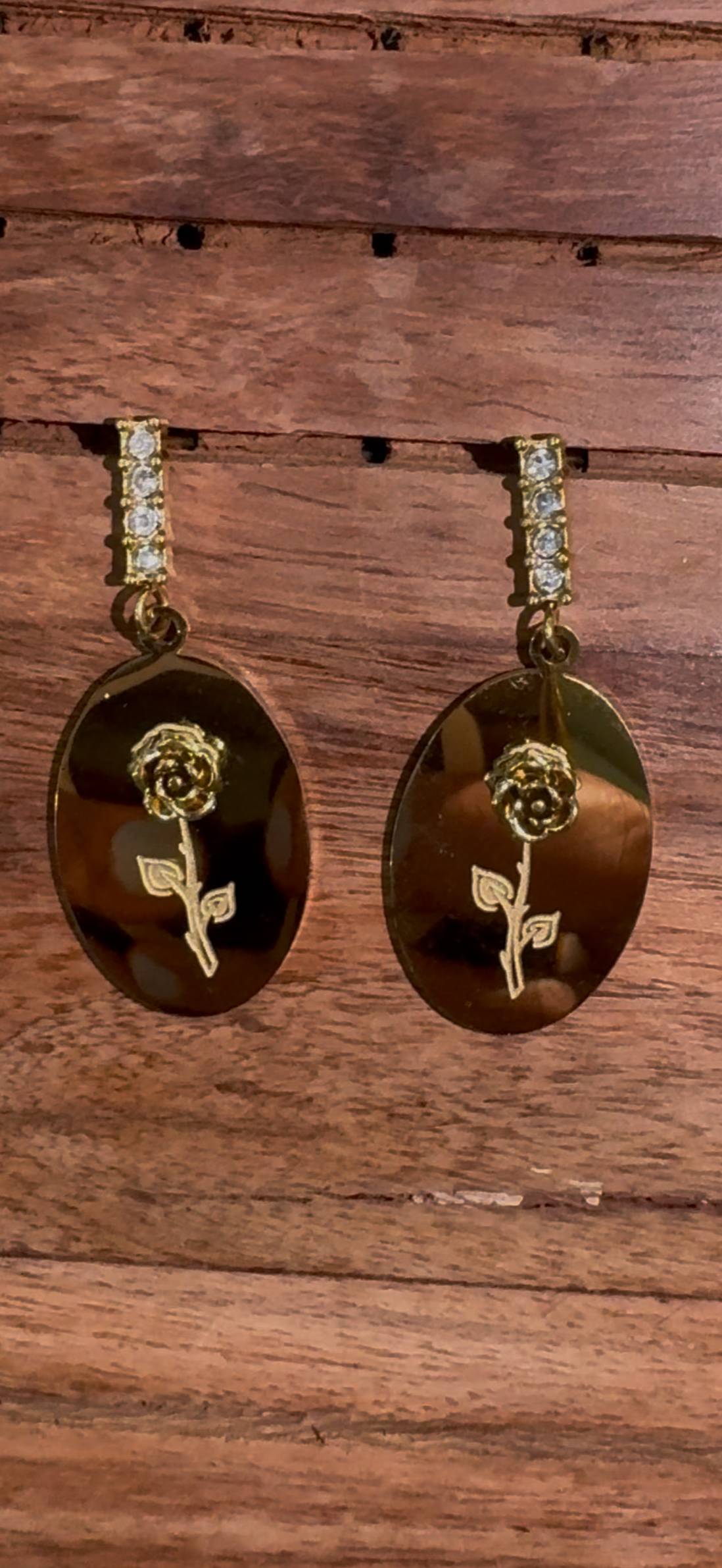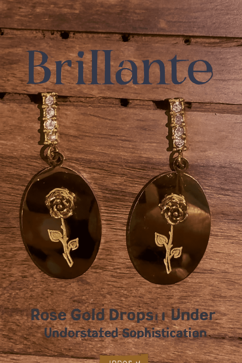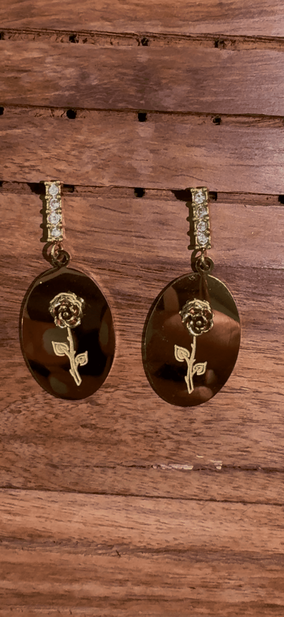 Elevate your everyday elegance with these rose gold drop earrings, featuring a vertically set row of clear gemstones that lead to an oval pendant engraved with a delicate blooming rose. The polished finish and subtle sparkle make them ideal for understated sophistication—perfect for boardrooms, brunches, and beyond.