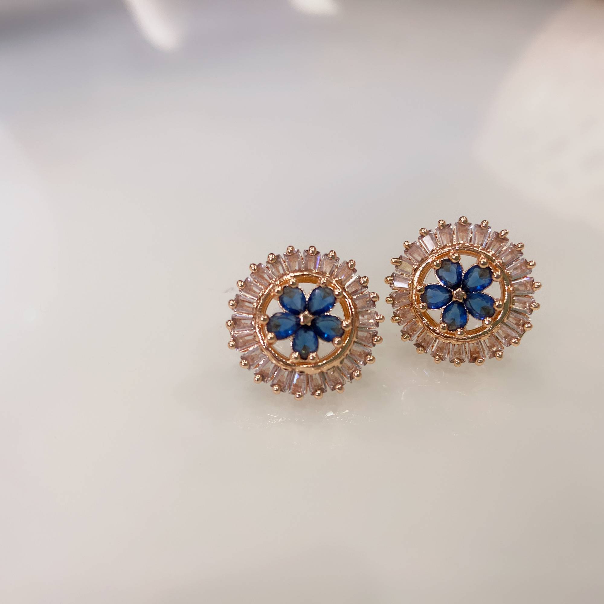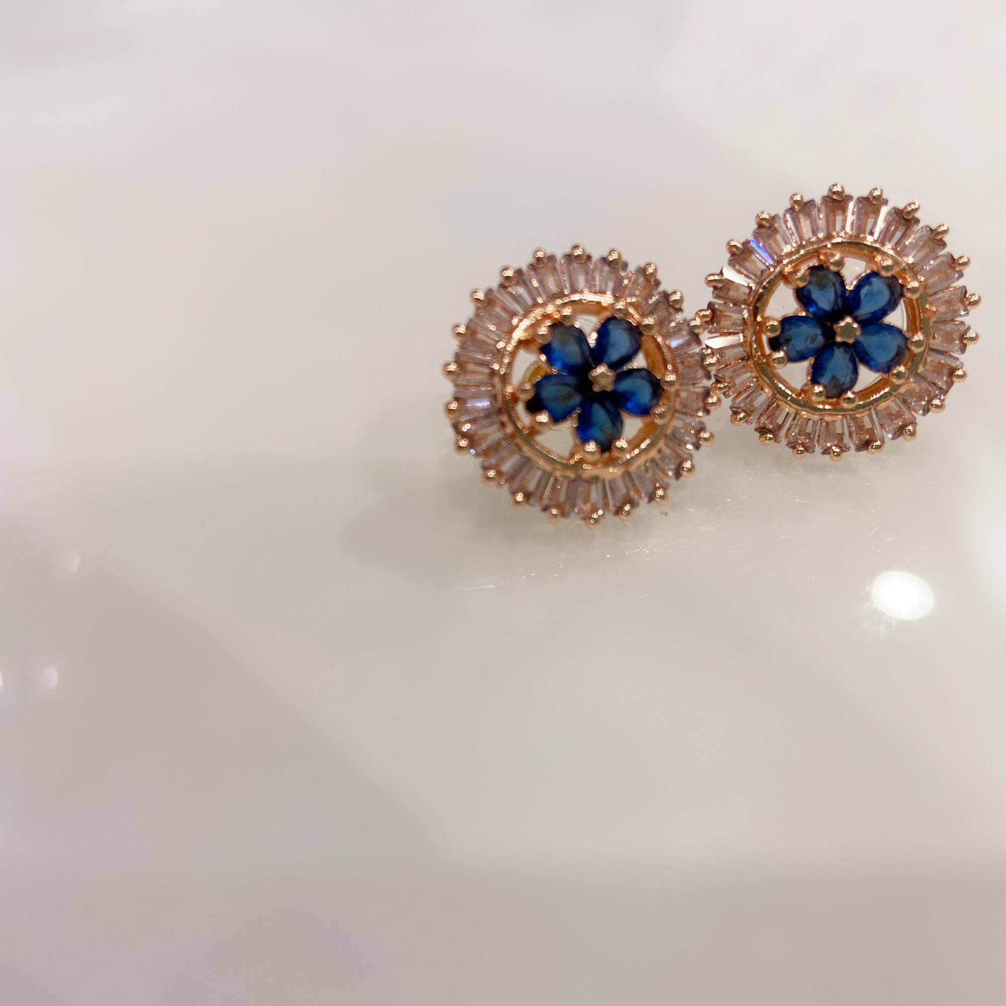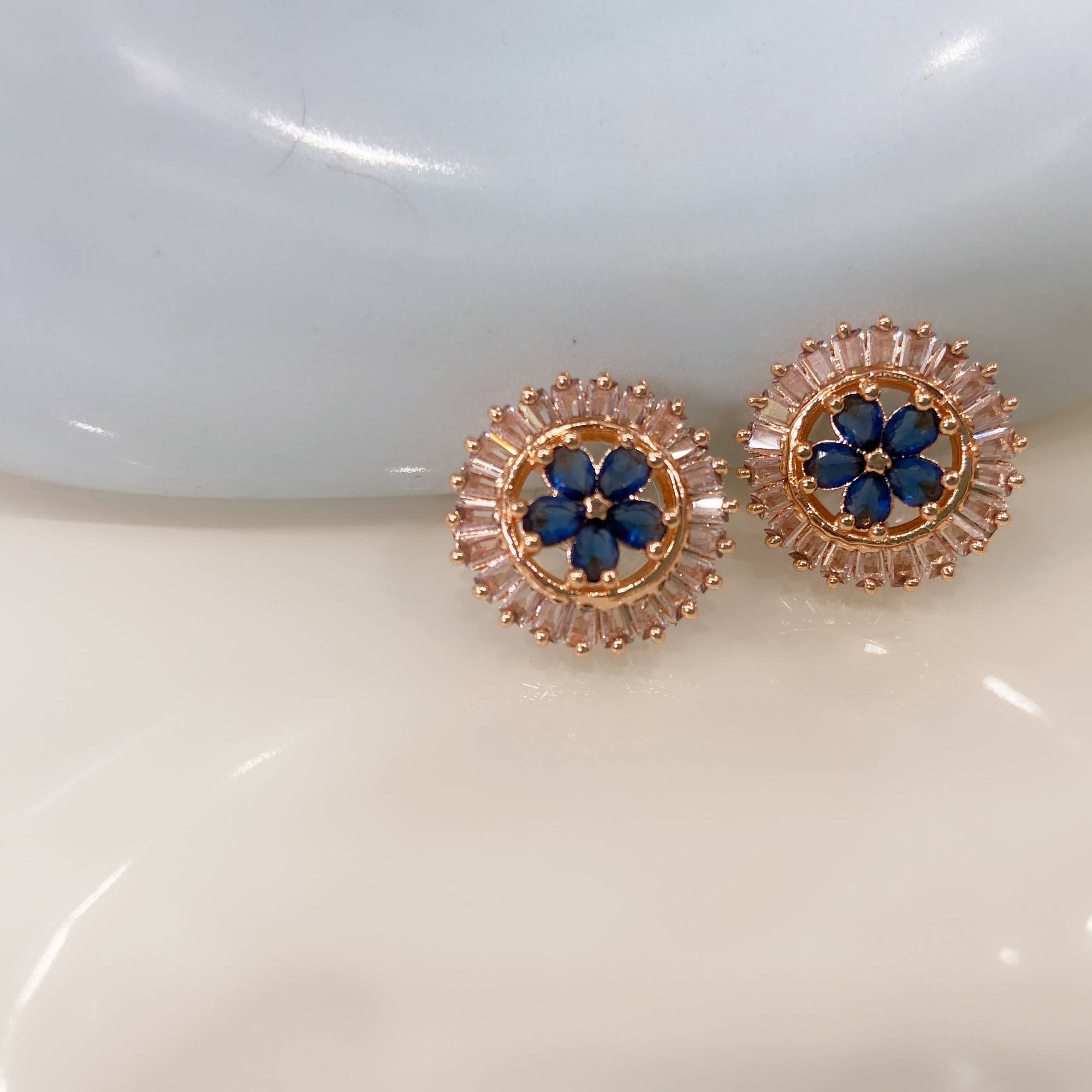 Regal rose gold studs with sapphire-blue floral centers and a halo of white ADs—crafted to exude timeless elegance and festive sophistication.