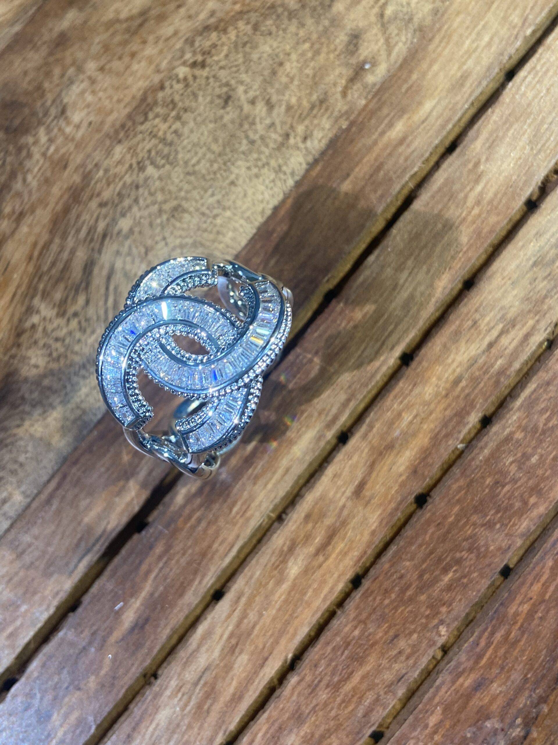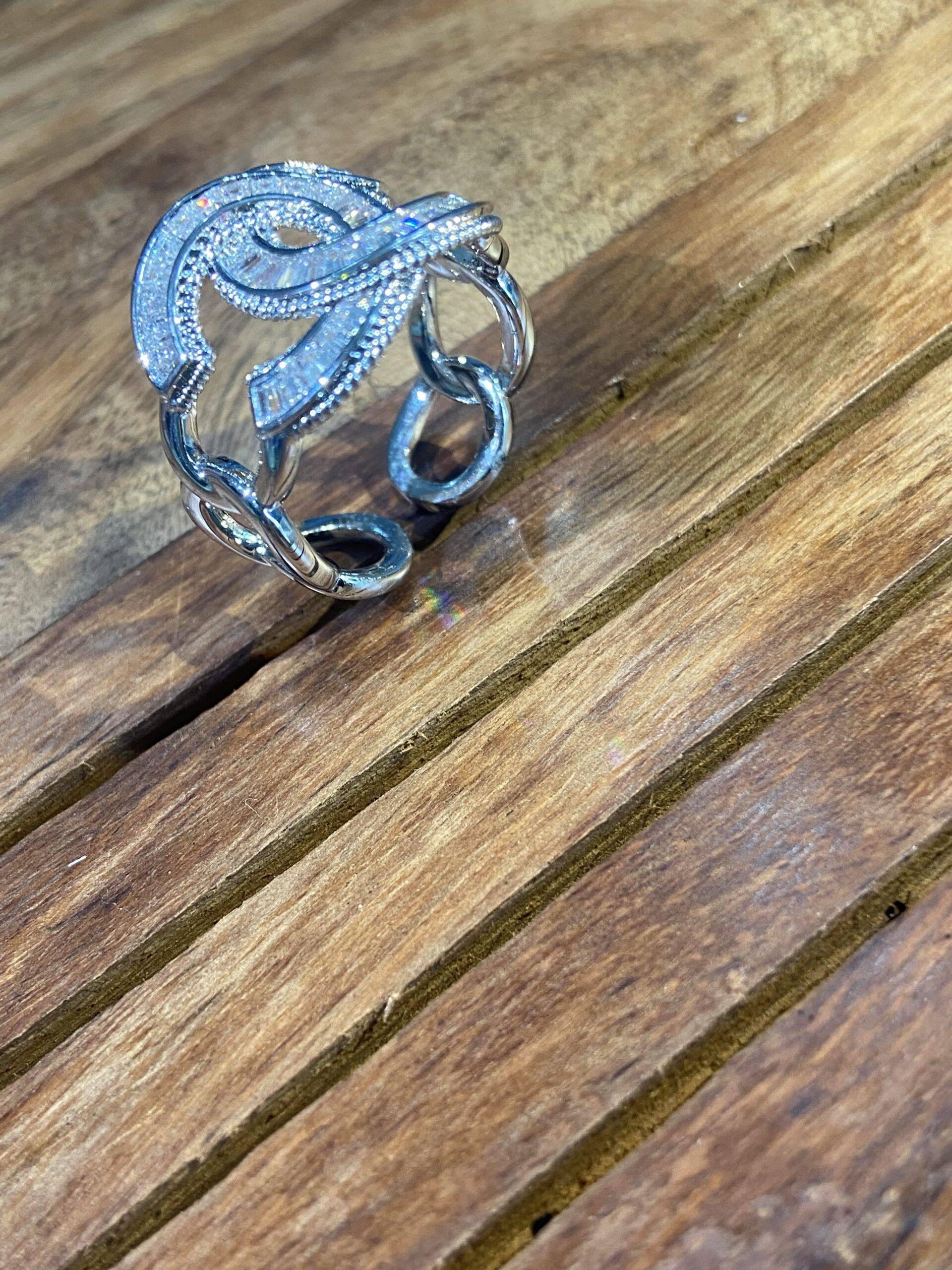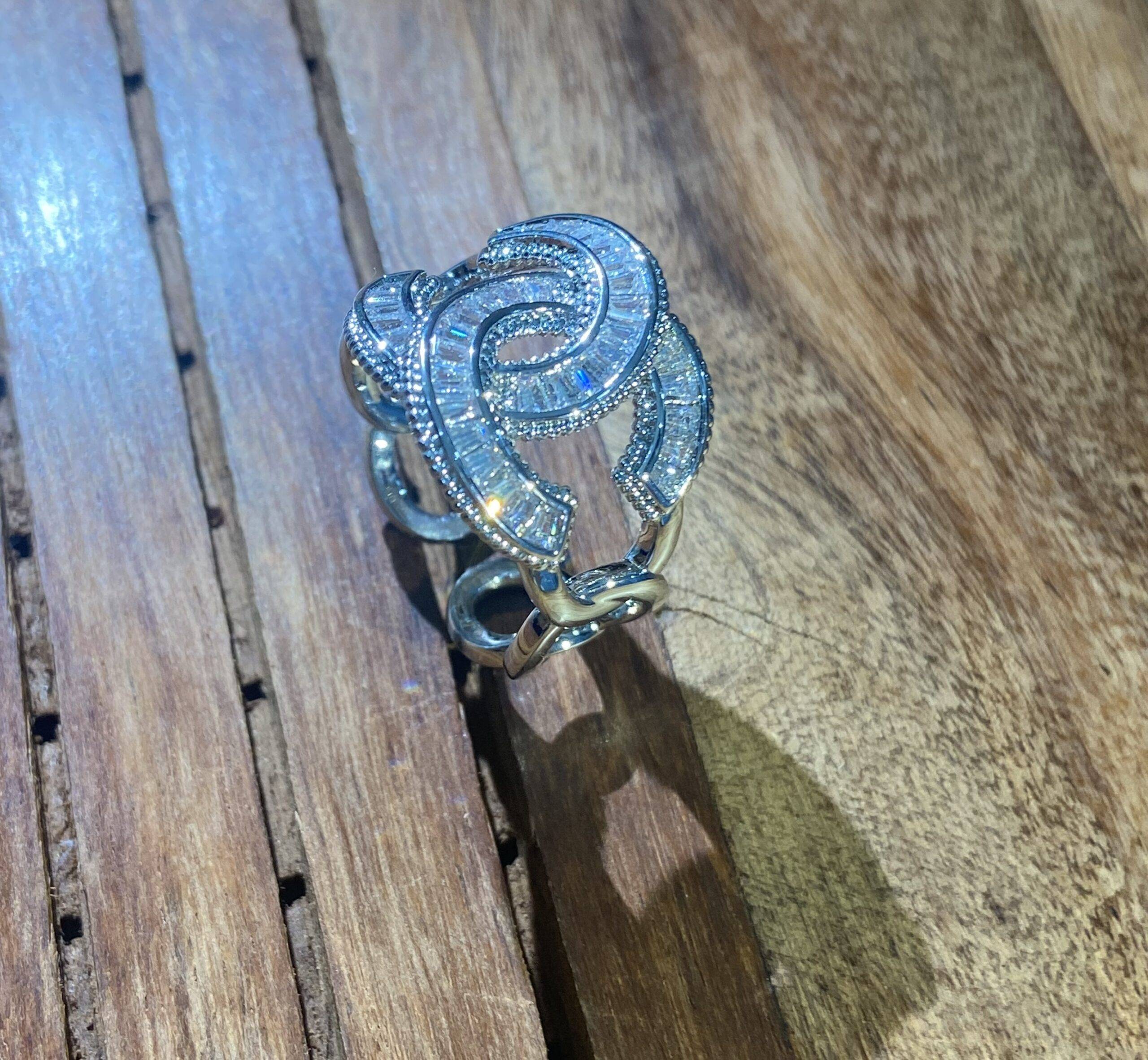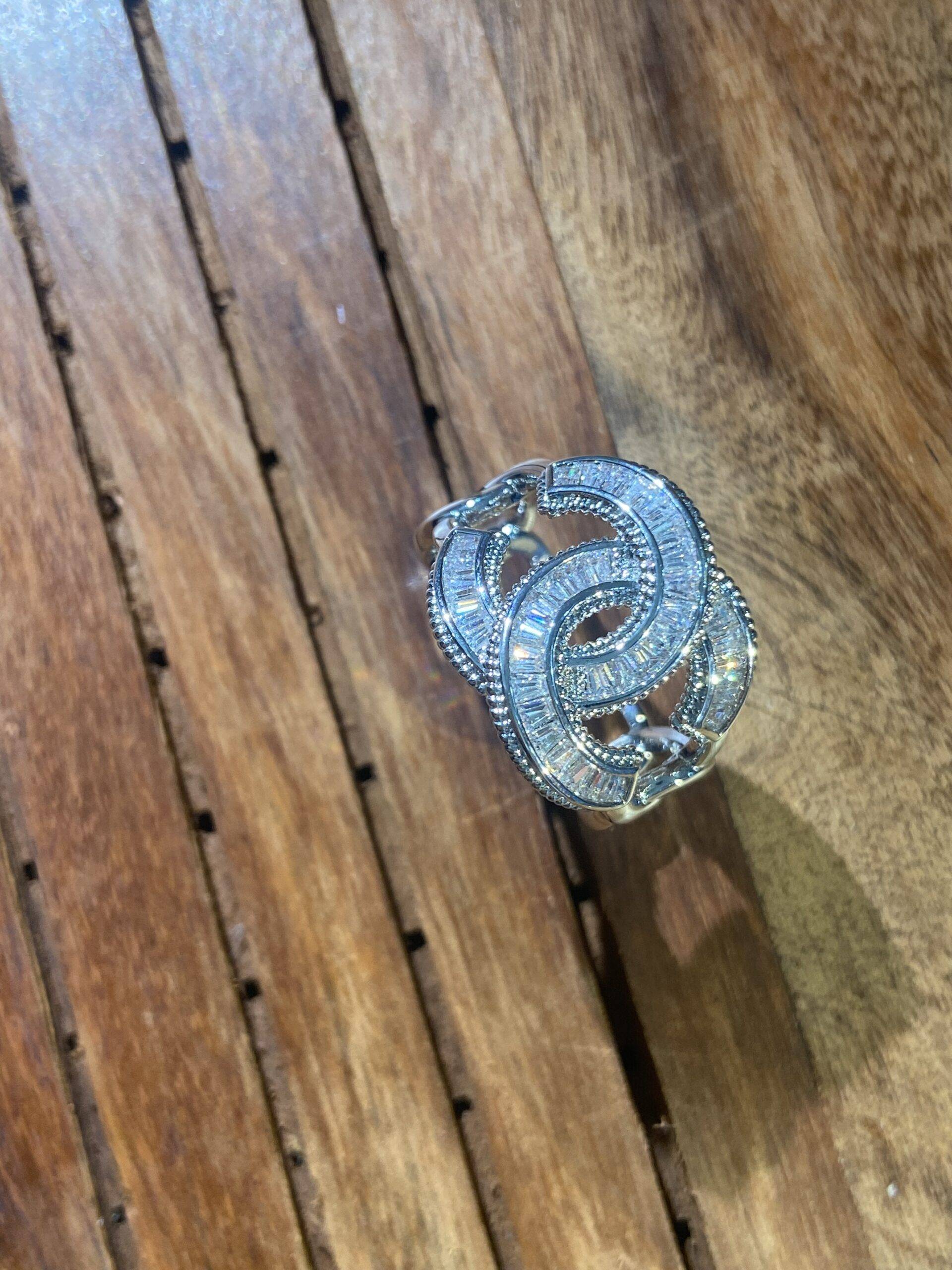 Gracefully entwined—the Spirali Serena ring by Stile Sovrano features interlocking loops in polished silver-toned metal, adorned with a continuous row of baguette-cut clear stones. This sculptural design offers timeless elegance and radiant sparkle, ideal for bridal styling, cocktail wear, or gifting with refined charm.