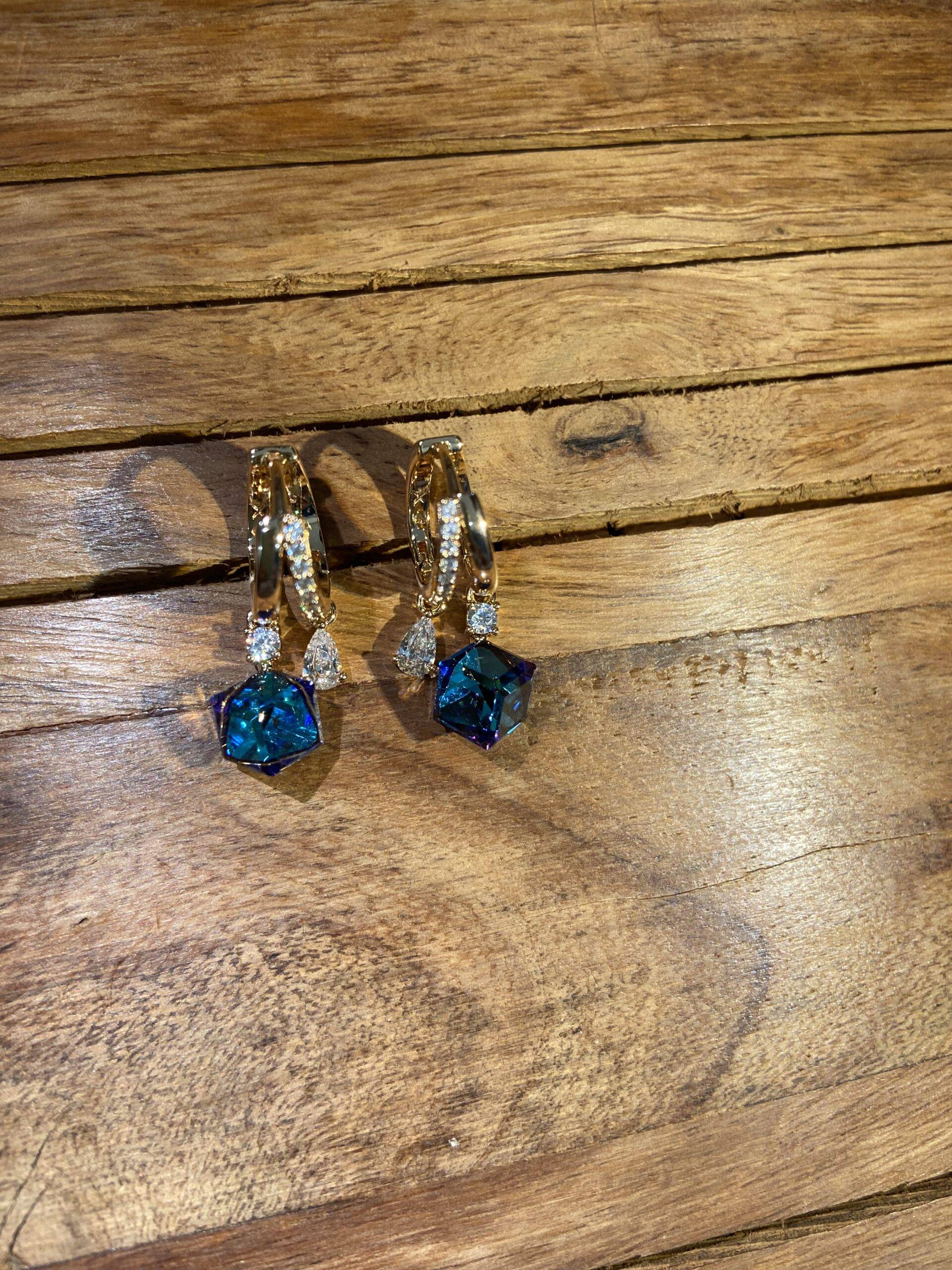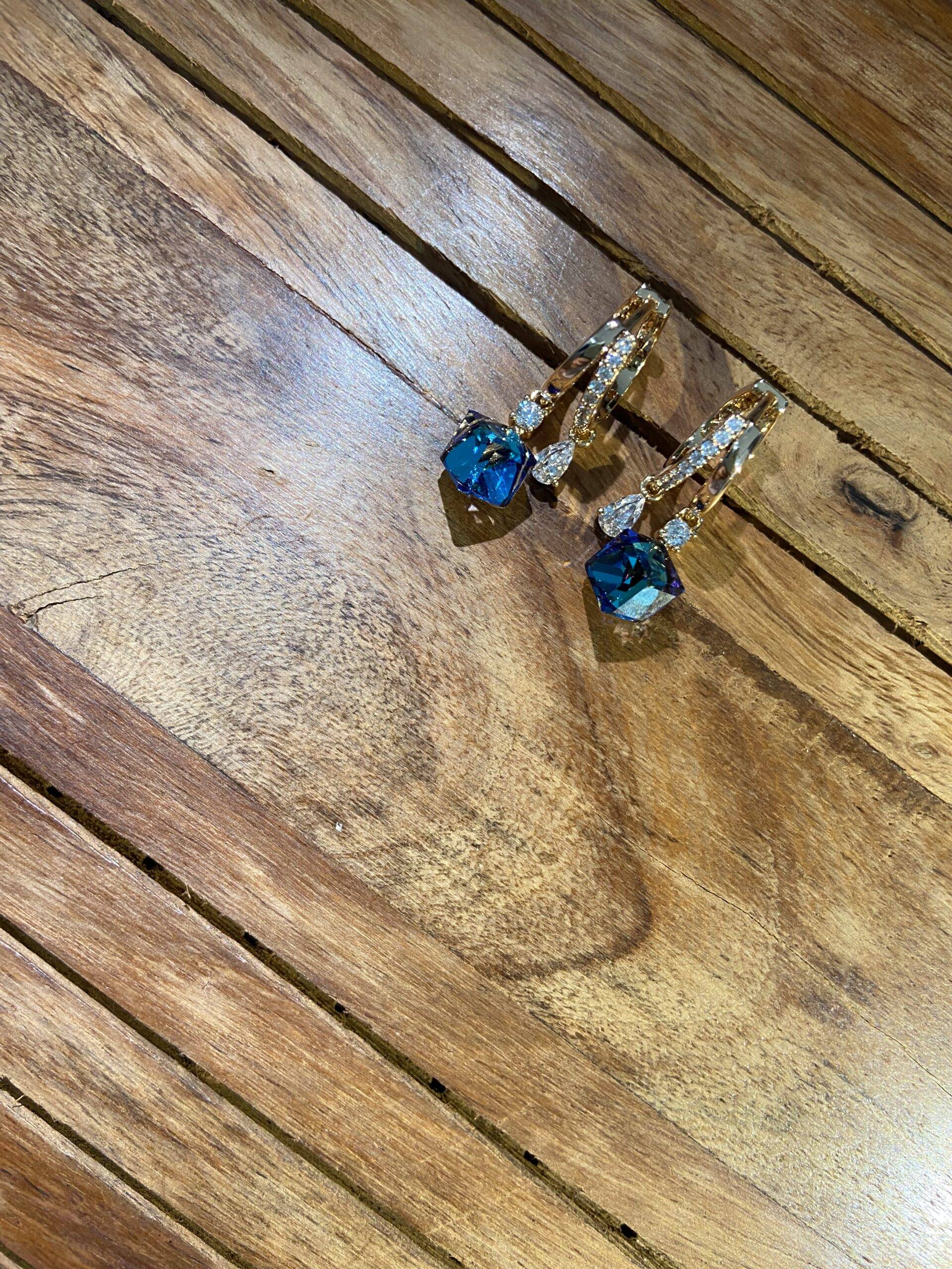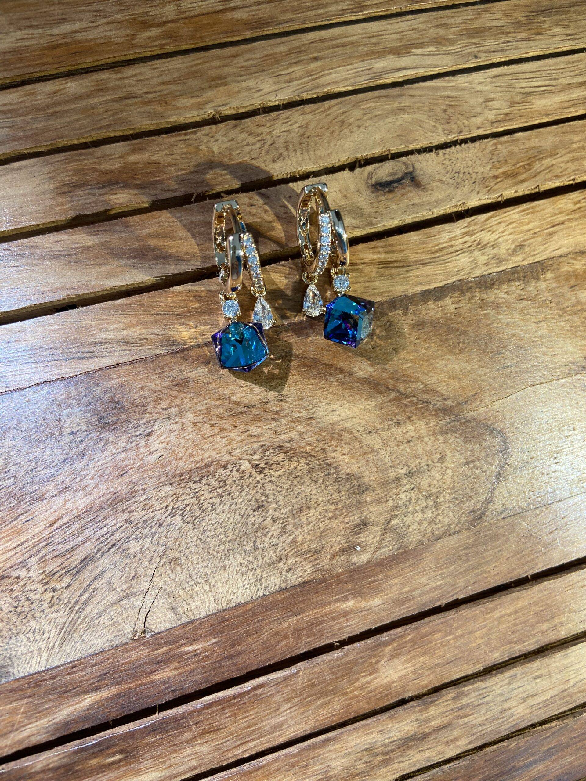 Starlight Prism Hoop Earrings offer celestial elegance, designed with sturdy gold-tone huggie hoops. Each earring features cube-cut twilight blue gemstones that refract light with a mesmerizing prism effect. Adorned with pavé accents, these earrings blend modern luxury with heritage-inspired craft. Versatile enough for festive wear, evening glamour, or elevating daily style, they reflect fine imitation jewellery artistry with a focus on depth, dimension, and sophistication.