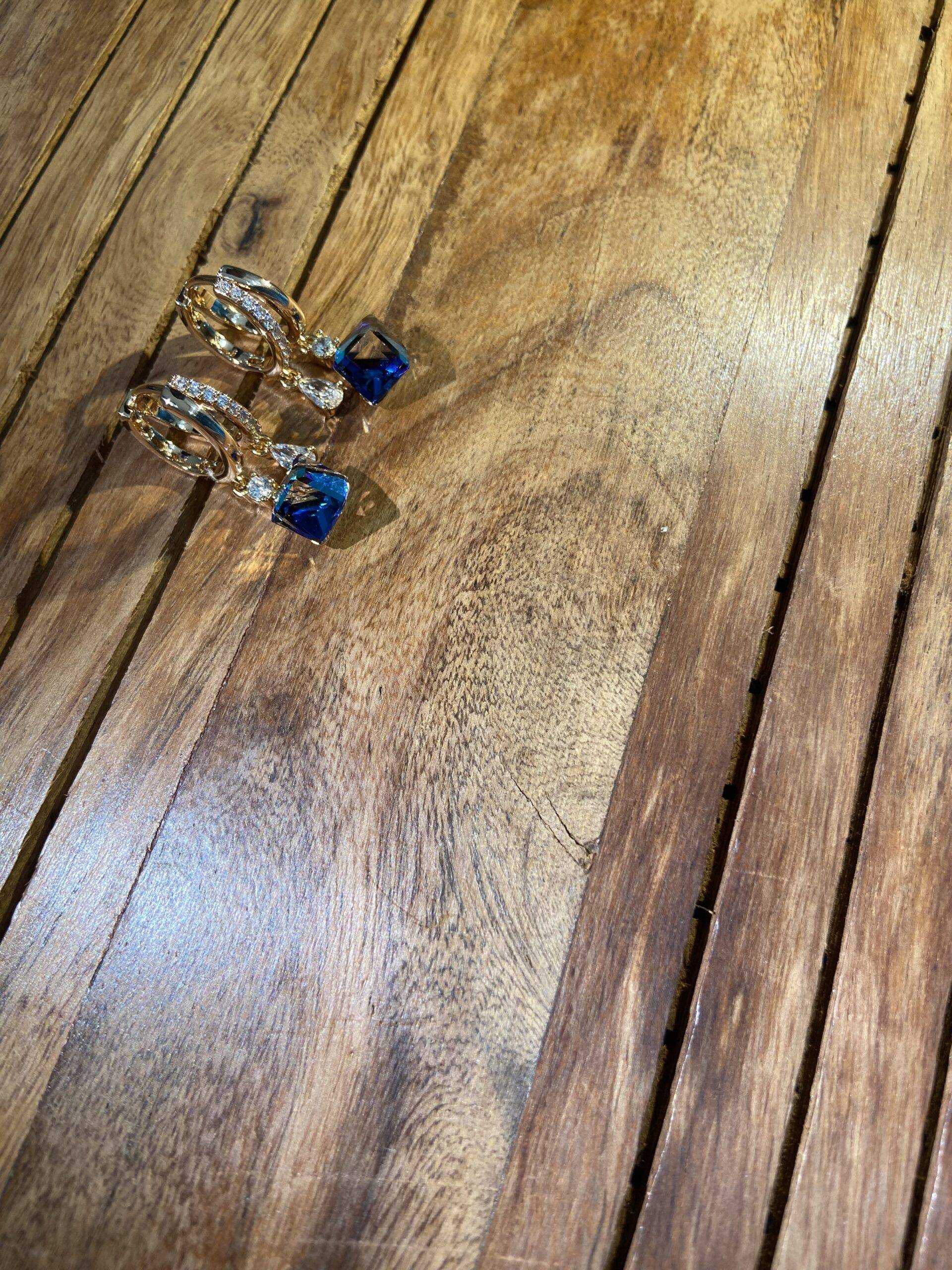 Gold huggie hoops with cubic blue gemstones and pavé accents for celestial allure.