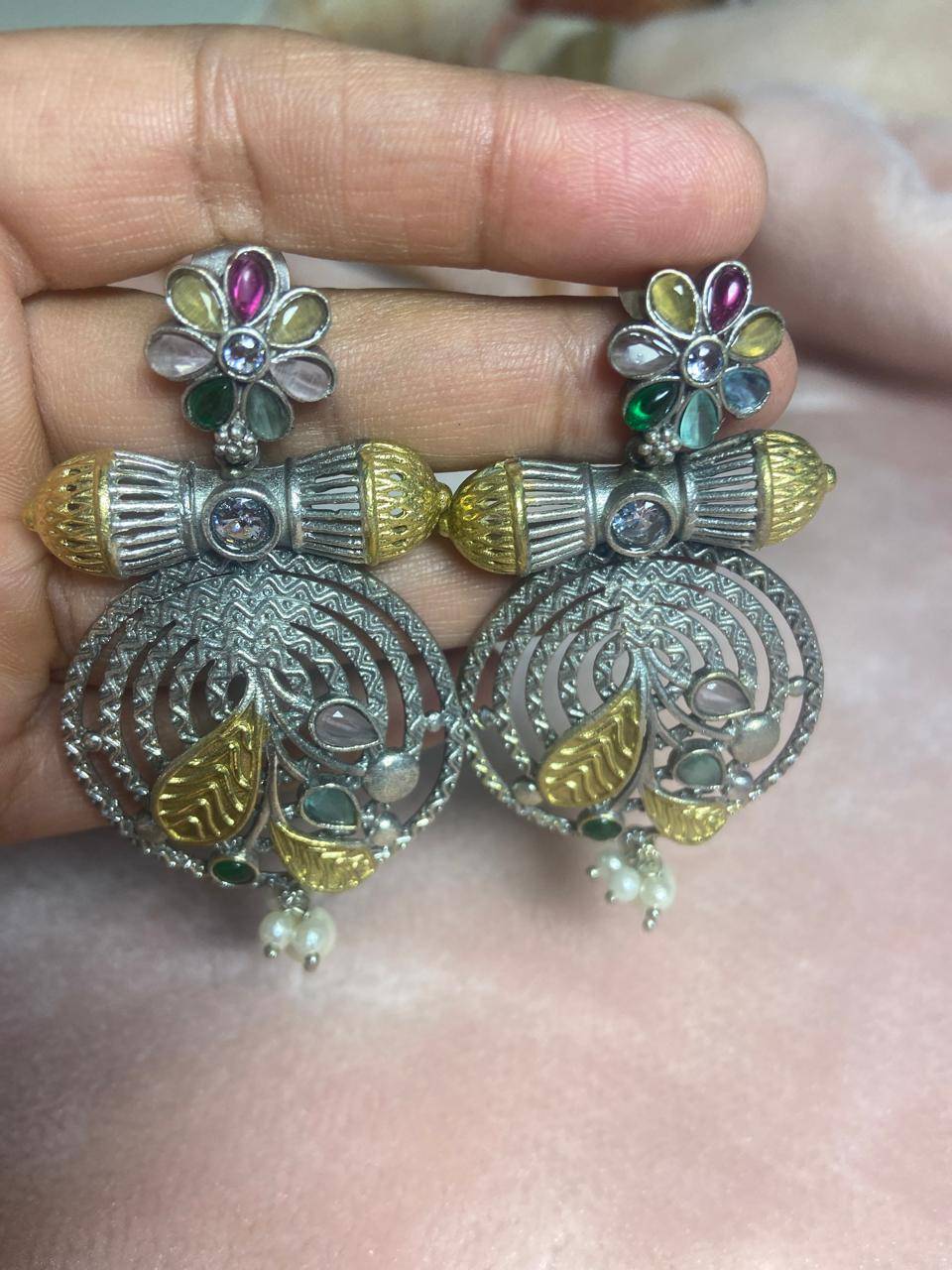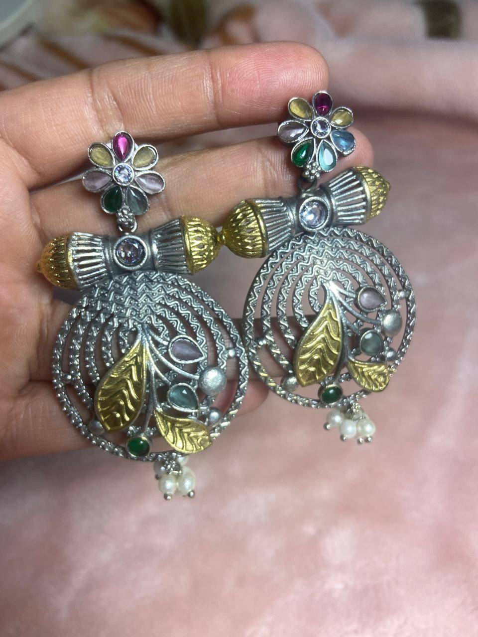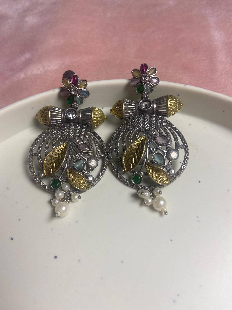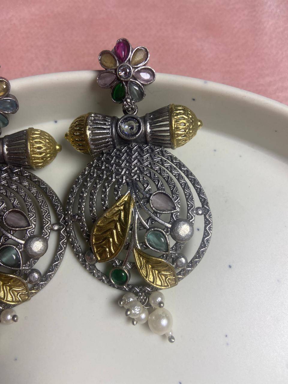 Suvarna Pushpa Kashmiri Statement Earrings with Multicolor Stones & Pearl Drops | Heritage Ethnic Jewelry for Women