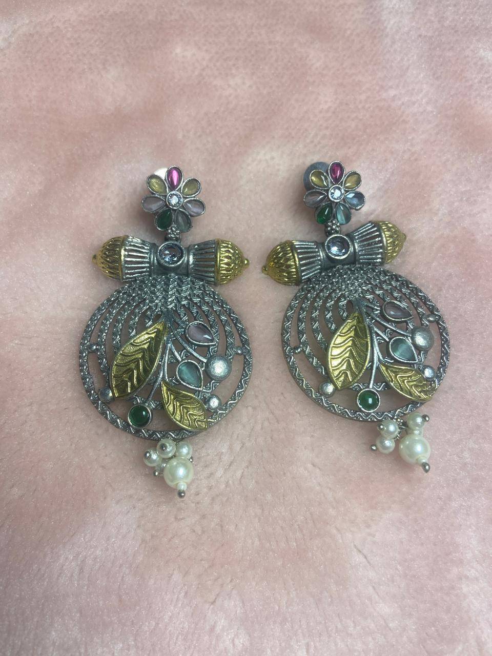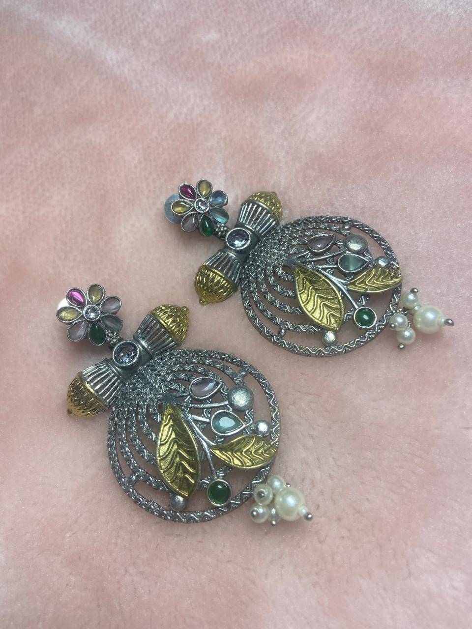 Rooted in classical Indian ornamentation, the Stile Sovrano Suvarna Pushpa Statement Earrings celebrate heritage craftsmanship through floral symbolism and traditional form. The circular openwork structure is adorned with multicolor stone florals, representing prosperity and elegance, while gold-toned accents enhance the regal appeal. Pearl drops add soft movement to the design, balancing the bold silhouette with refined grace. Despite their statement presence, the earrings are designed for comfortable wear during long festive celebrations. Perfect for weddings, festivals, and traditional gatherings, this design is crafted for women who value Indian heritage aesthetics with a sophisticated, timeless finish.